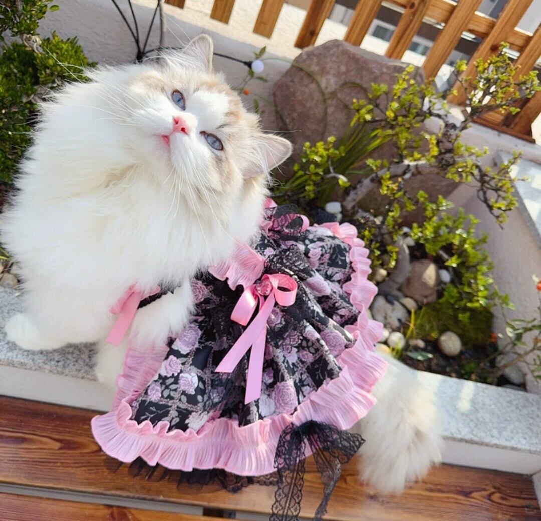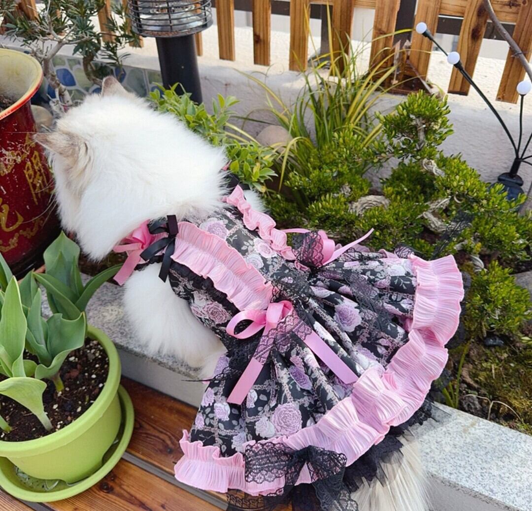 ピンクリボンとピンクフリルがキュートで、尚且つピンクローズプリントのブラック生地がエレガントなショートドレス♡フリルもボリューミーです。