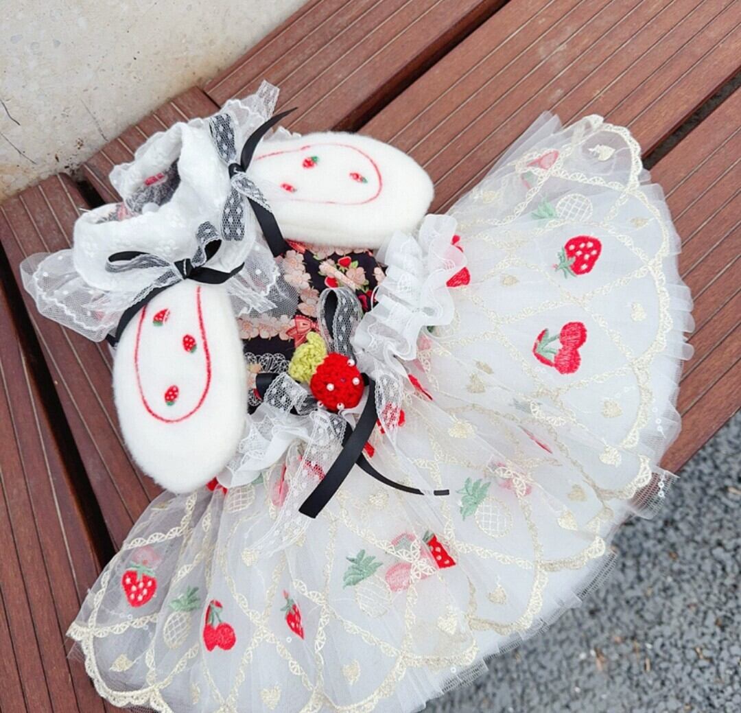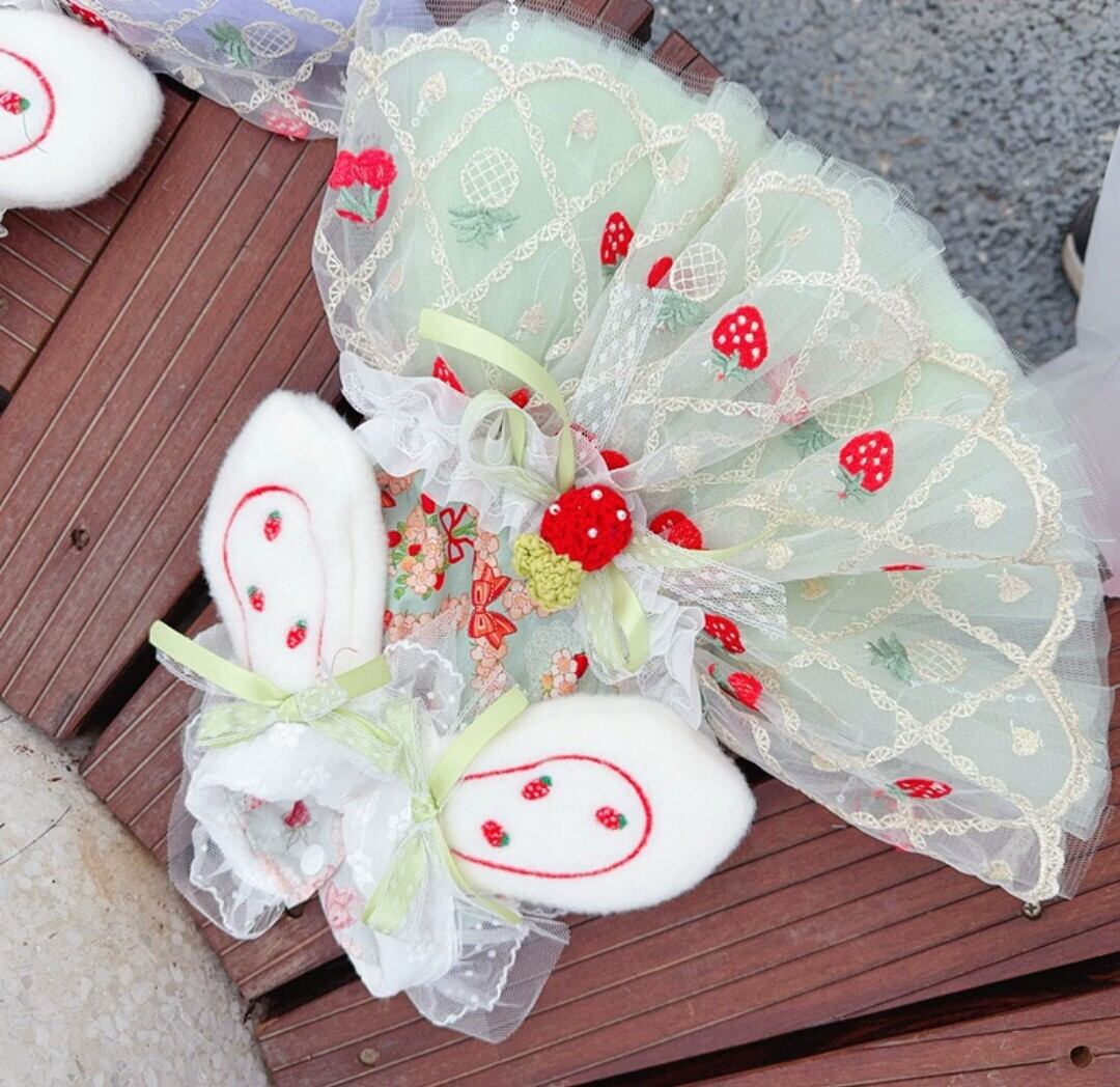 腰にも苺モチーフ、苺柄のうさ耳も可愛い春夏のフルーツ刺繍のドレス♡