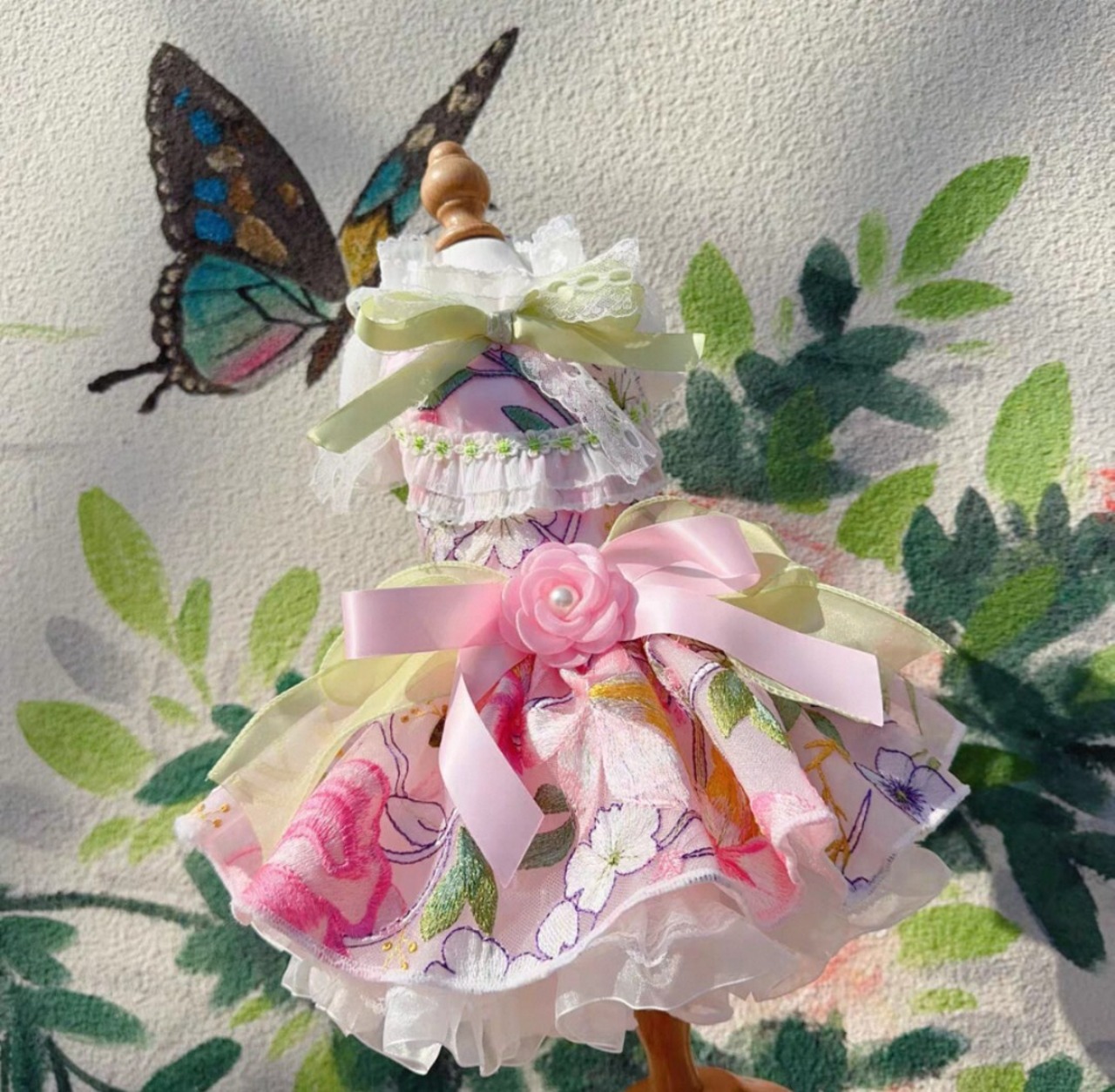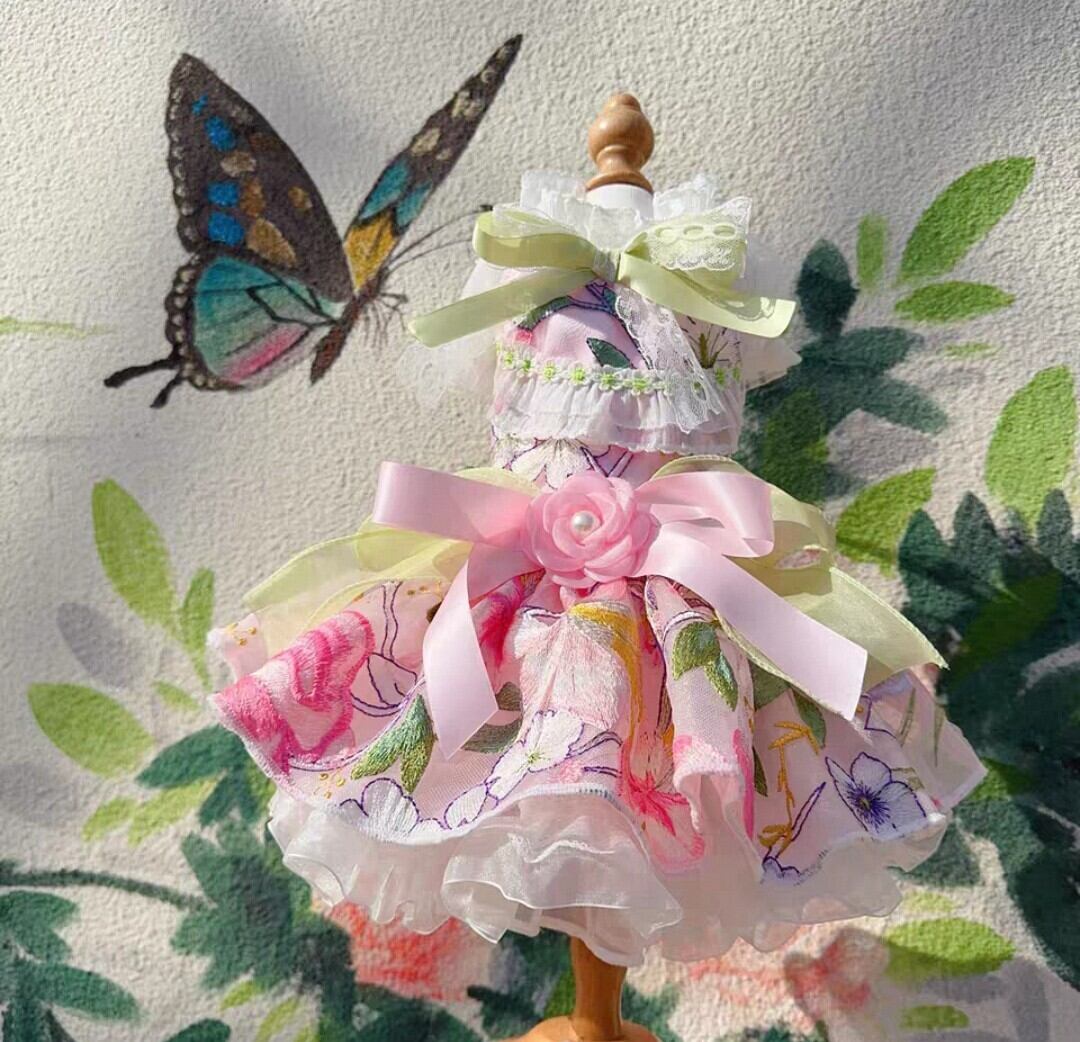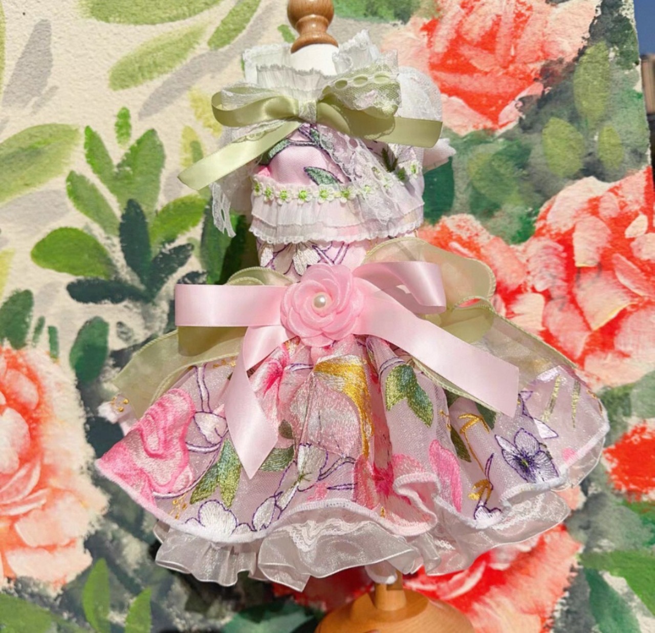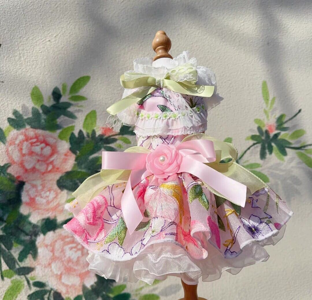 【予約商品】グリーン&ピンクリボンのボタニカル刺繍ドレス