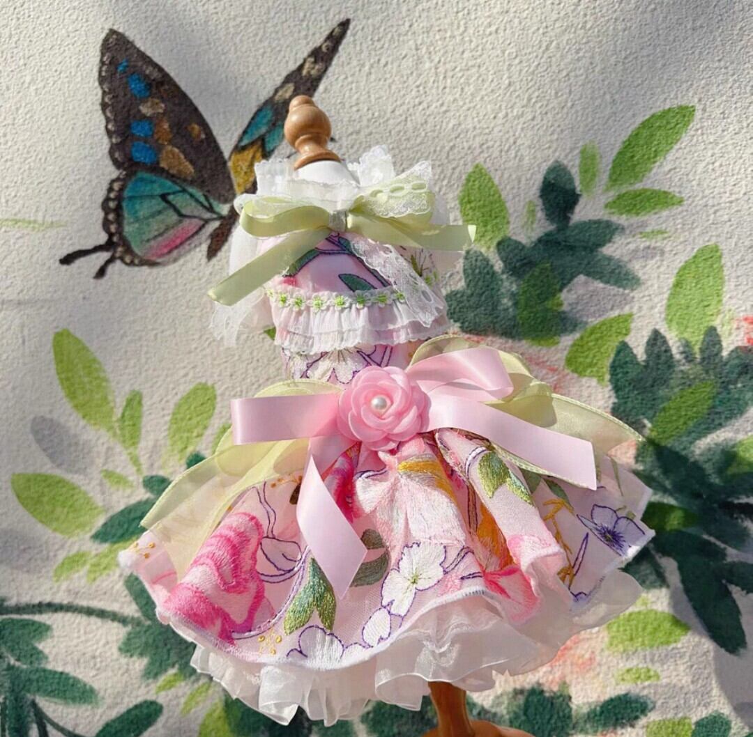 グリーン&ピンクのリボンが可愛い、ボタニカル柄の刺繍生地のショートドレス♡色とりどりのボタニカル柄刺繍が豪華です。