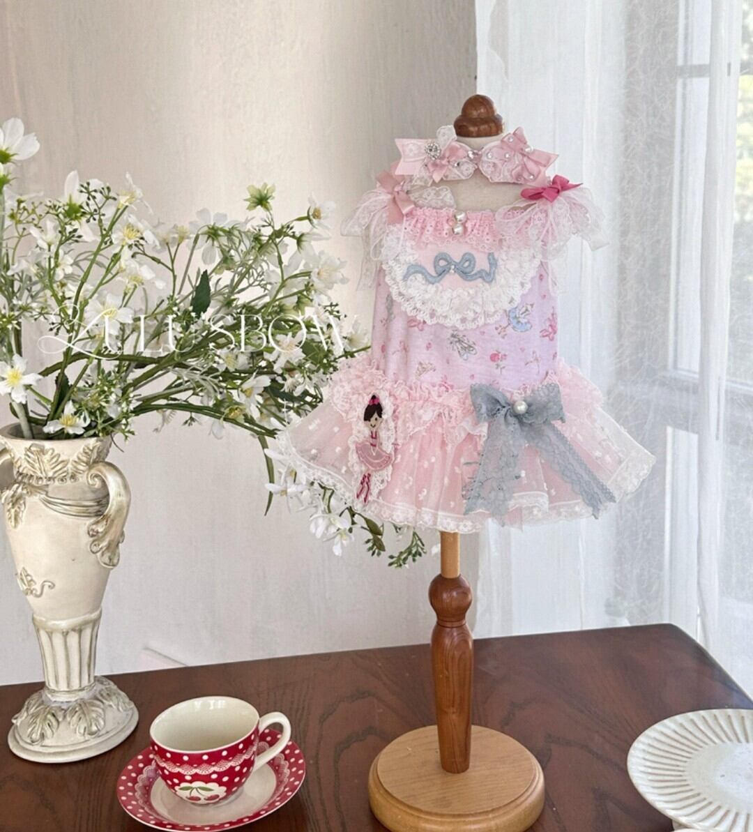 バレエシューズやリボンなどのプリント生地に、お洒落なレースやリボンなどがあしらわれたラブリーピンクのドレスワンピース♡