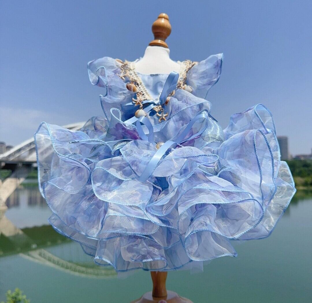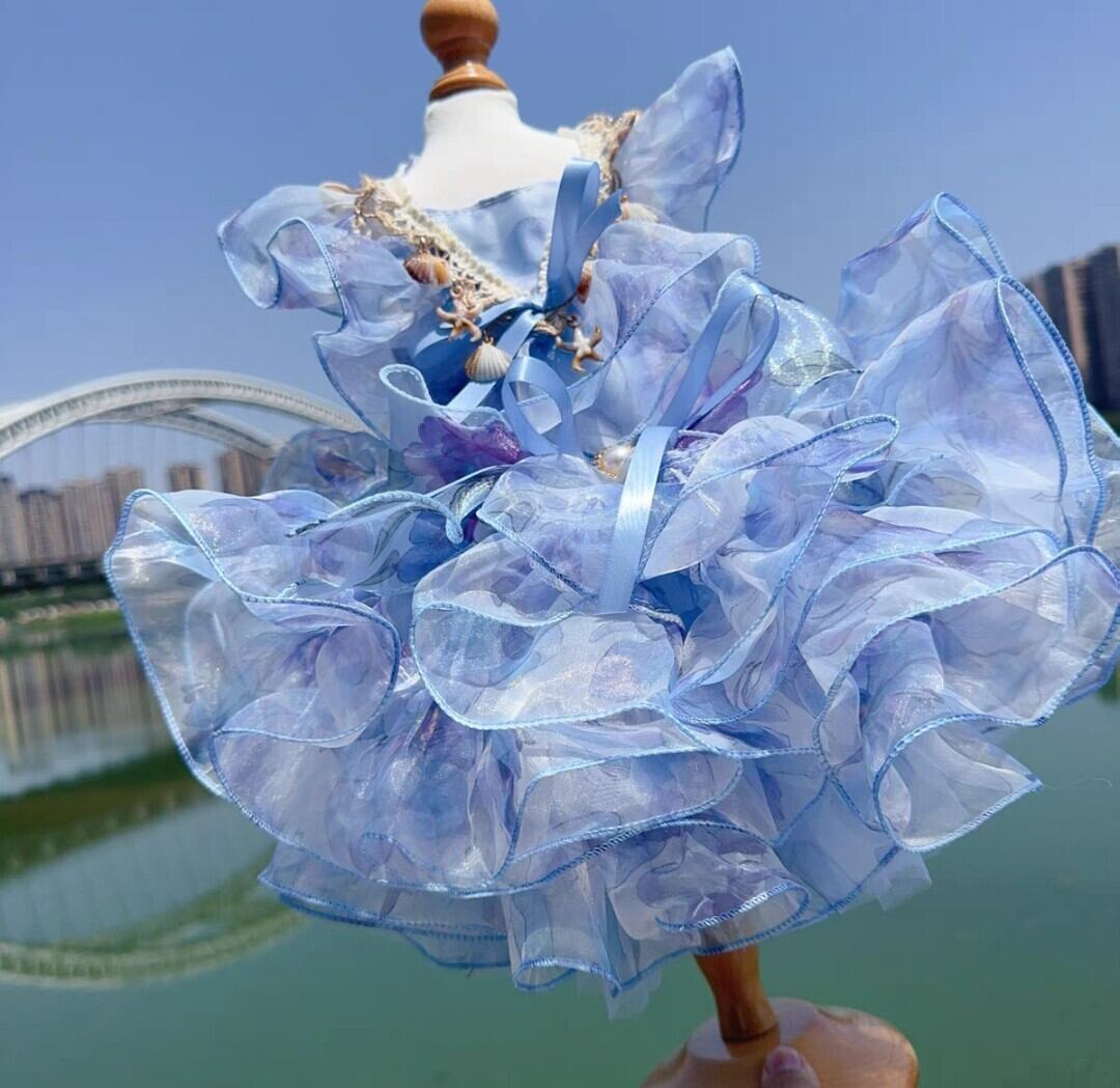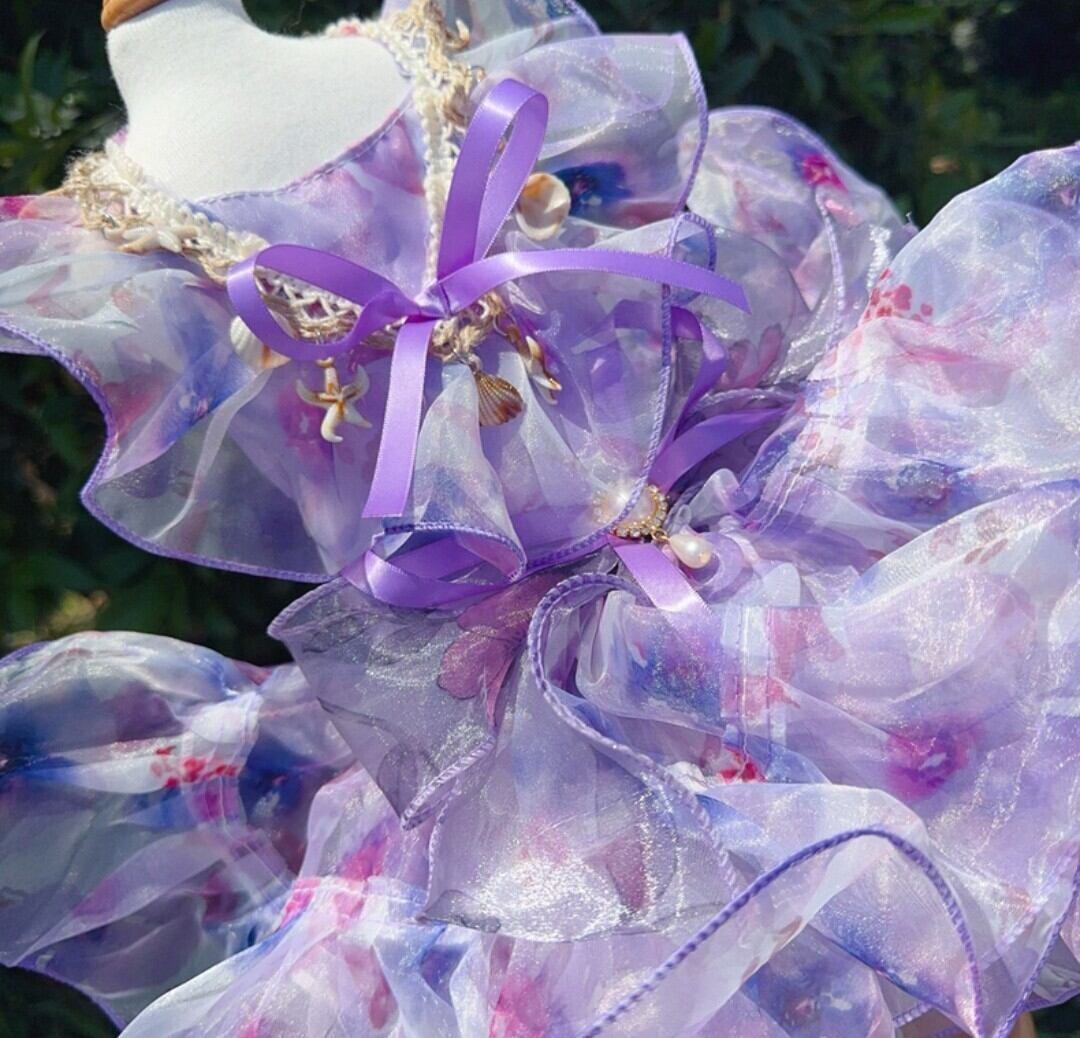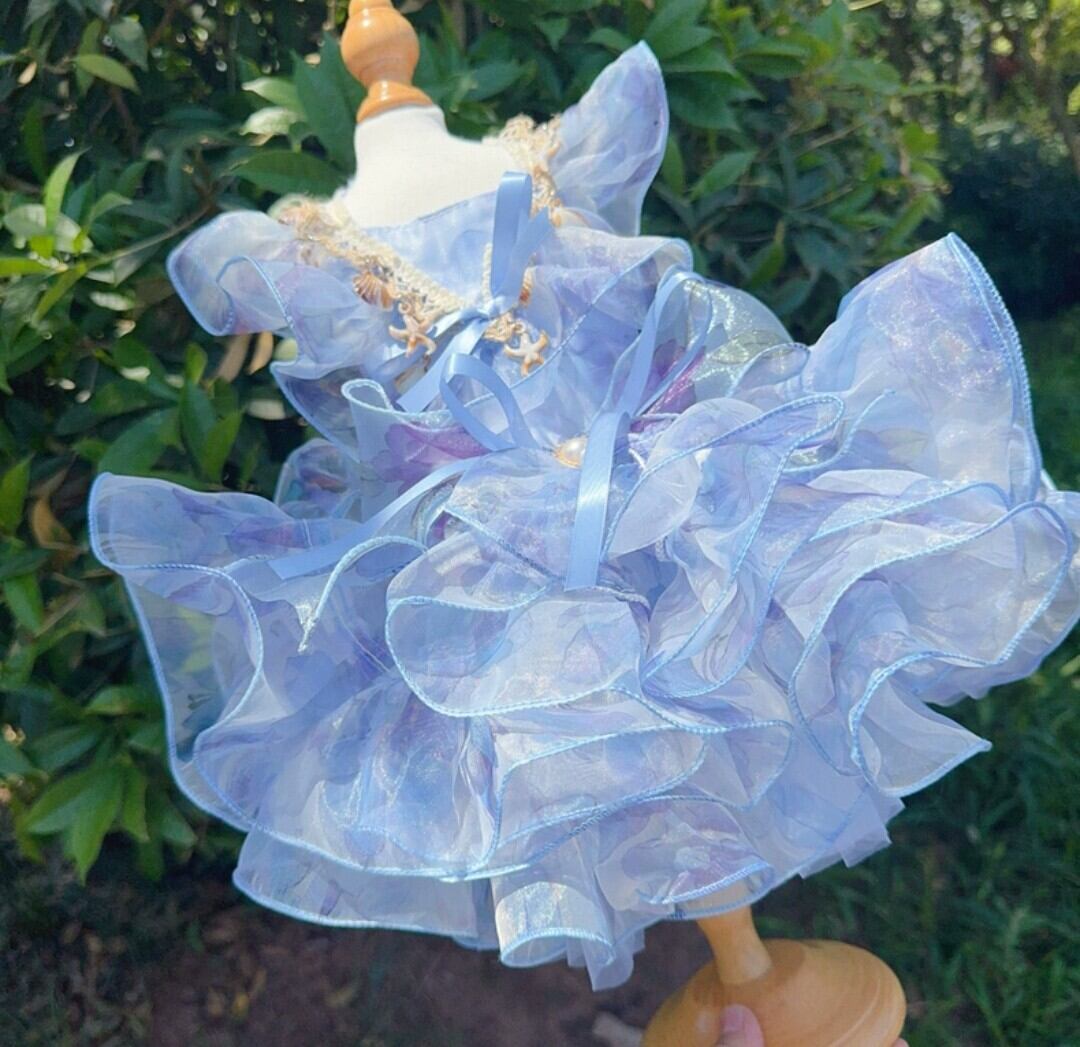 肩から背中にかけてシェル(貝殻)飾りがほどこされたふんわりフリルのショートドレス♡