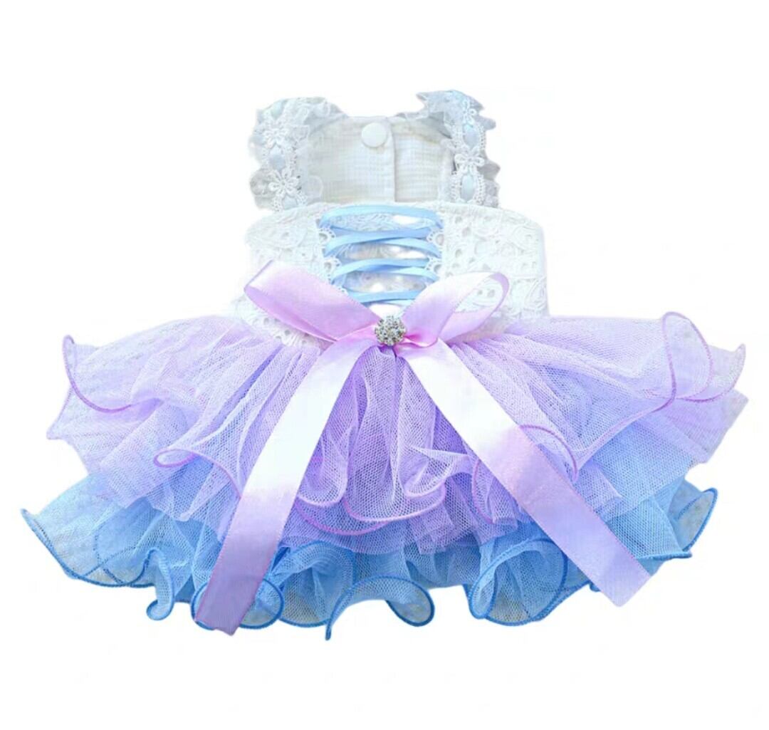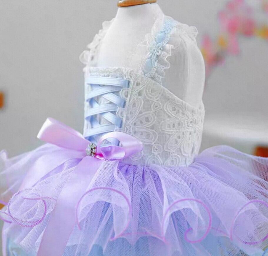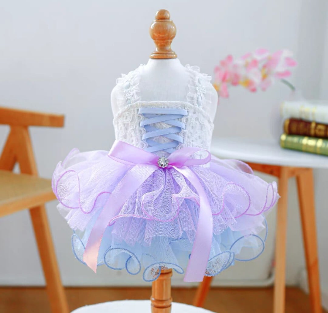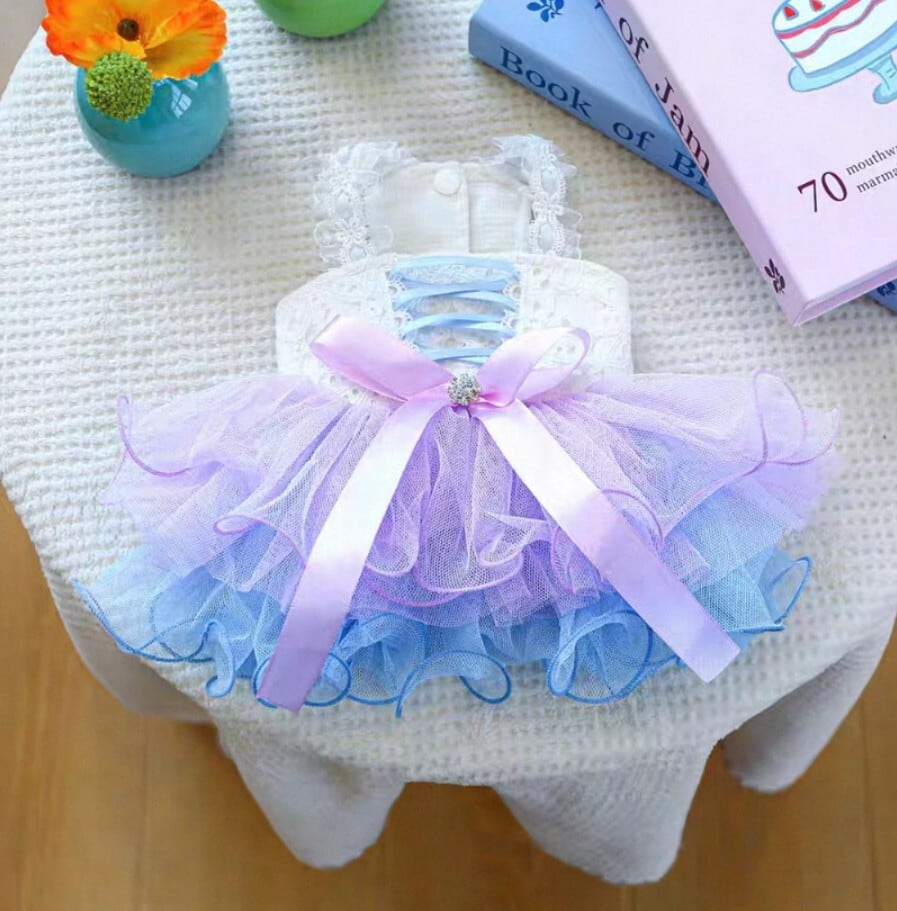 パープルとブルーのフリルがエレガント。背中のクロスリボンも可愛いらしいサマードレス♡