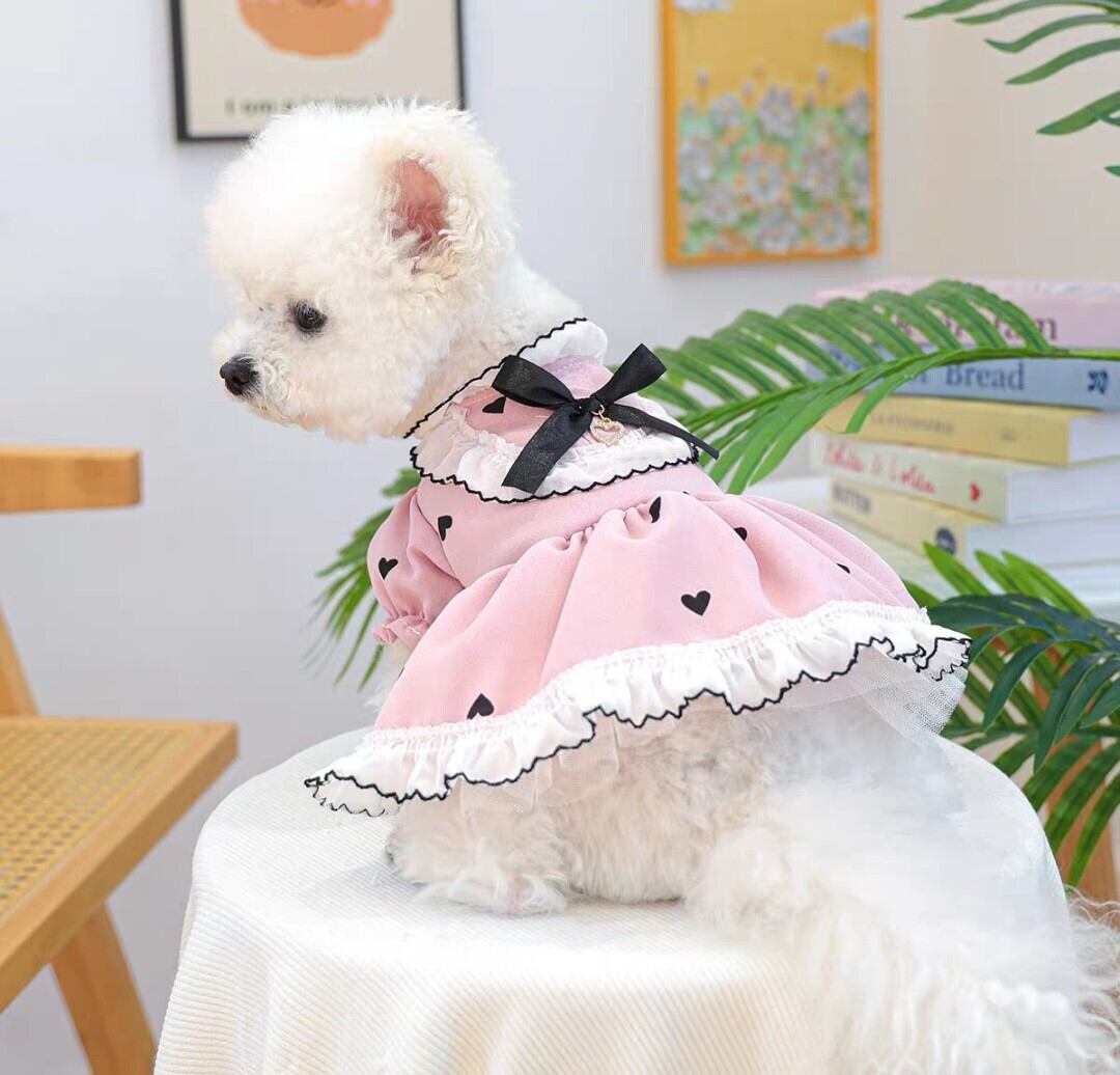 背中のブラックリボンやハート柄が可愛いパフスリーブのワンピース♡。襟元や背中、スカートの裾のブラックの縁取りのホワイトフリルがエレガントさを演出しています。