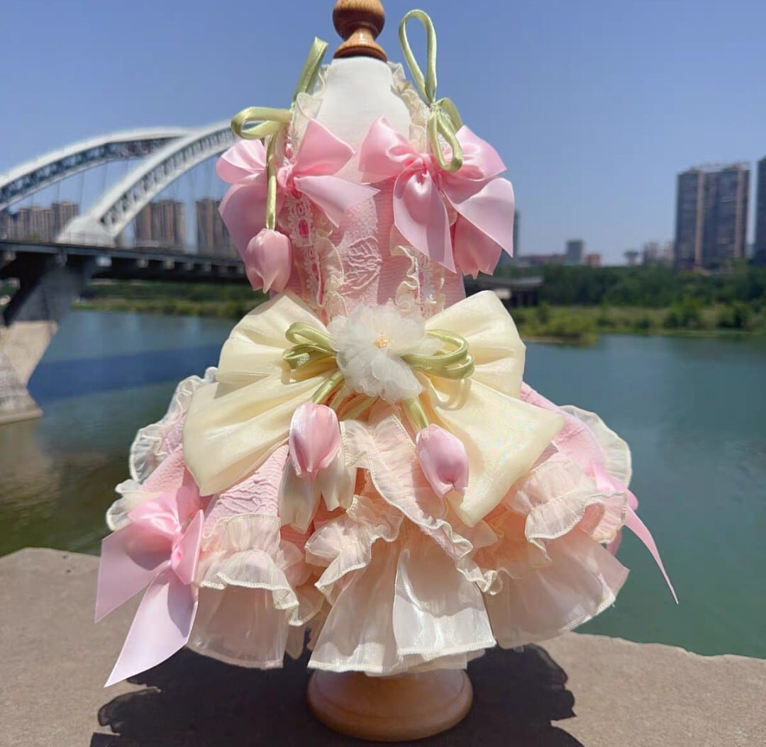 肩や腰に立体チューリップ、フリルは優雅。リボン飾りも可愛らしいです。