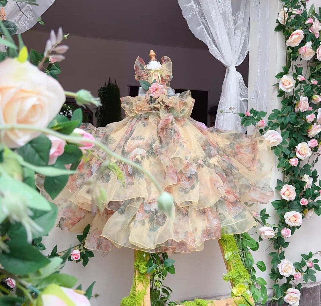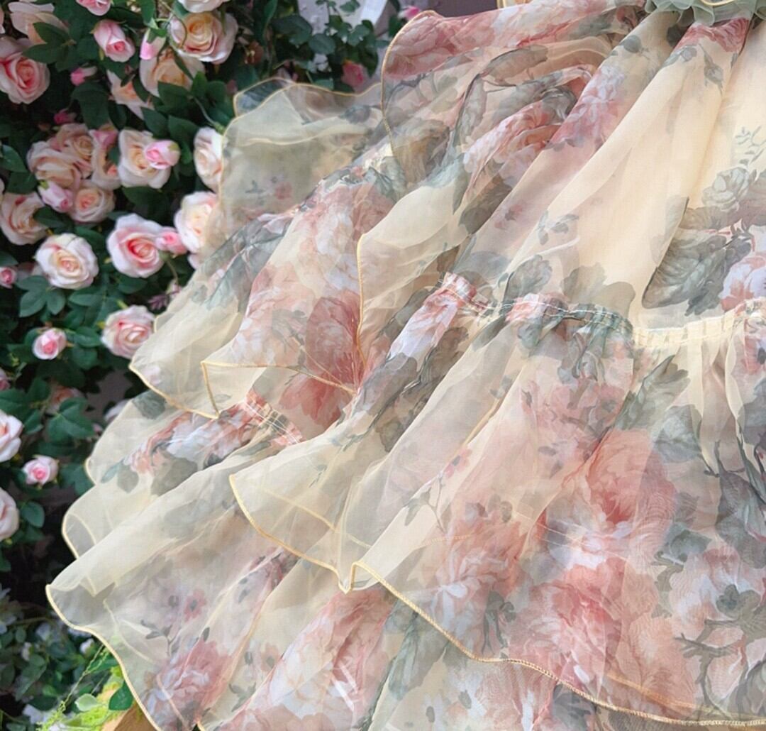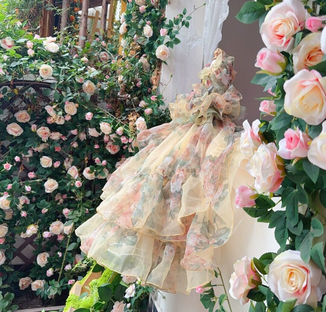 腰には立体ローズモチーフが2輪付いた素敵なリボン。キャラメルベースのヴィンテージ感のあるローズ柄プリント生地使用の、ゴージャスでクラシカルな2wayロングドレス♡