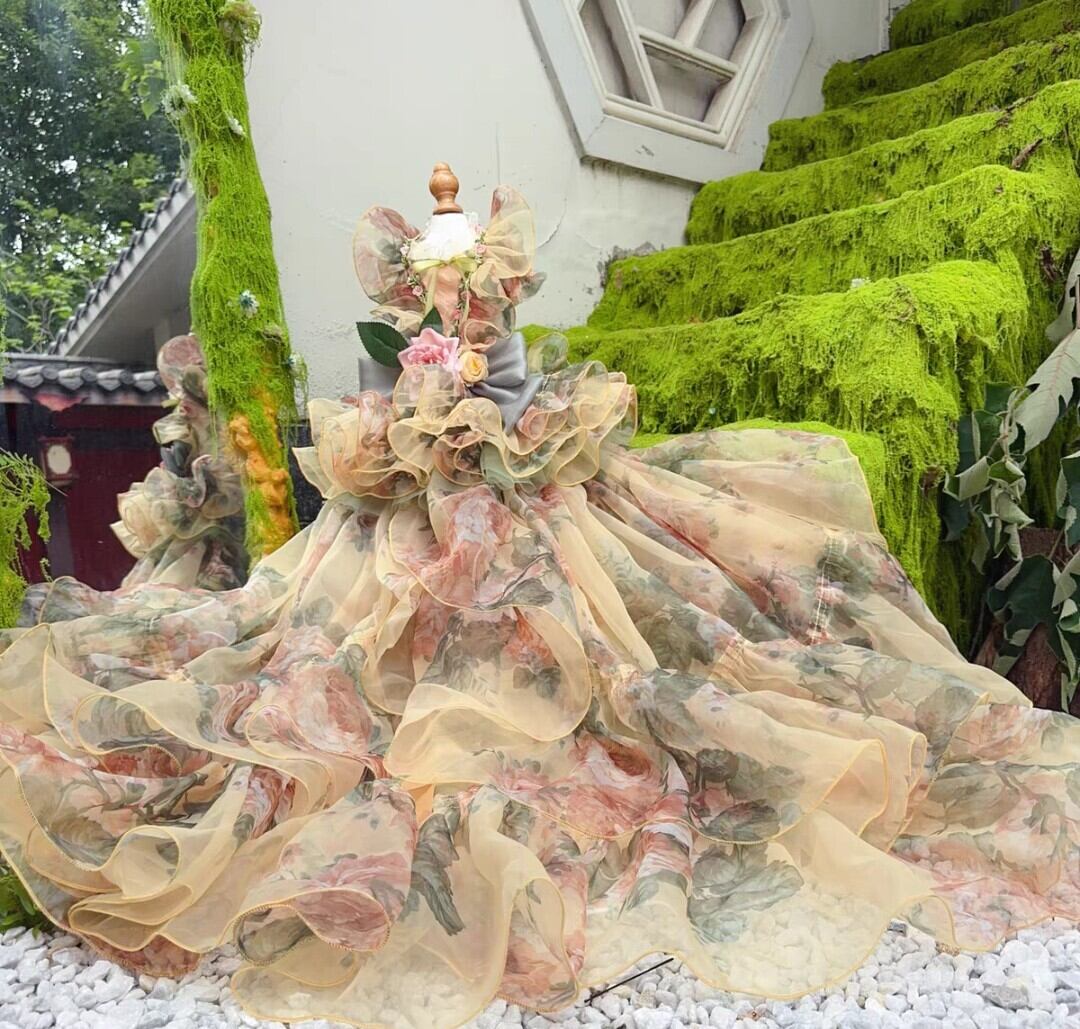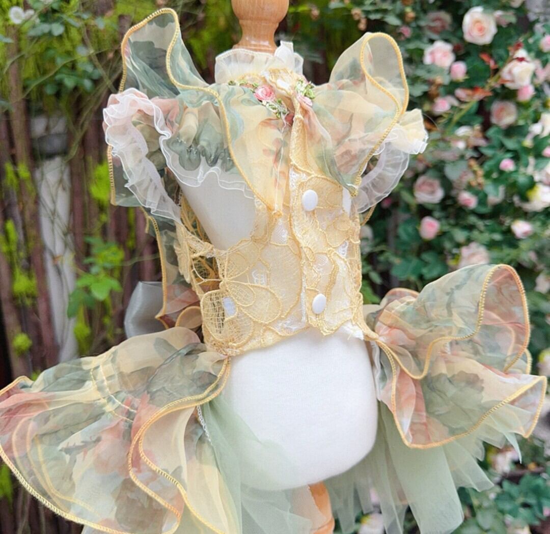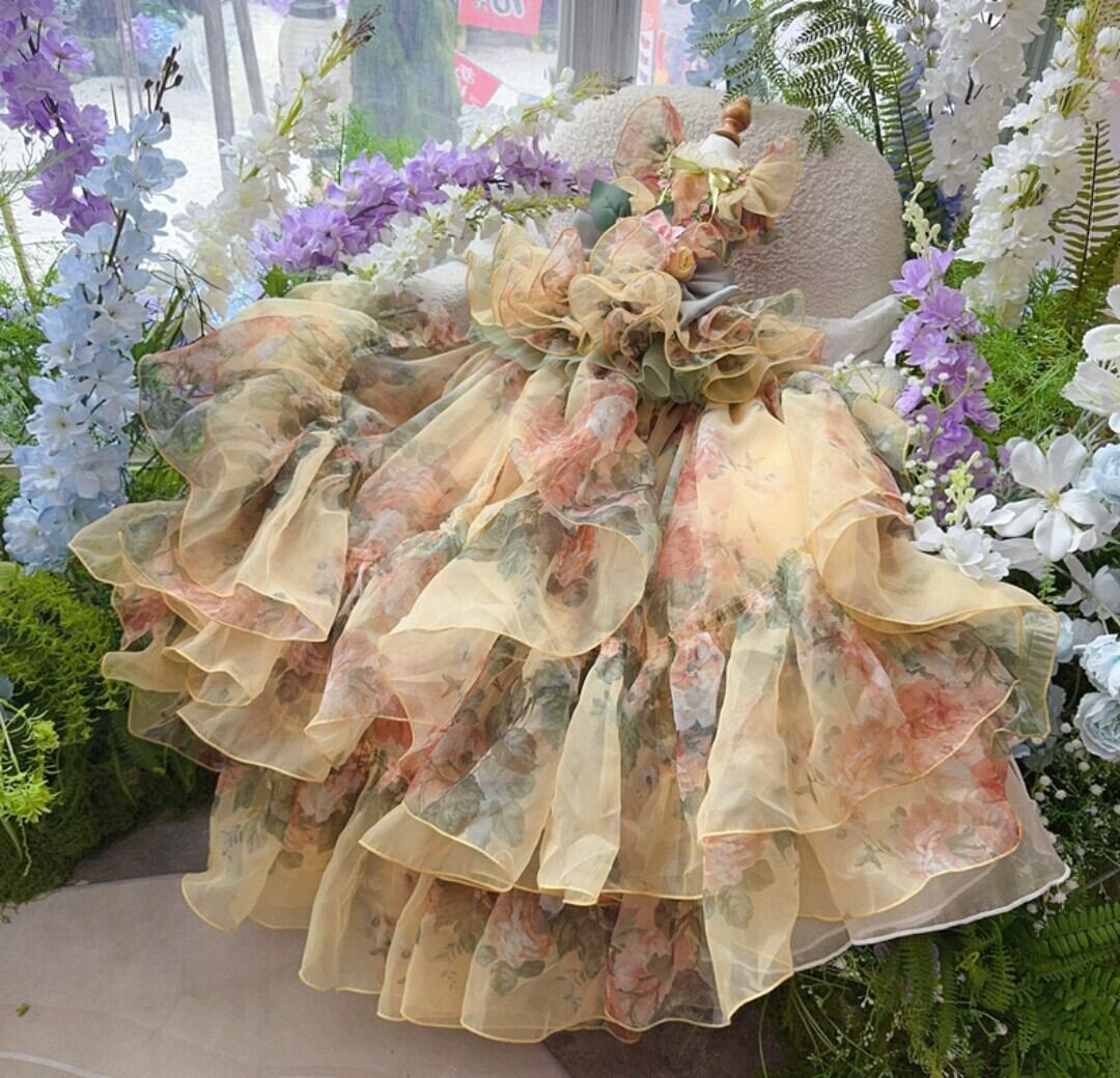 腰には立体ローズモチーフが2輪付いた素敵なリボン。キャラメルベースのヴィンテージ感のあるローズ柄プリント生地使用の、ゴージャスでクラシカルな2wayロングドレス♡