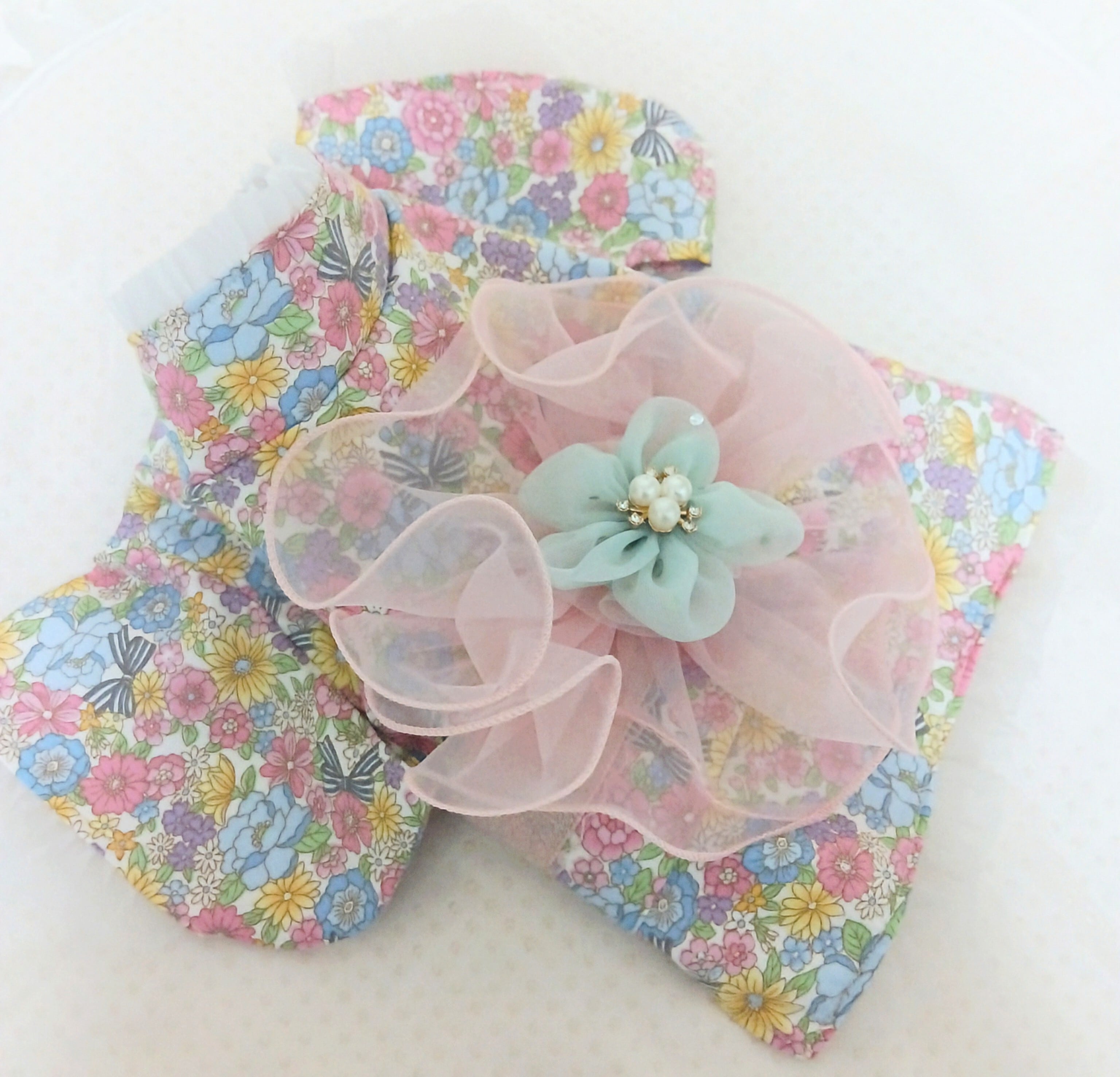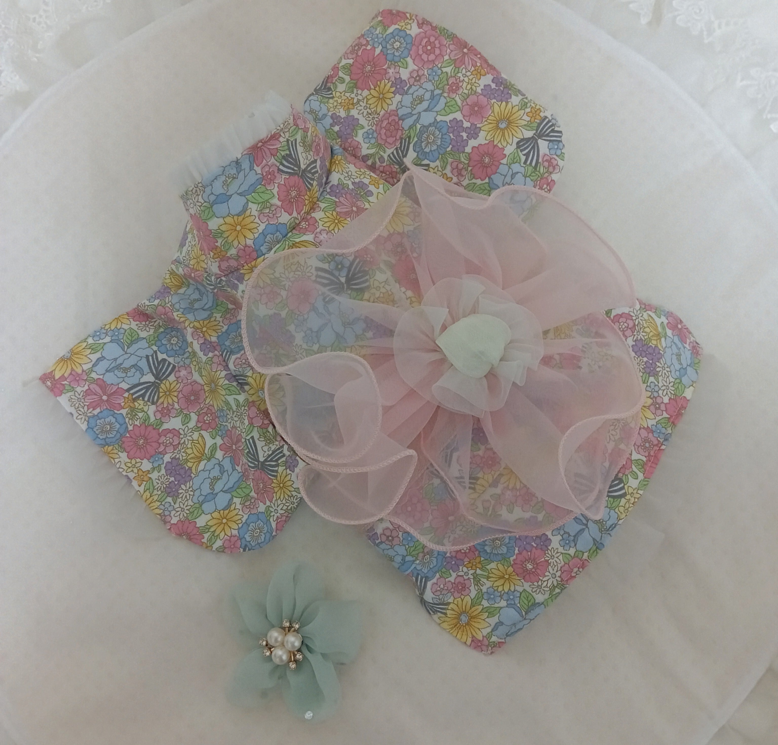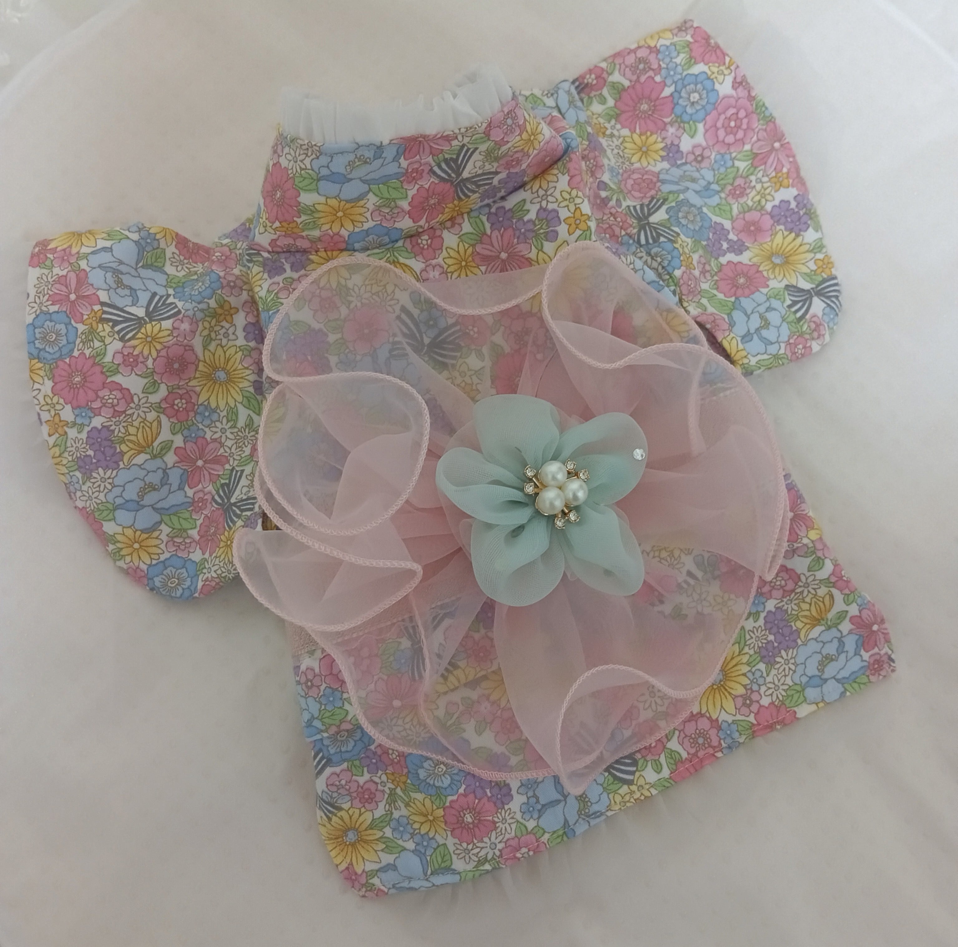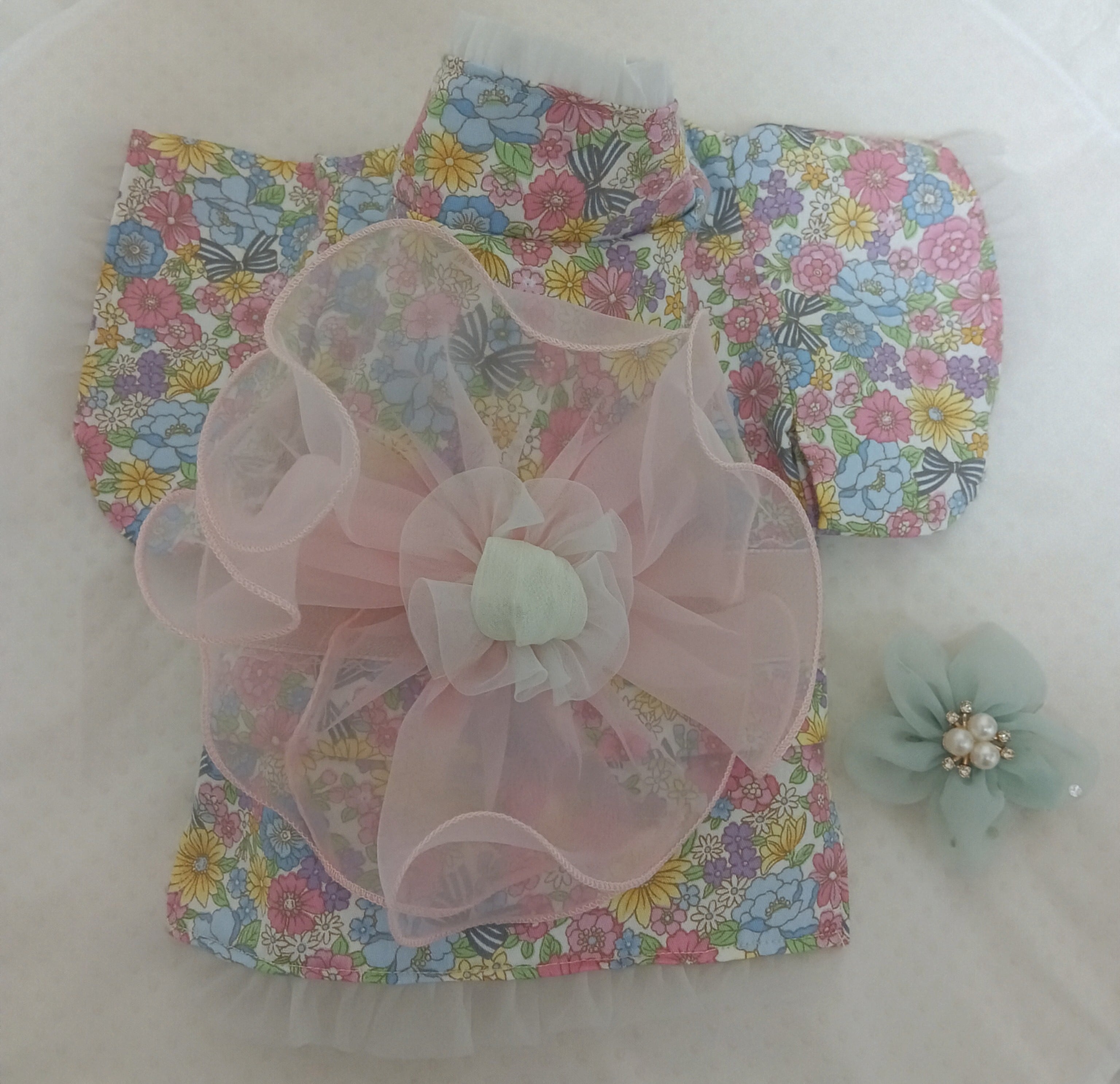 ピンクの小花生地に、ふんわり丸いピンクのシフォンの帯に淡いグリーンのお花の帯飾り付き。胴回りの帯のカラーはピンクです。