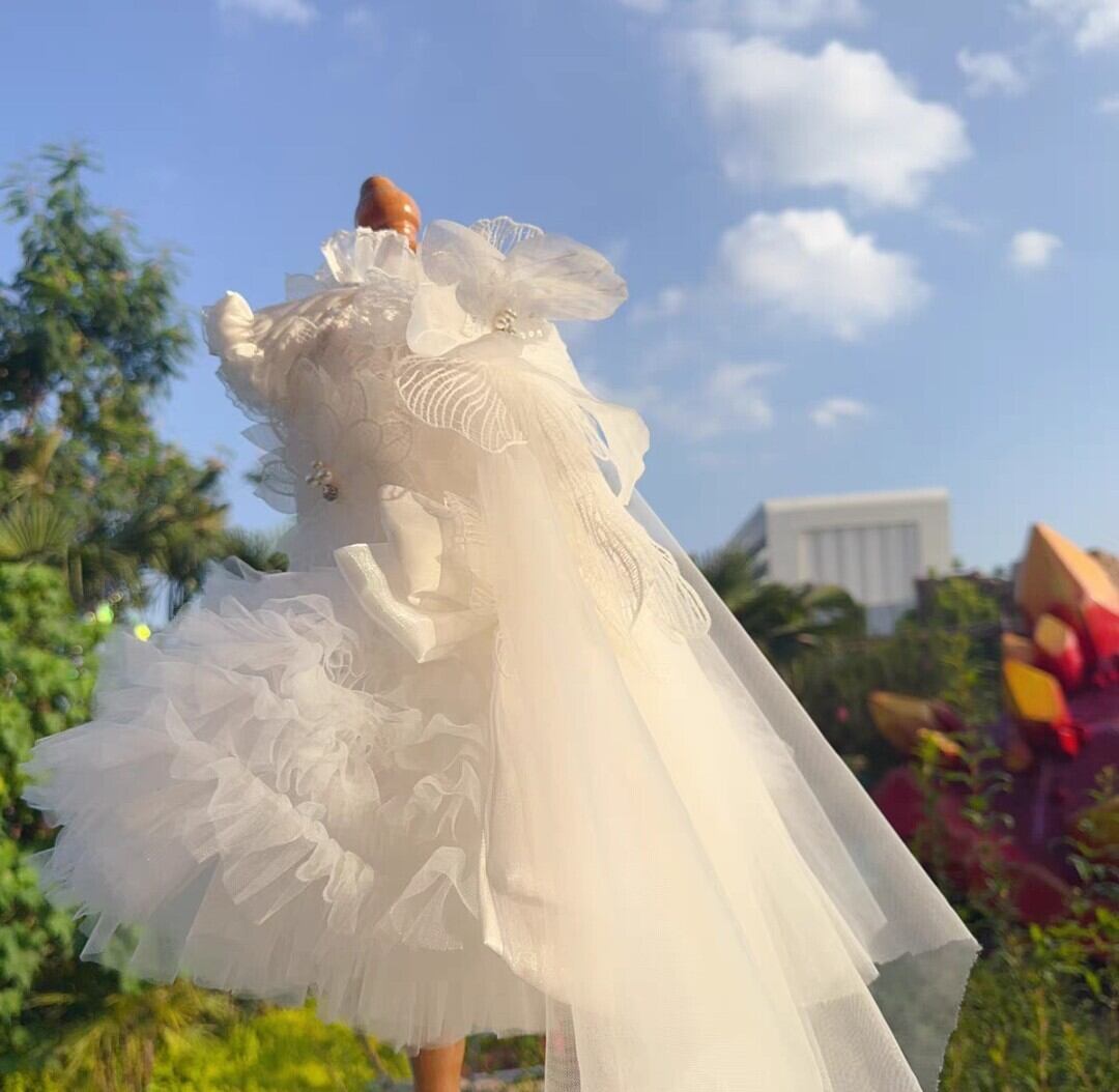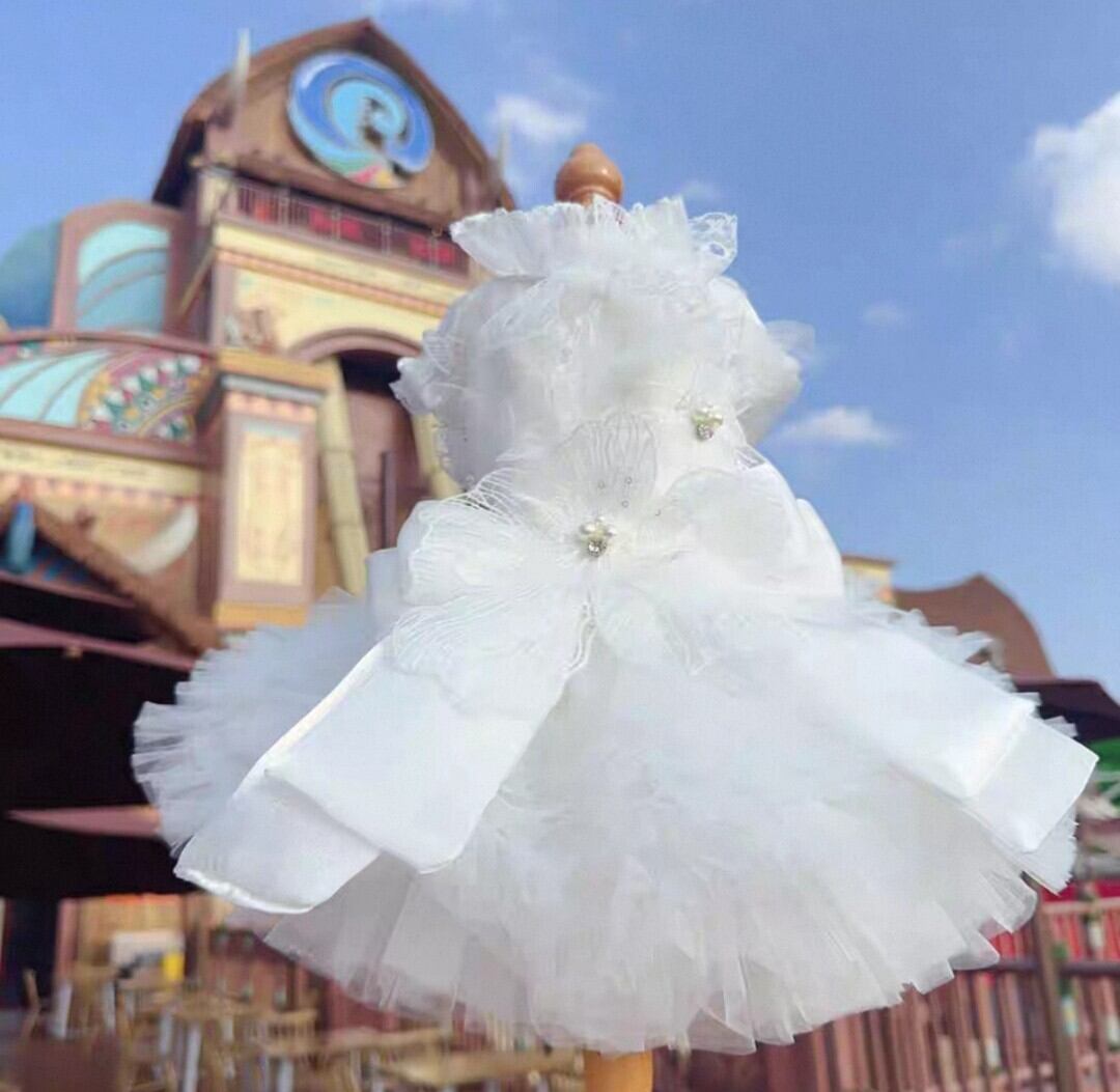 背中のレースのお花にはパールやビジュー飾りも付いています。ドレスの裾をボリューミーな素敵なショートドレスです。