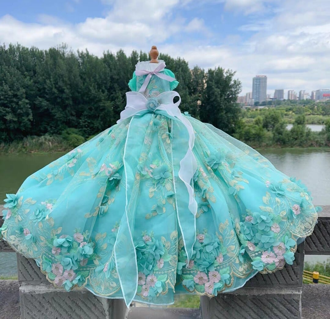 ピンクなどのフラワーモチーフが可愛らしい、腰のロングリボンも素敵な、グリーンブルーのラブリーなロングドレス♡