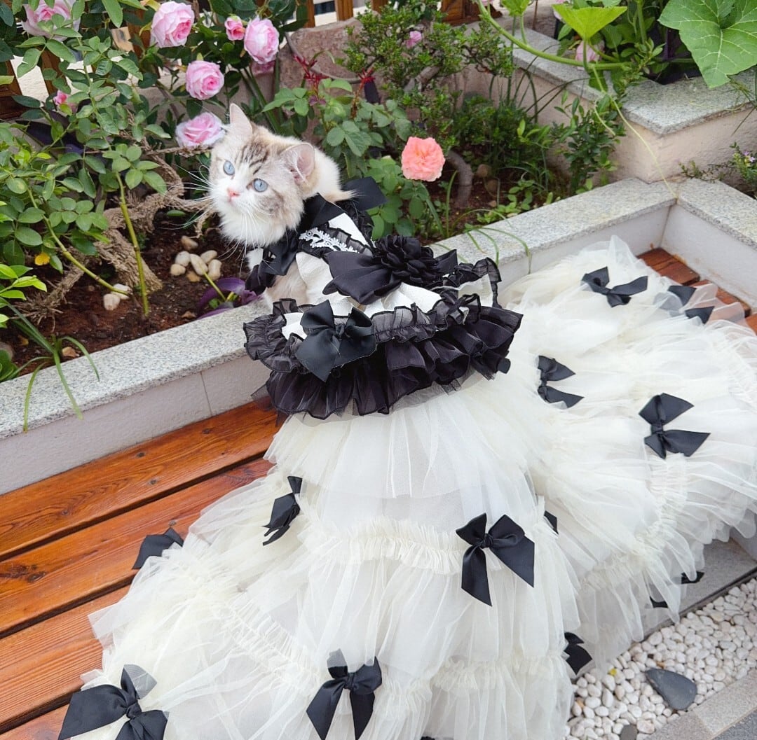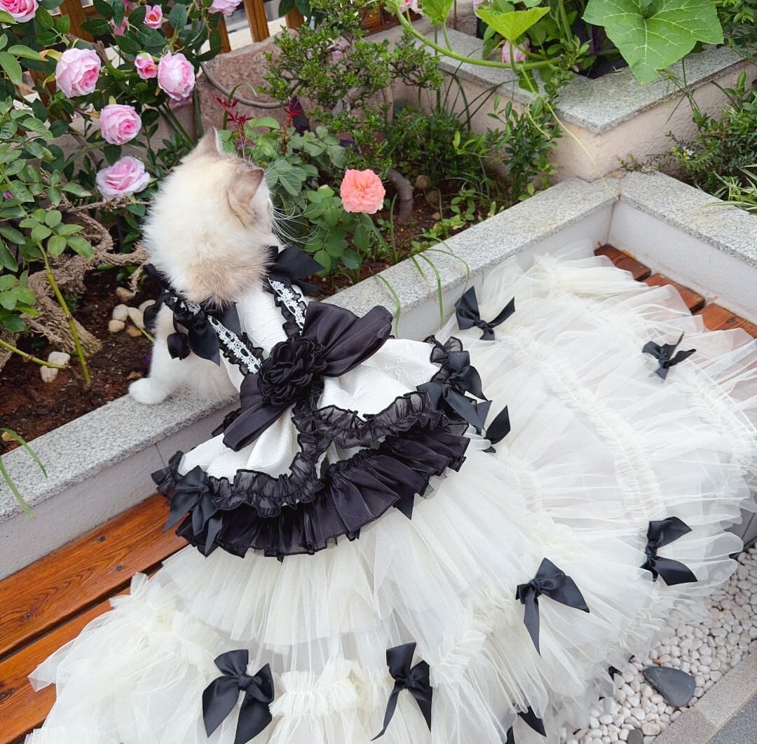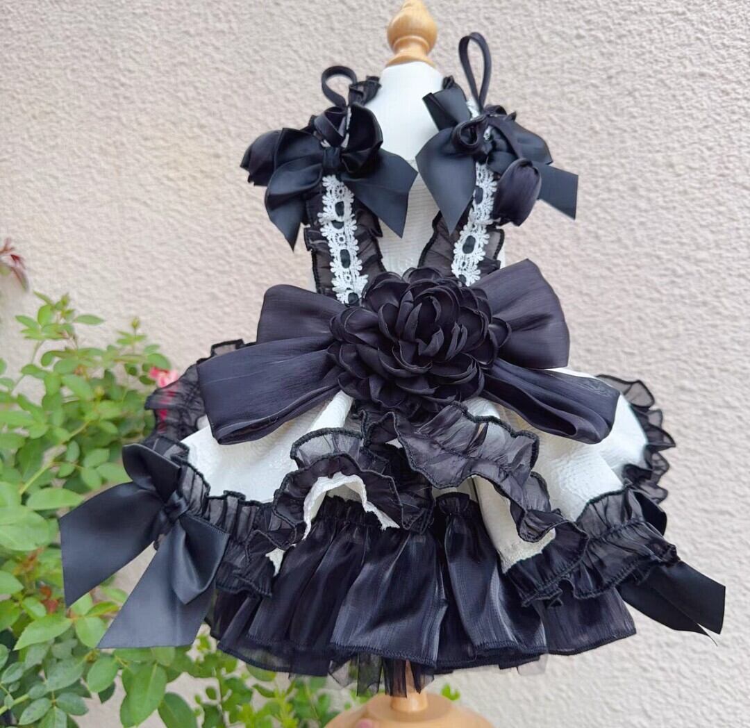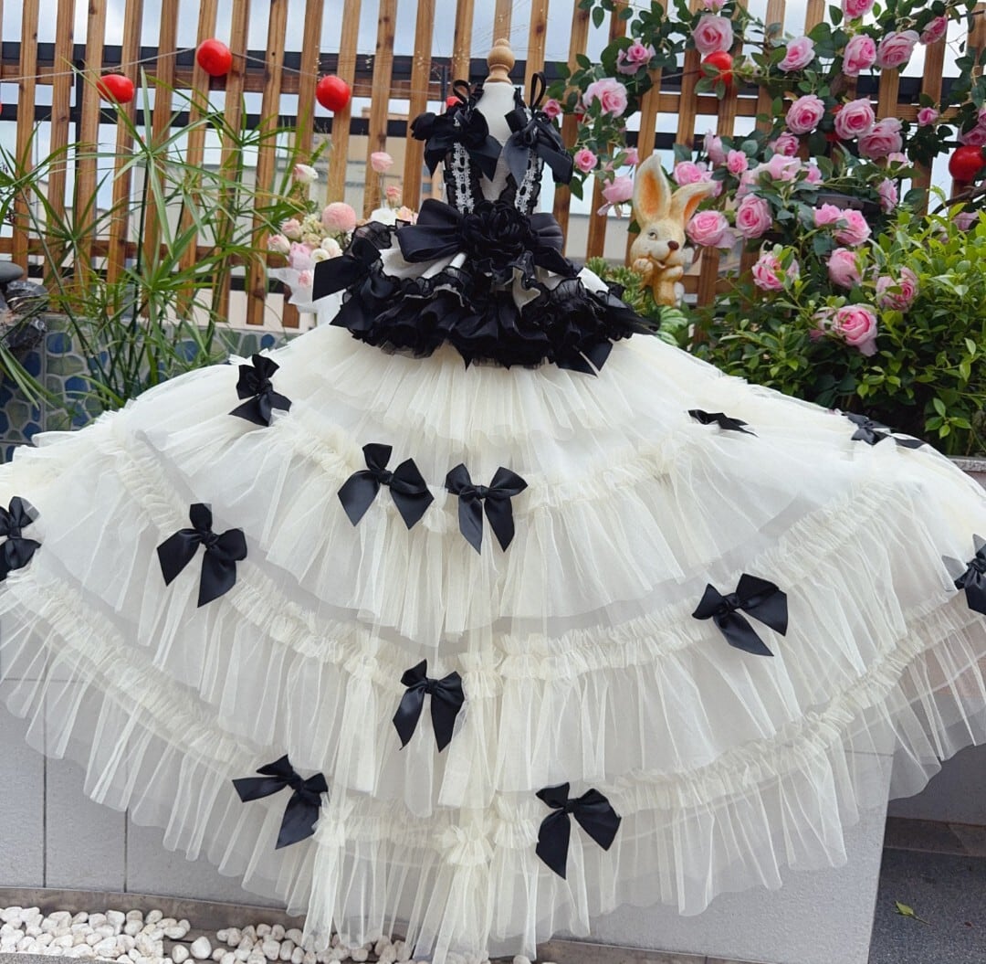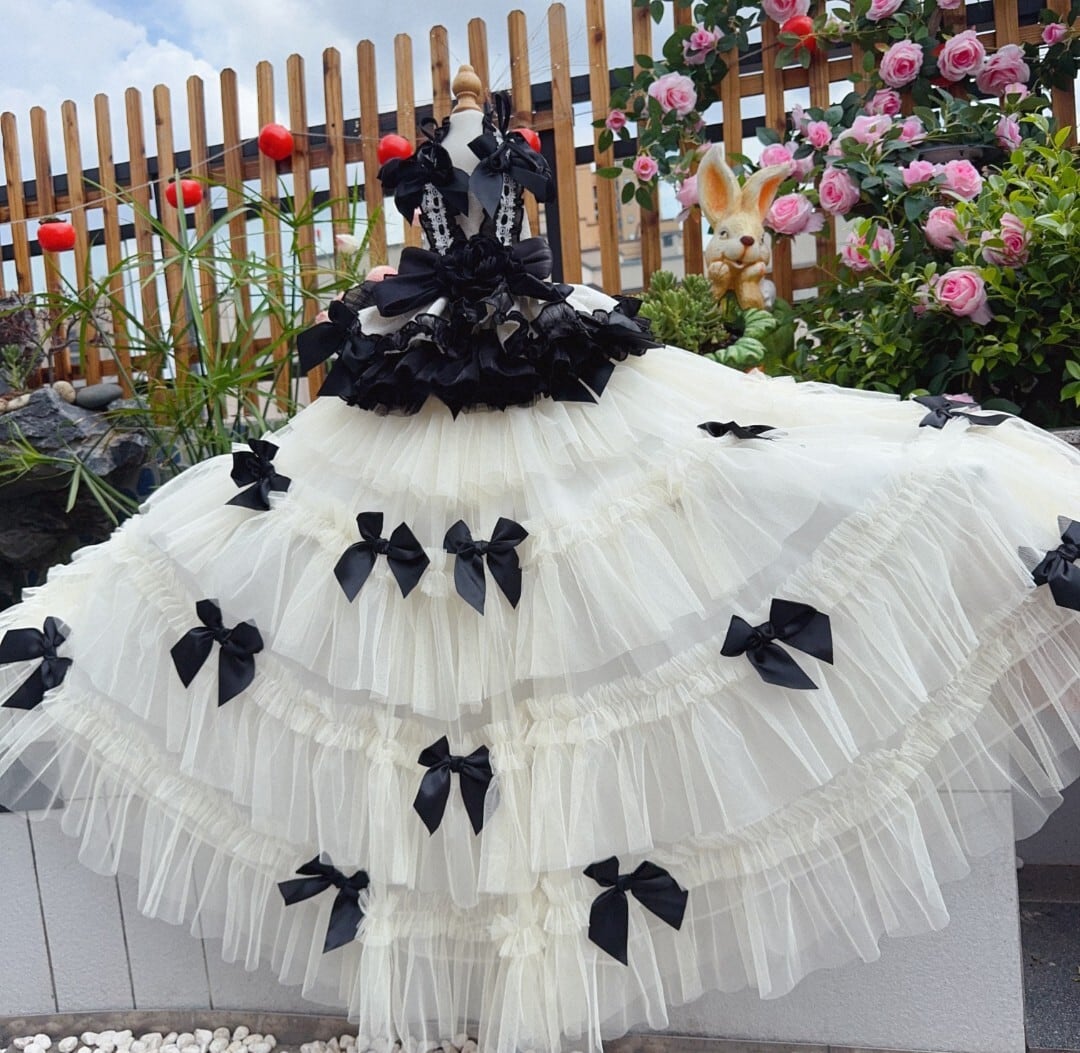 腰にはブラックフラワーモチーフ付き。ブラックリボンも沢山ほどこされ、ブラックのフリル(ショートドレス部分)もアクセントになっている、ホワイトの2wayロングドレス♡