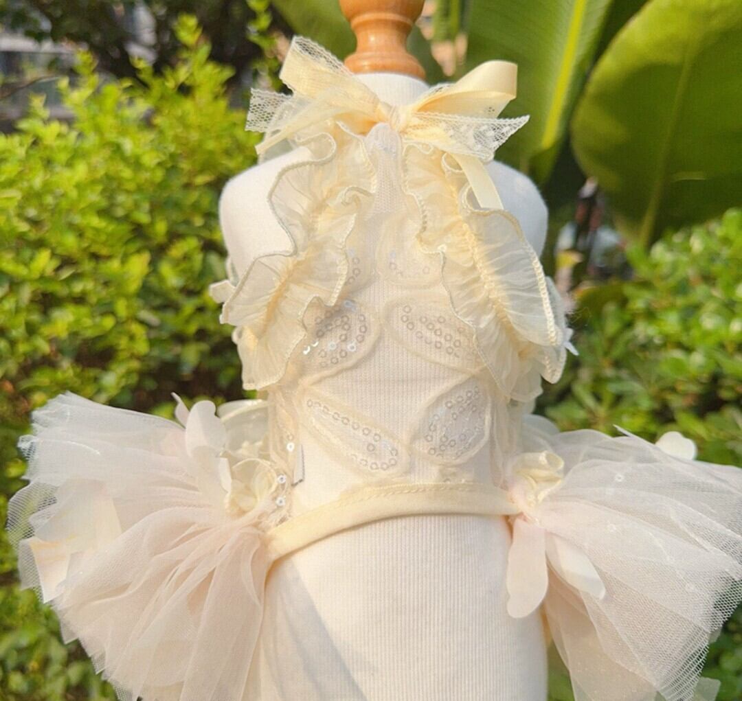 胴回りはスパンコール飾り付きのシースルー生地で夏にぴったり。フリル部分にはバタフライモチーフがほどこされています。