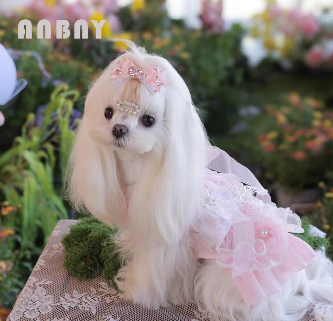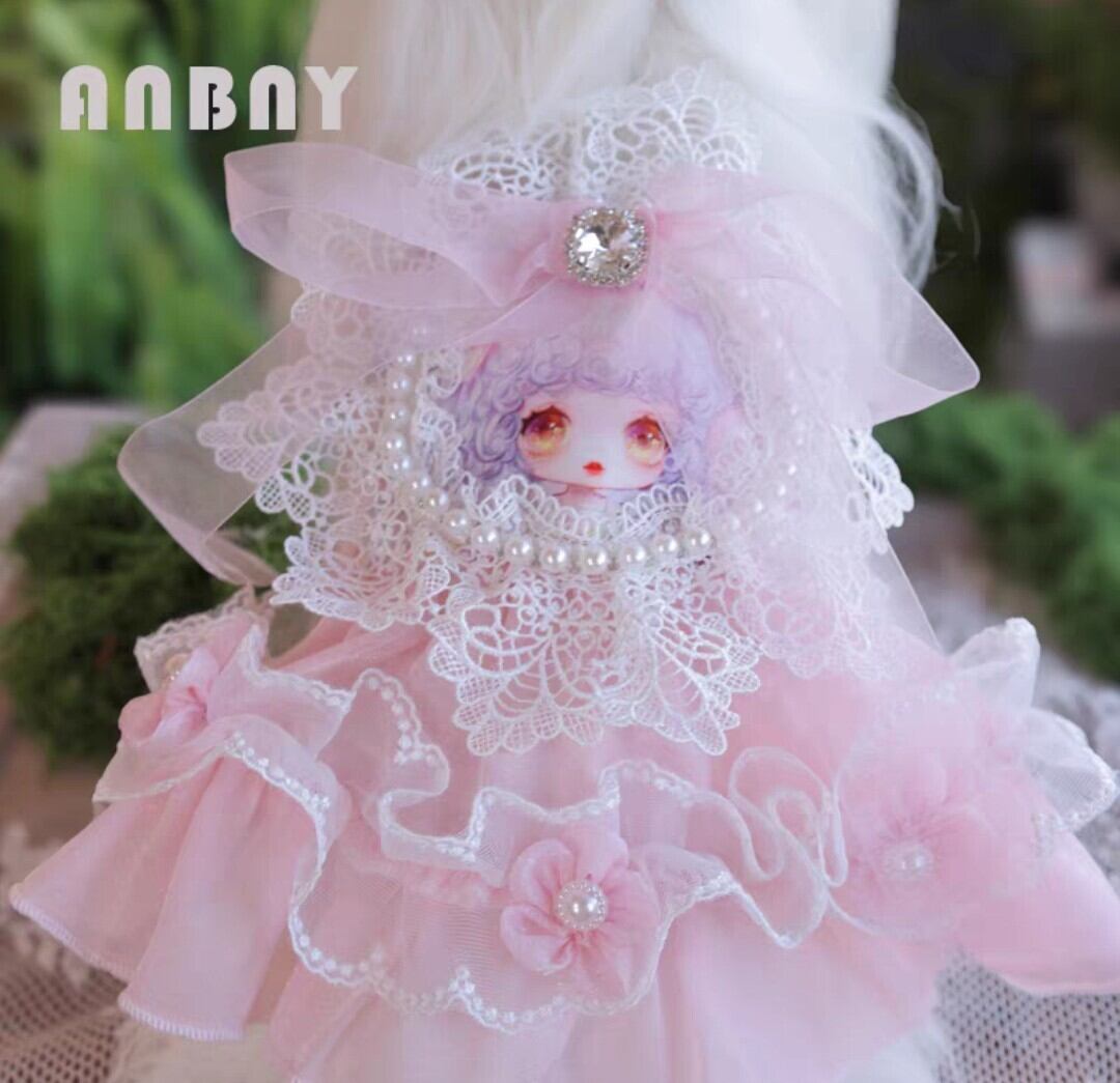 背中の女の子のプリントがラブリーな、ホワイトレース、お花、パール、ビジュー飾りなど可愛いがいっぱいつまったピンクのメルヘンワンピース♡