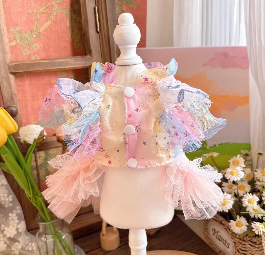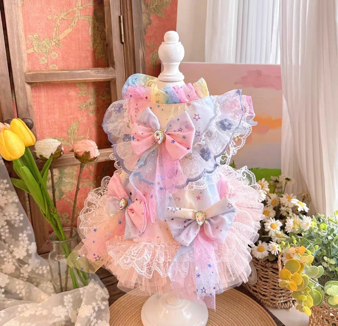 3つのリボンにはキラキラビジュー付き、背中やスカートの裾に素敵なレースがあしらわれた夢色カラフルワンピースです♡