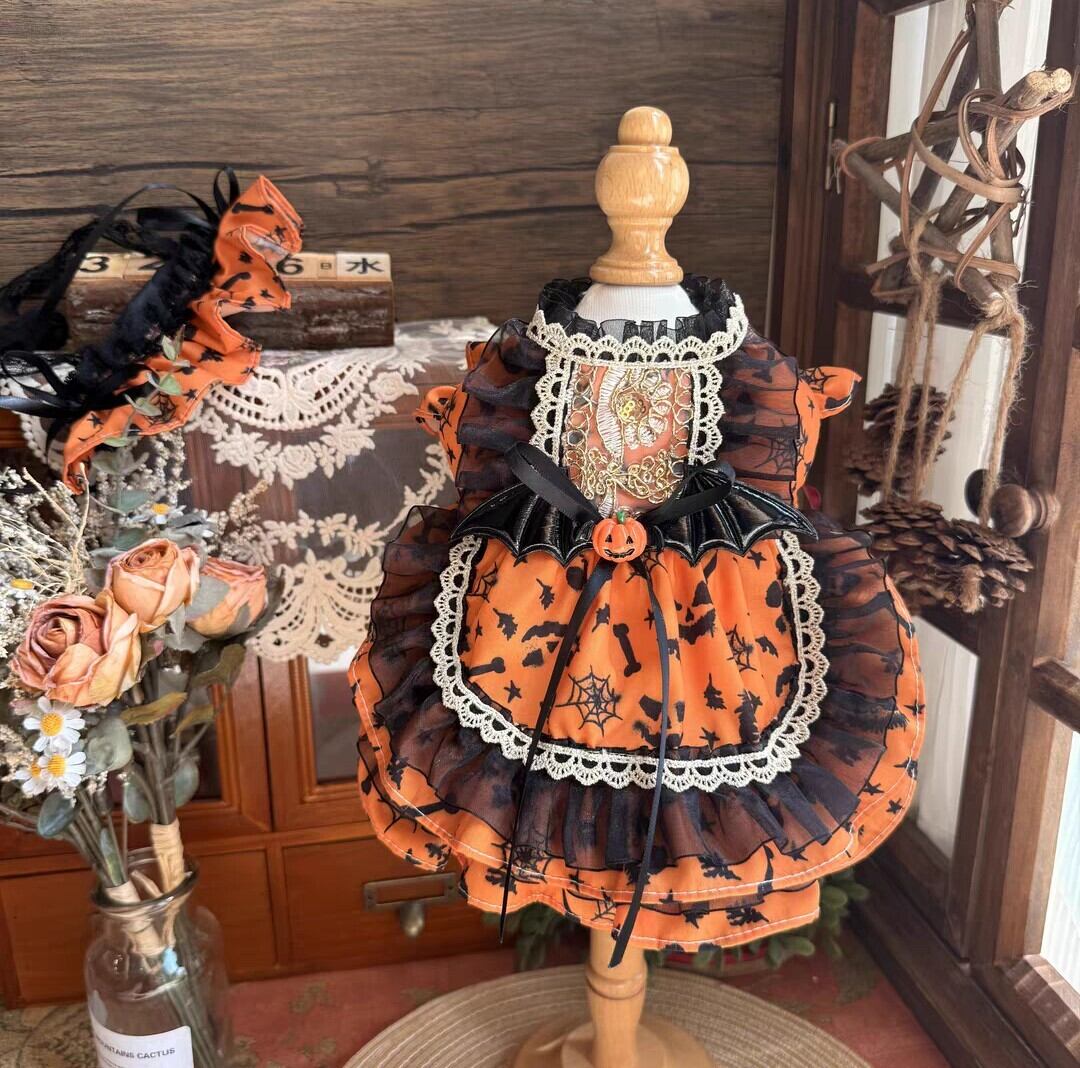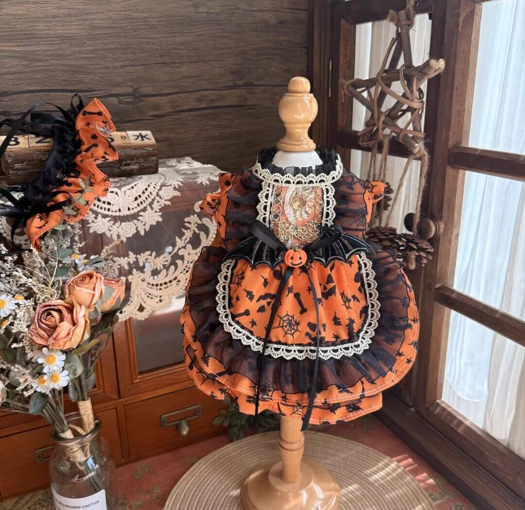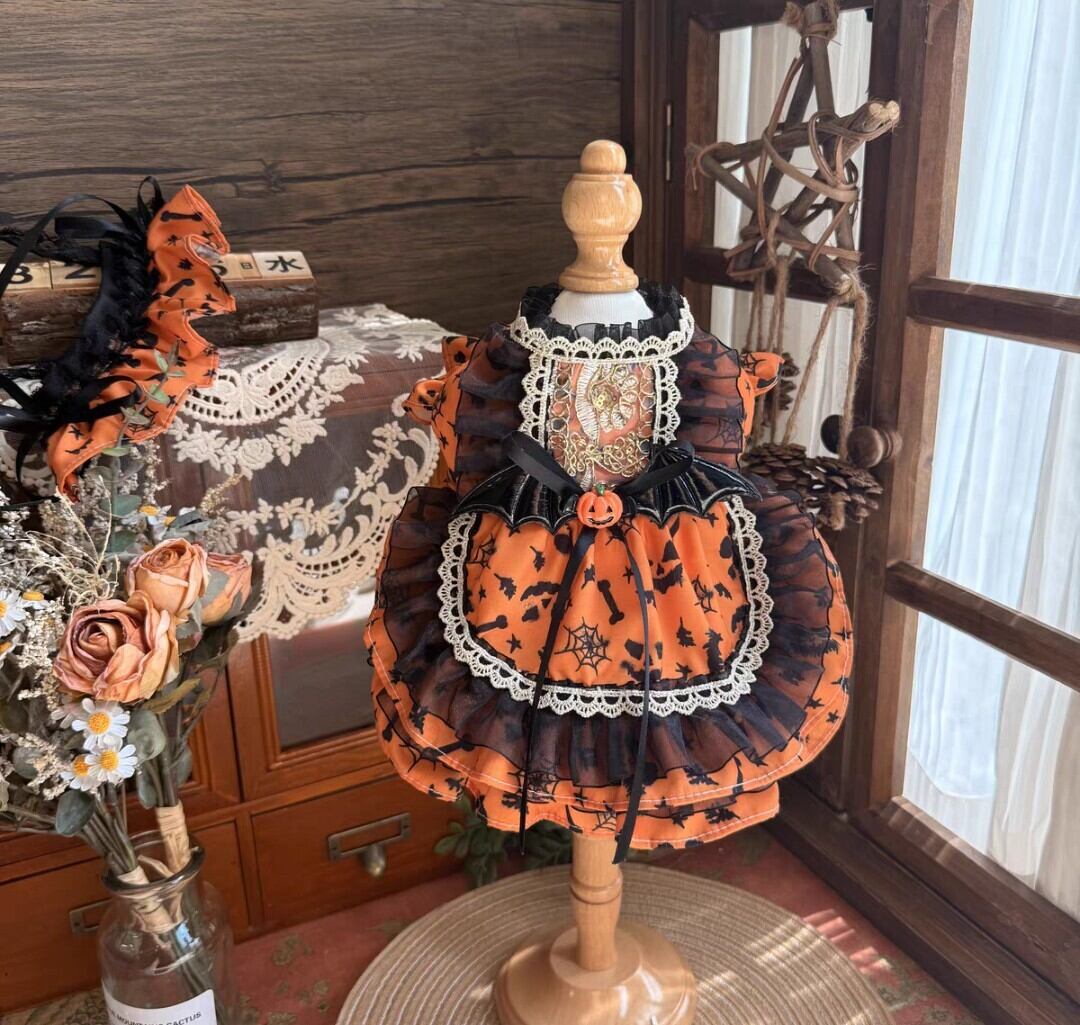 ハロウィン柄のプリント生地も可愛らしく、背中部分のレースが上品なデザインです。