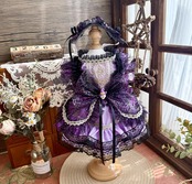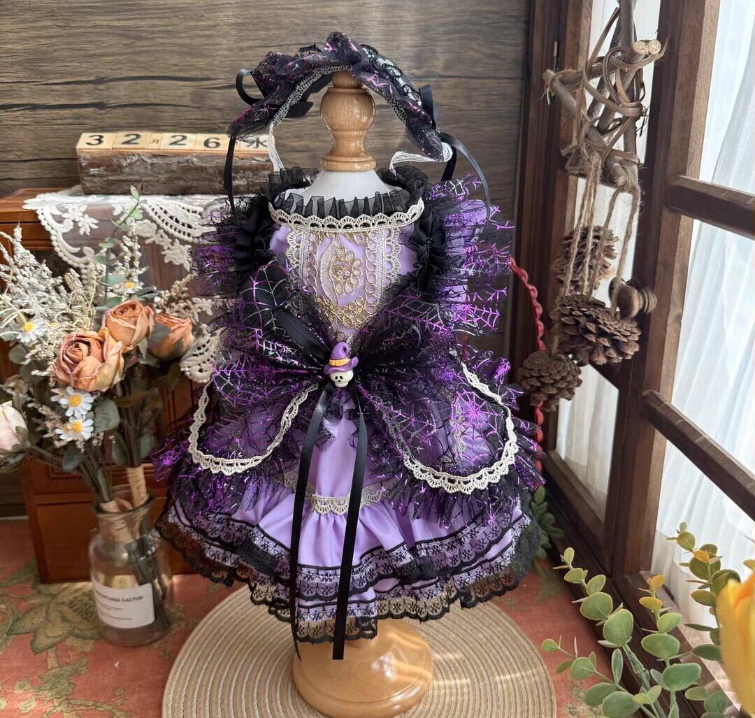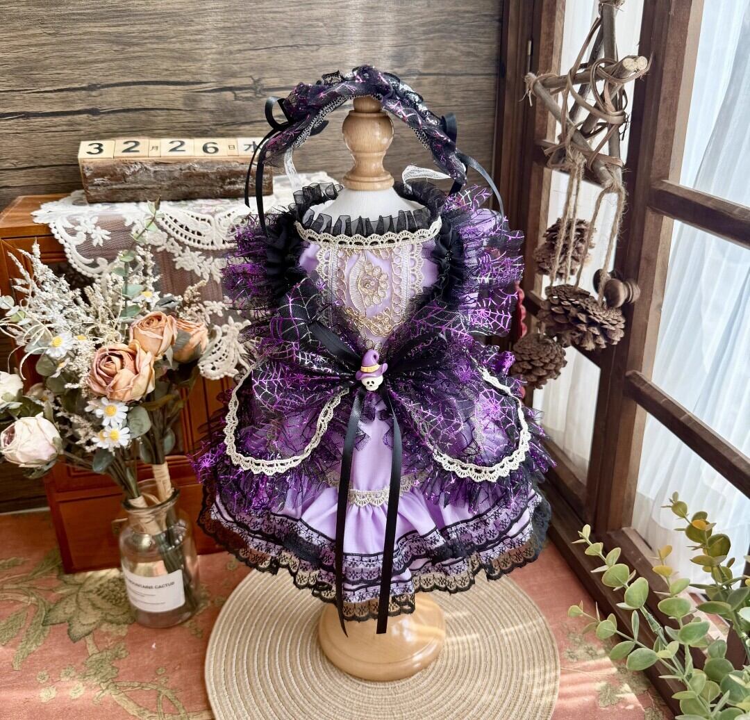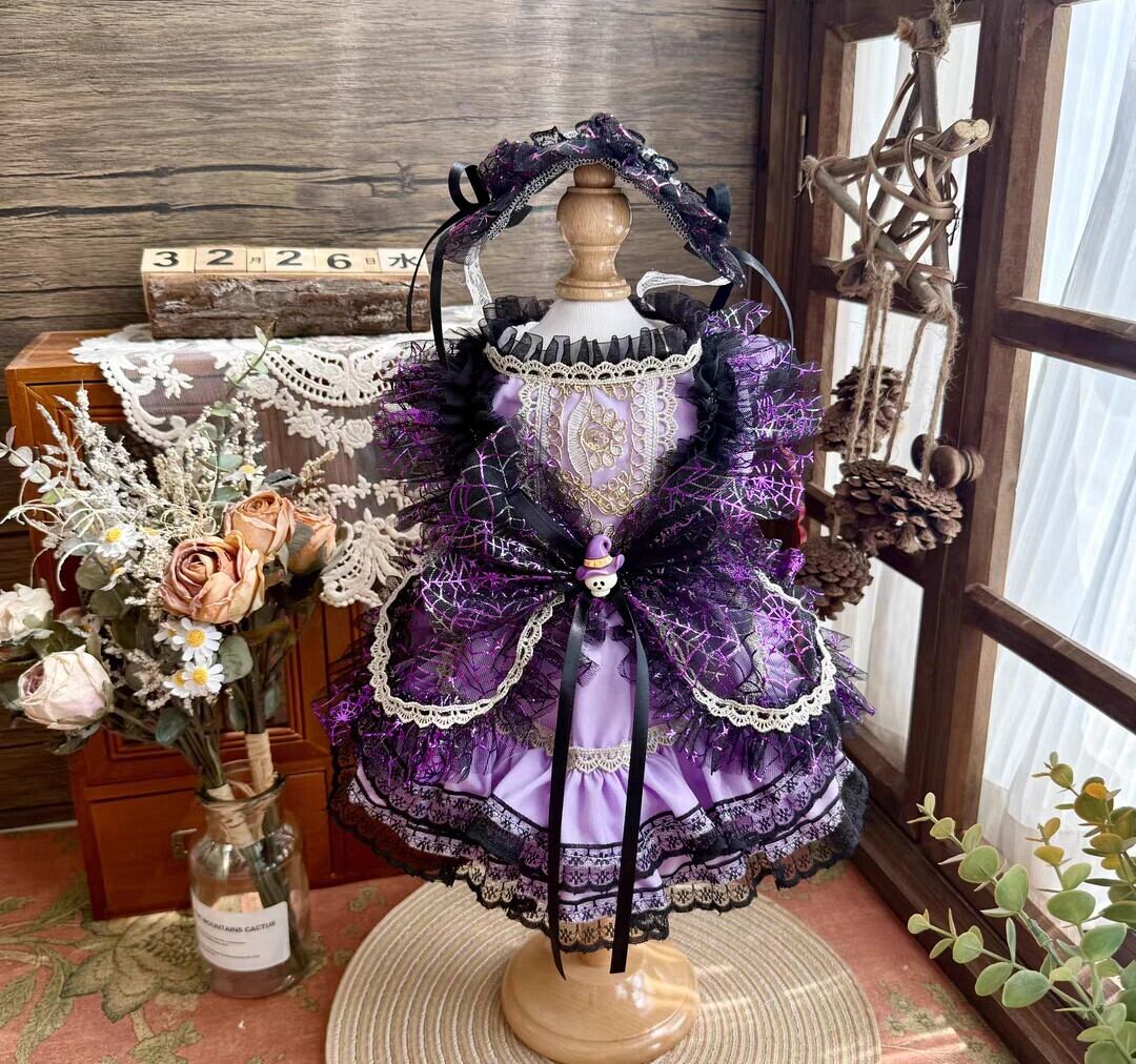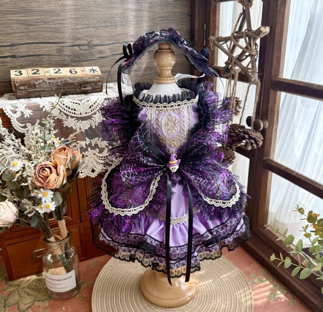 腰のリボンには可愛いお化けの飾り付き。背中には上品な刺繍レースがほどこされ、肩からスカートの裾までパープルとブラックの華やかなレースで飾られたワンピース♡