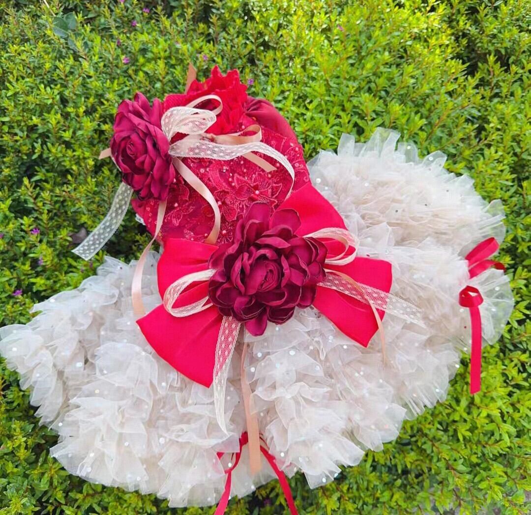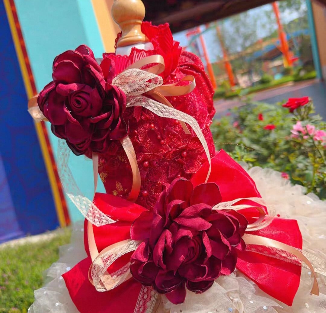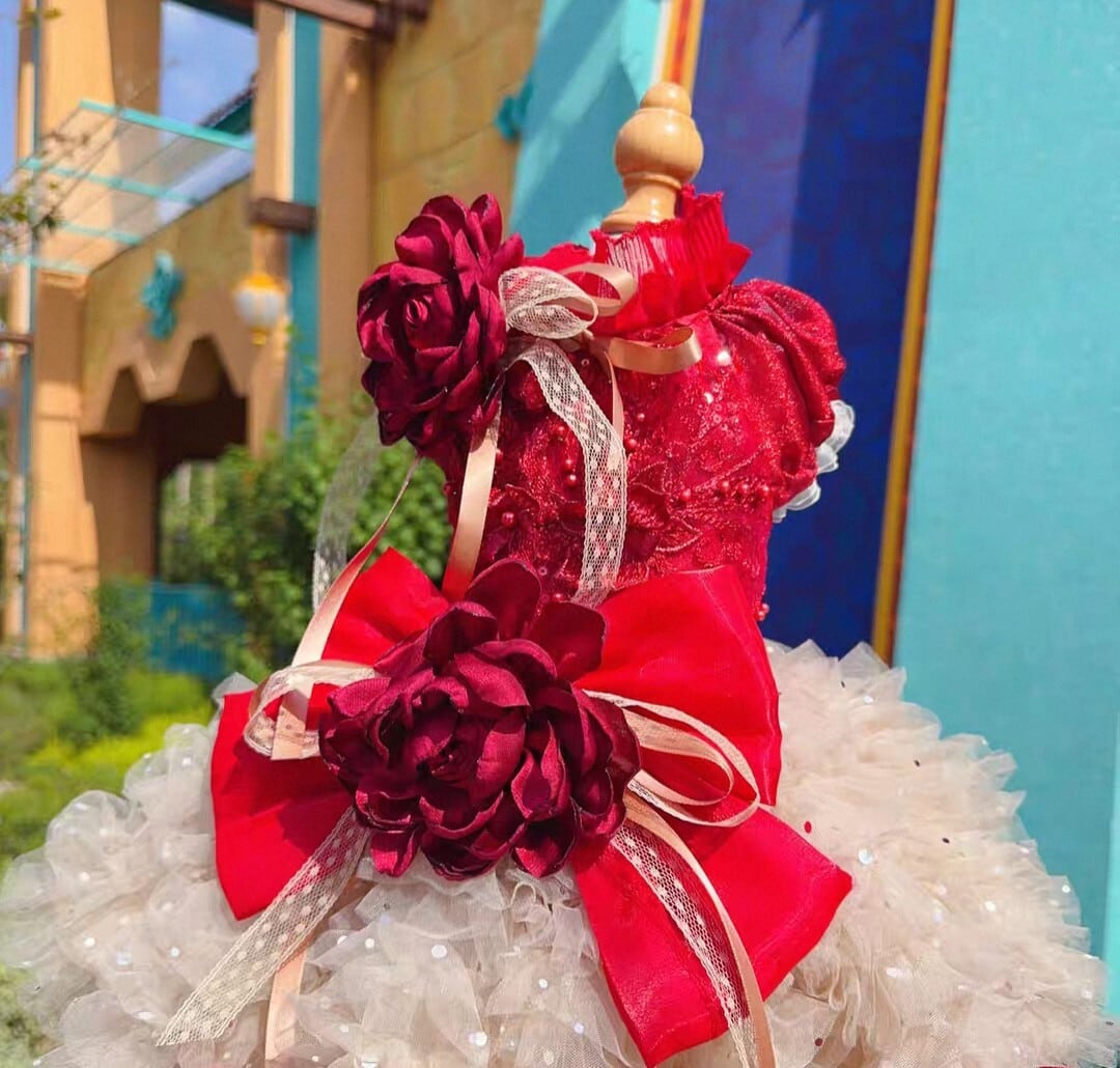 大ぶりのフラワーモチーフ付きのレッド&ゴールドのリボンが華やかなショートドレス♡