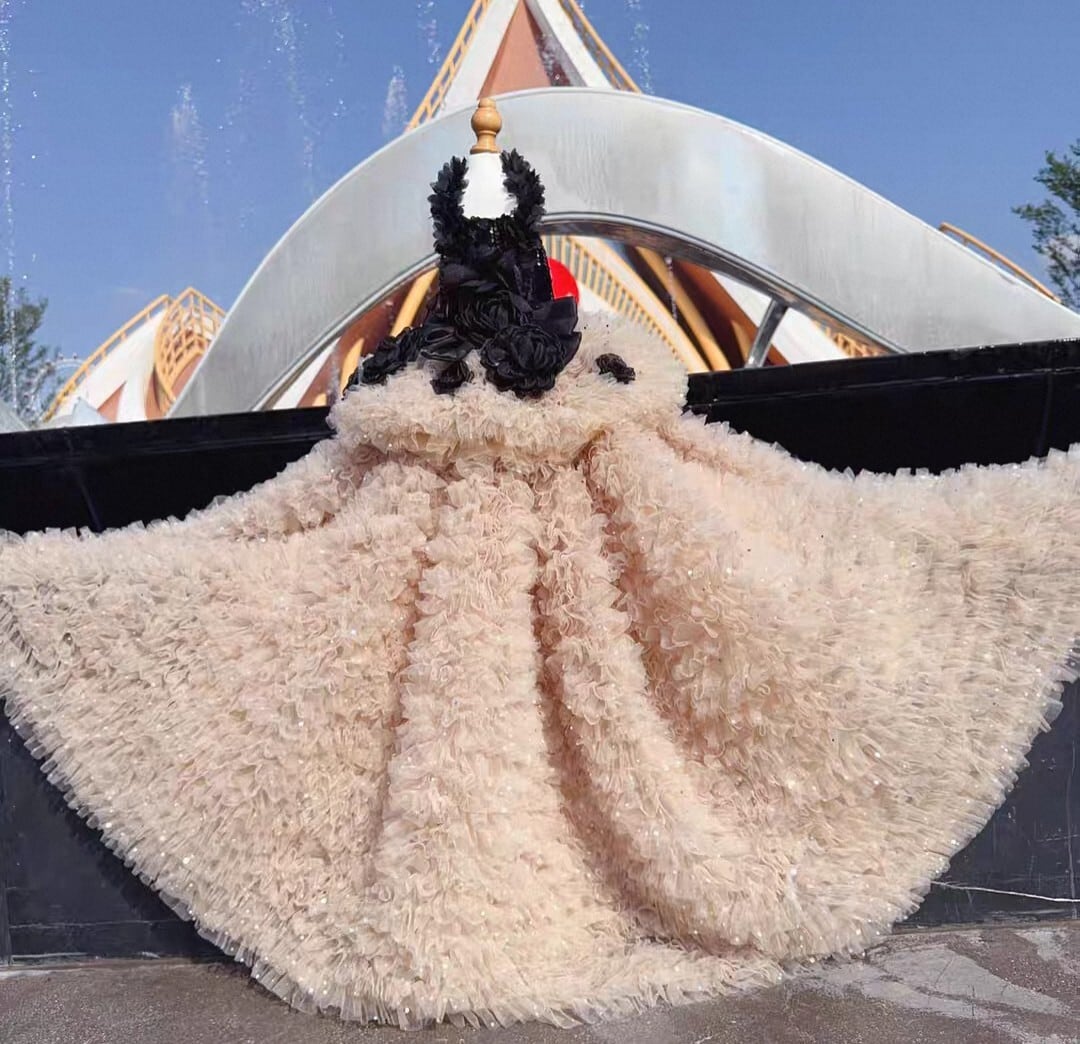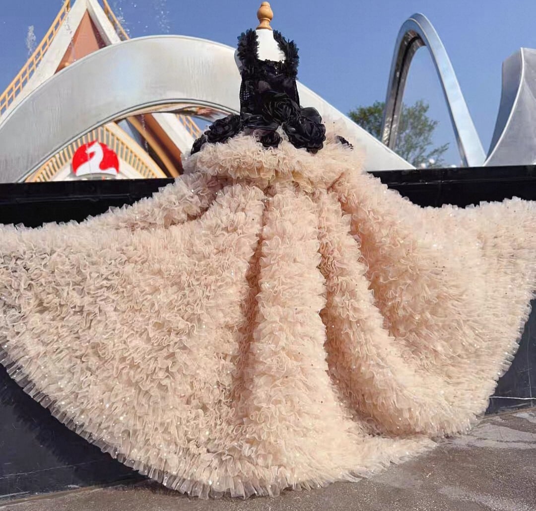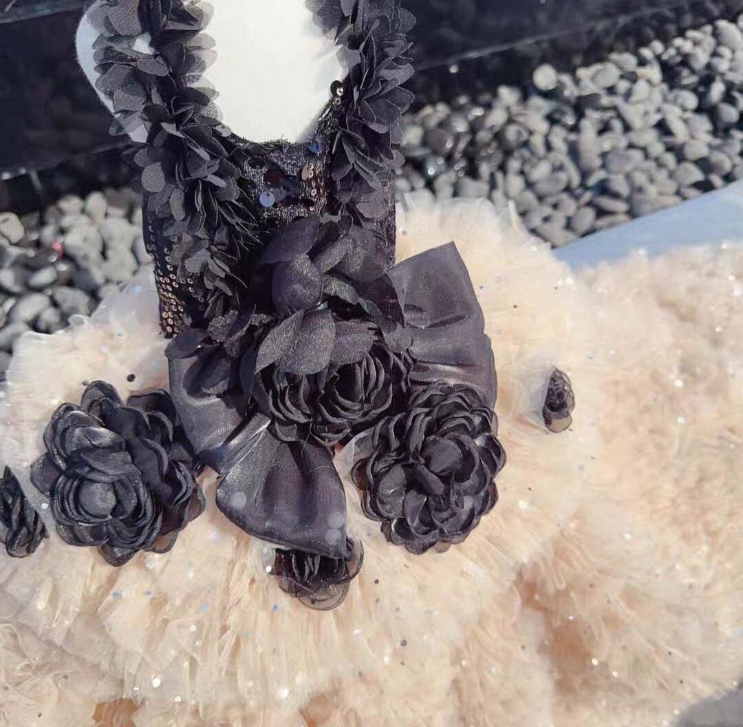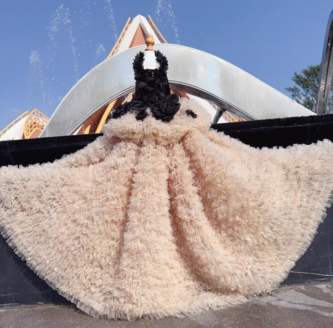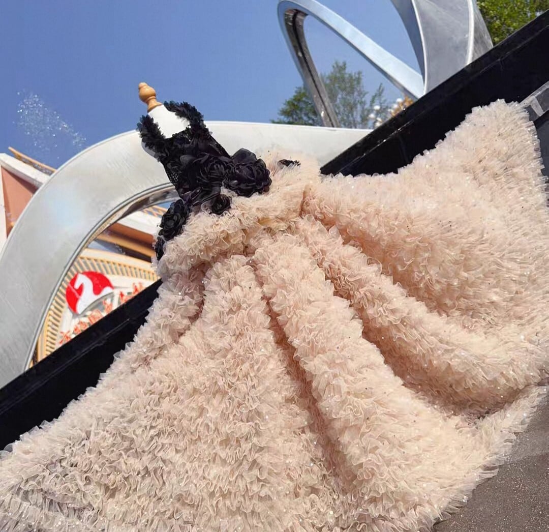 胴回りはスパンコールがあしらわれ、スカート部分はボリューミーな何層ものシフォンフリルで、エレガントでゴージャスです。