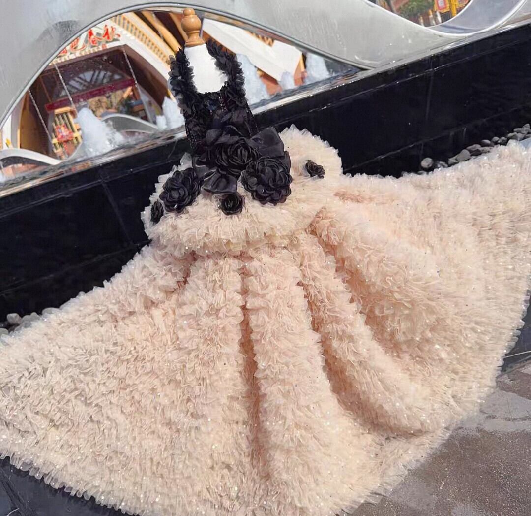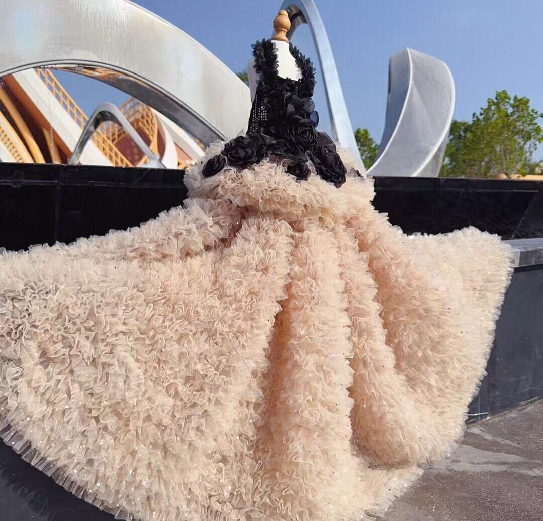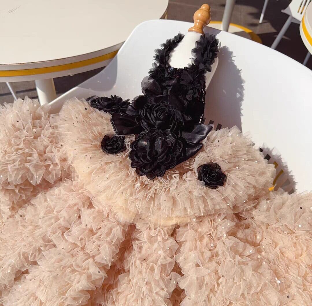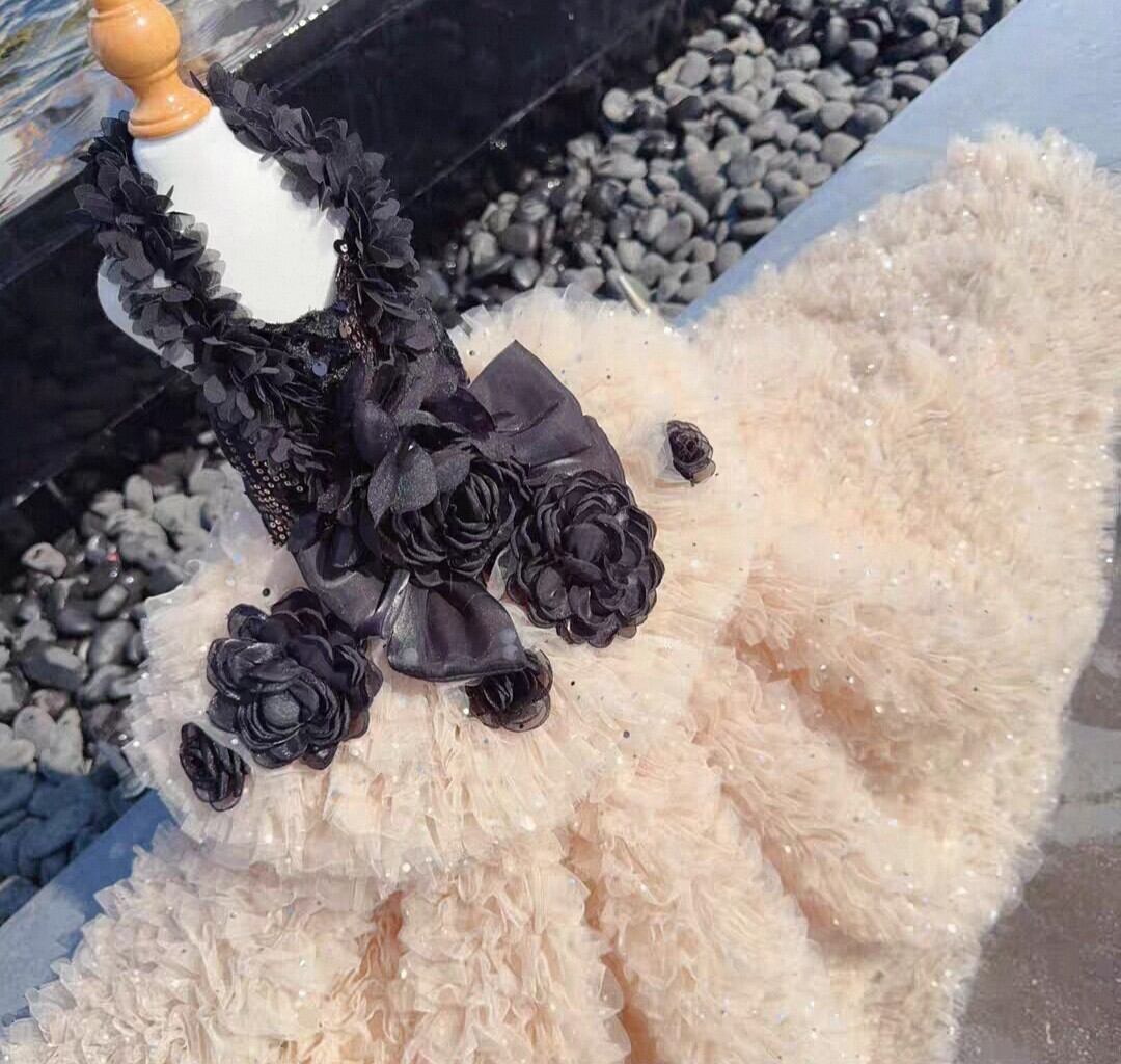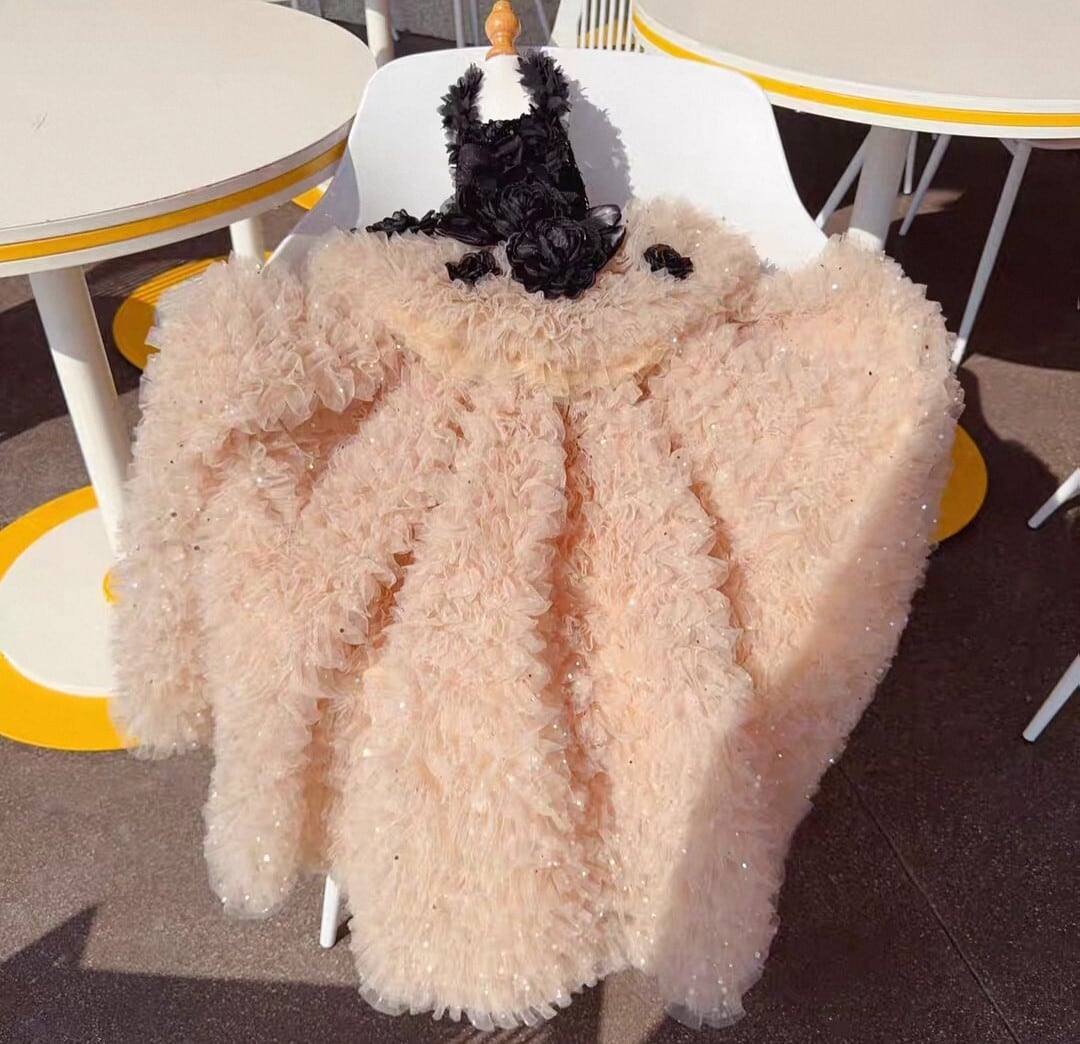 胴回りはスパンコールがあしらわれ、スカート部分はボリューミーな何層ものシフォンフリルで、エレガントでゴージャスです。