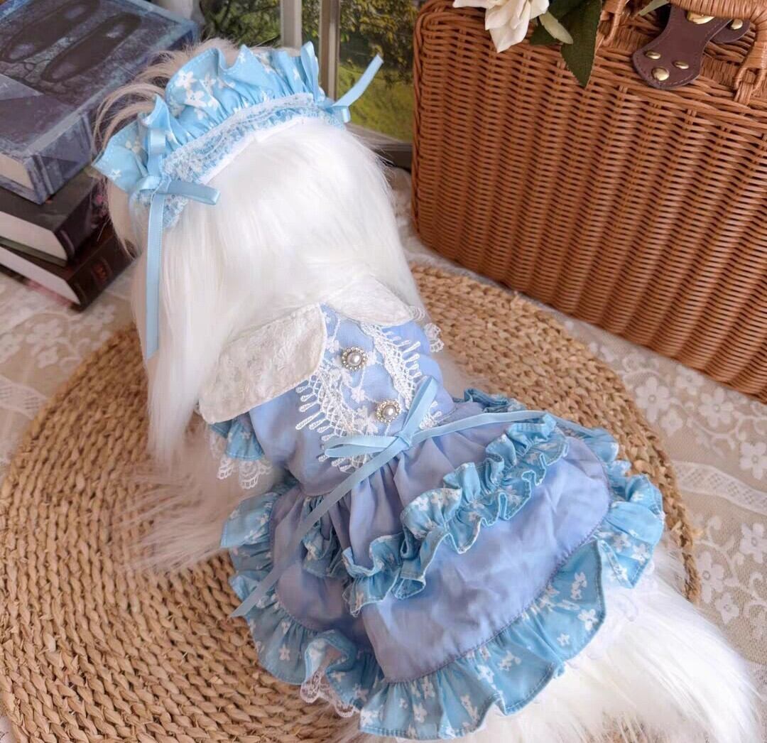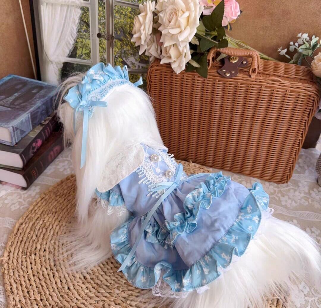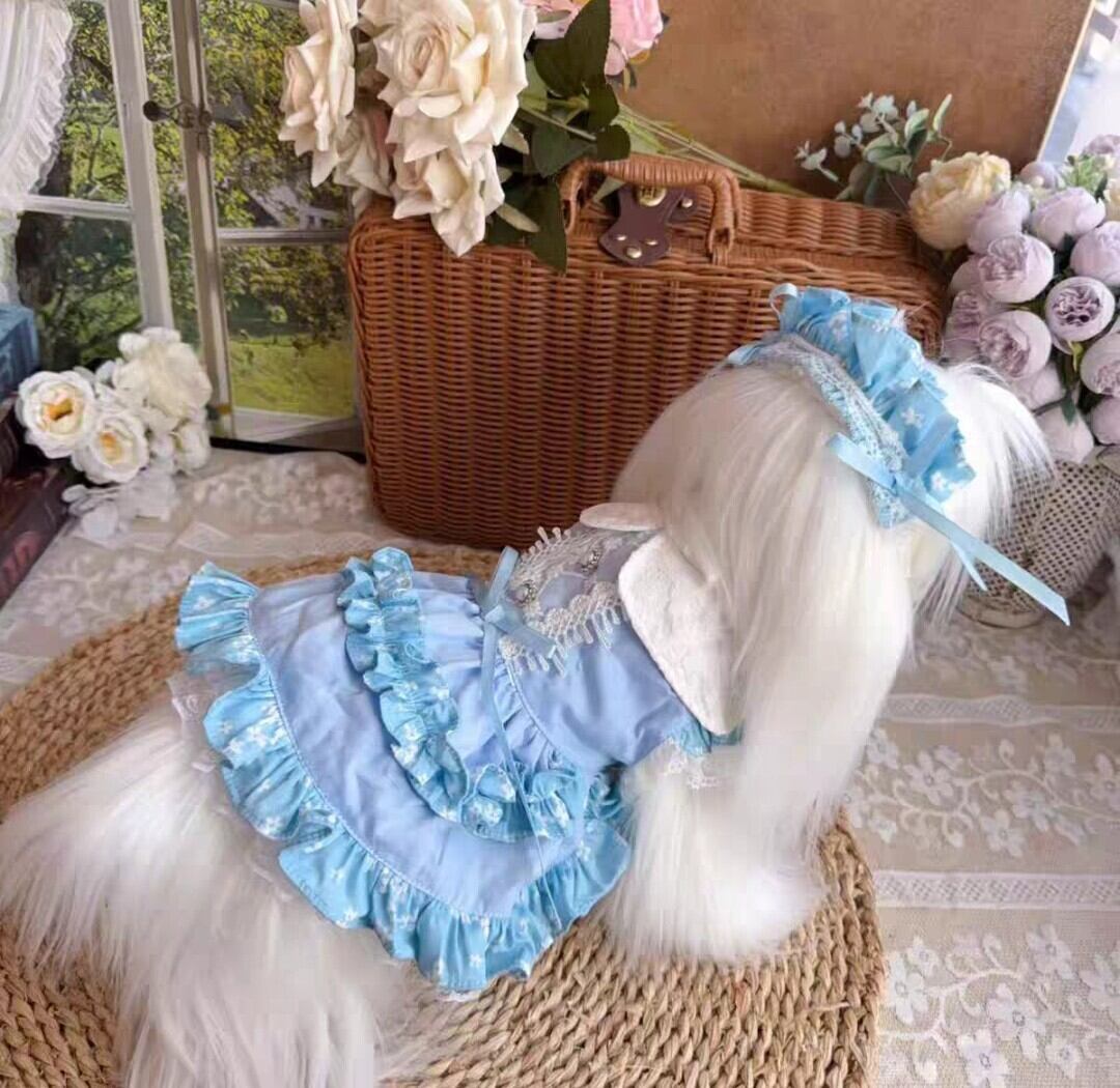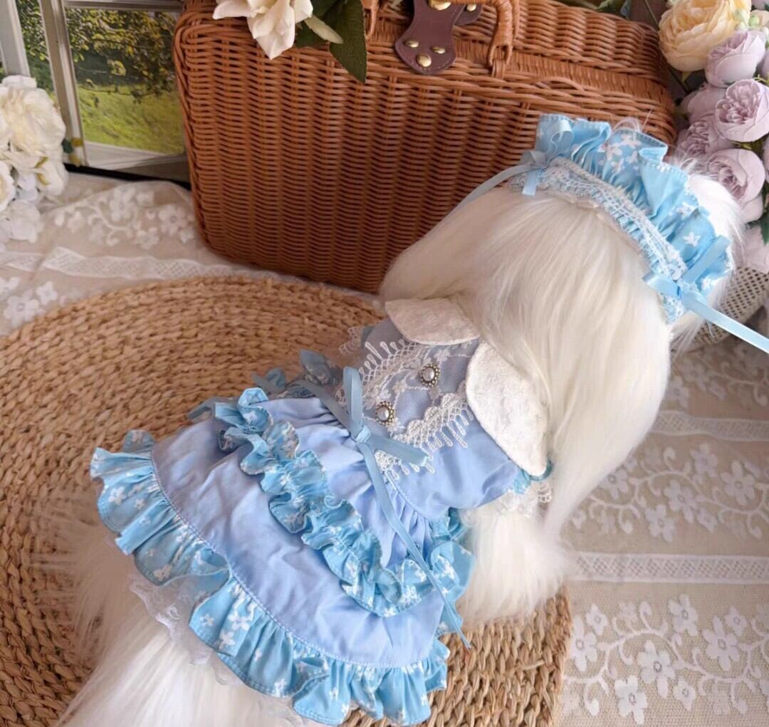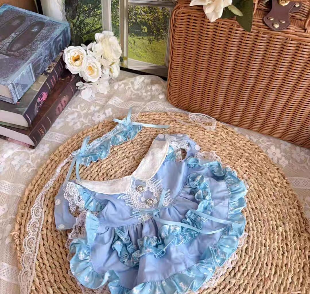 白い襟とギャザーフリルが可愛い水色のワンピース♡背中のレースやパールの飾りボタンも素敵です。