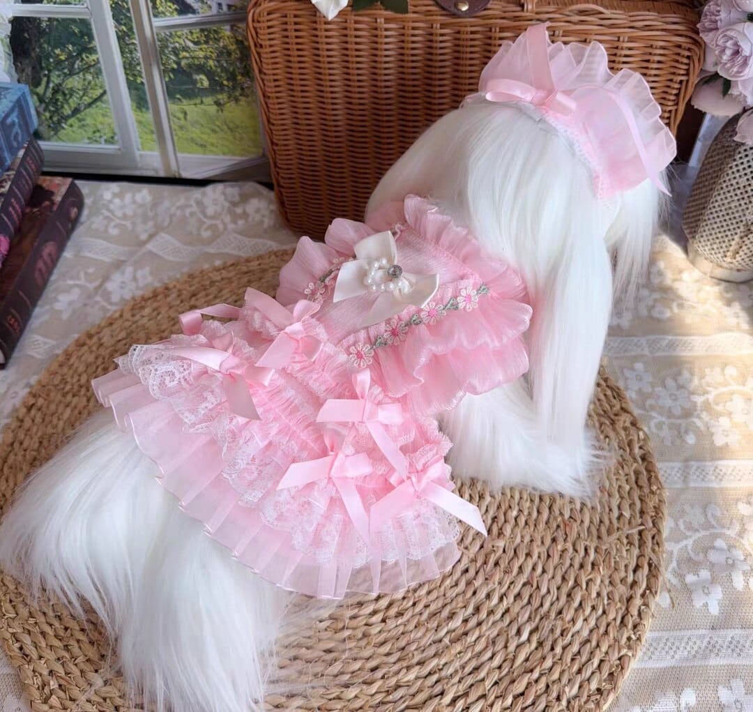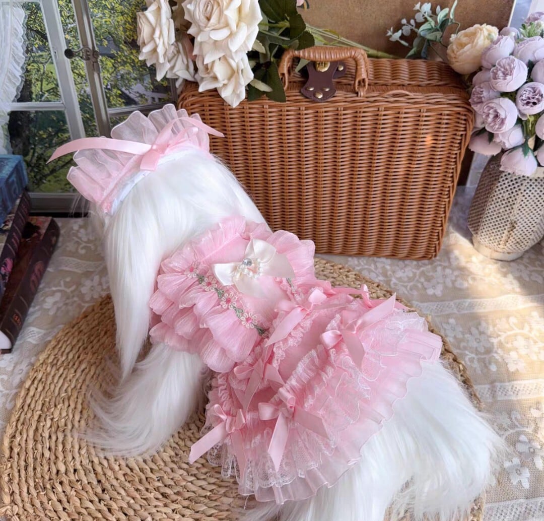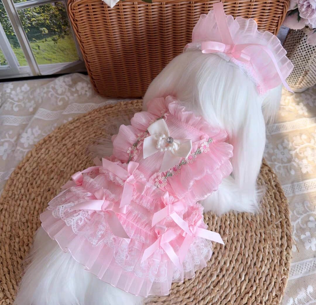 背中にはお花の刺繍レースとホワイトリボン。ワンピース全体にリボンやフリルがほどこされたラブリーなピンクのワンピース♡