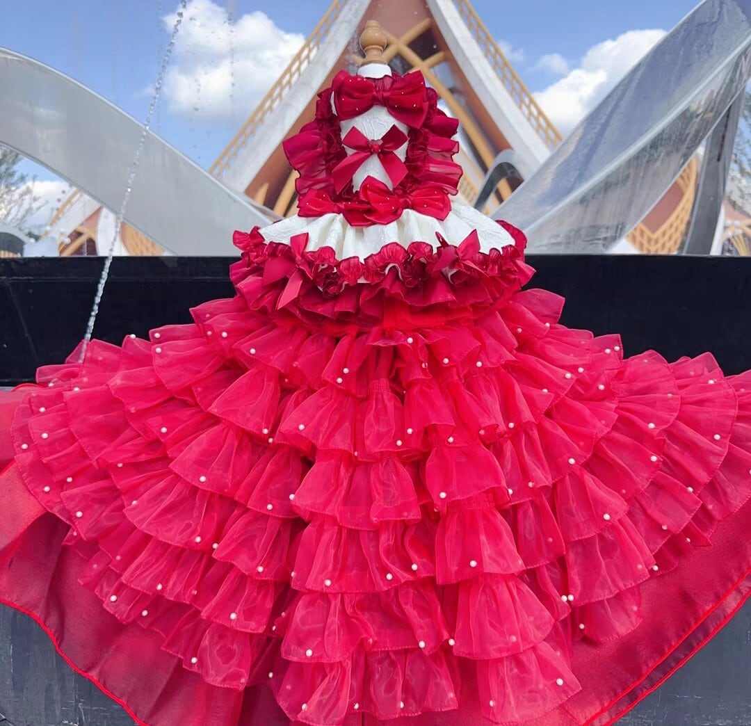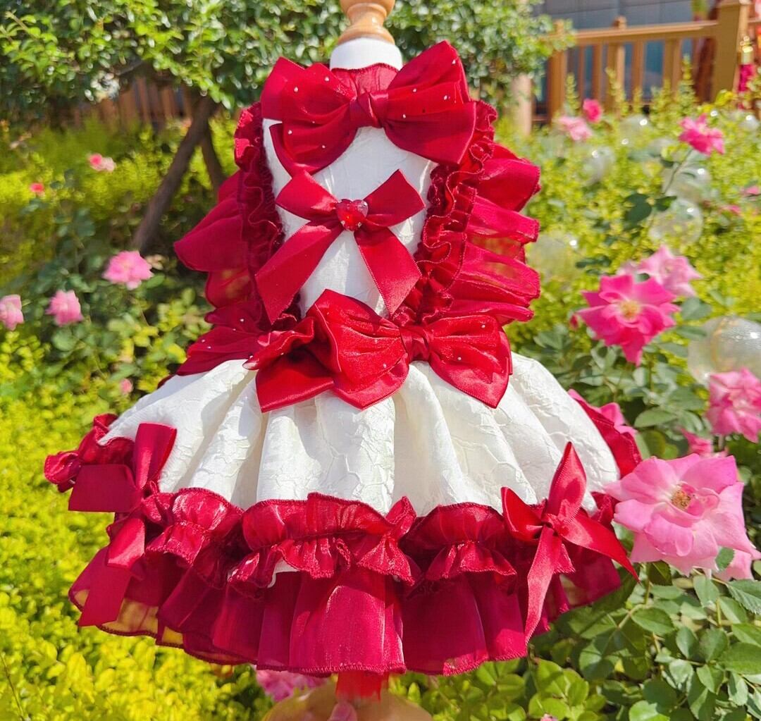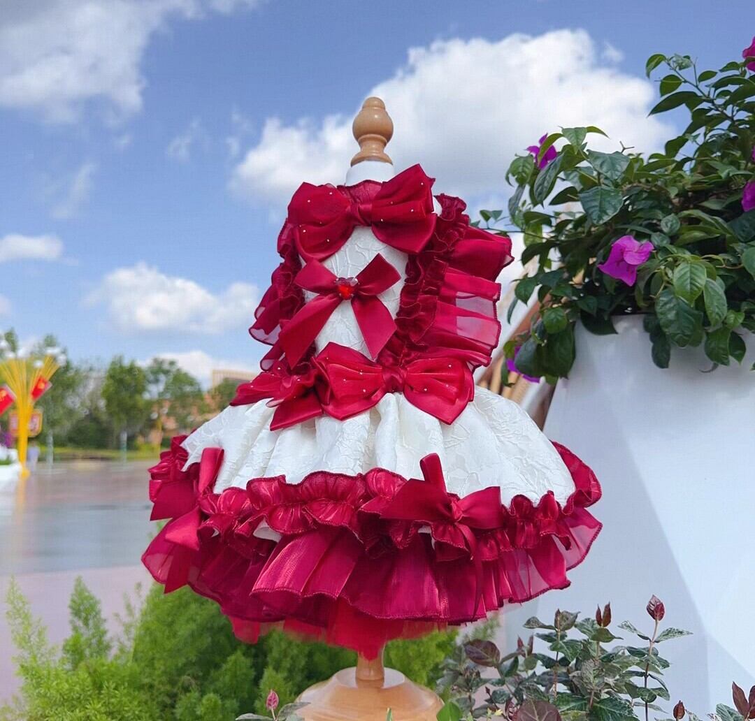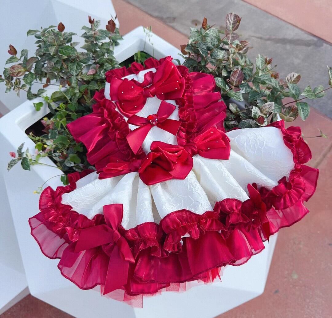 胴回りはホワイトで、レッドリボンやレッドフリルが引き立ちます。ロングドレス部分のフリルには小さなパール飾りも施されています。