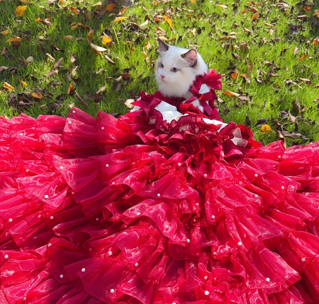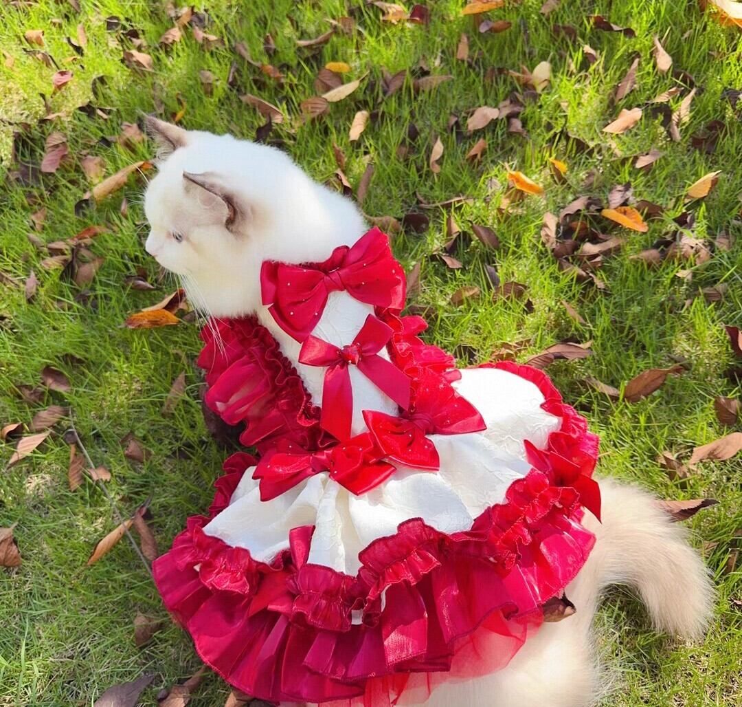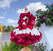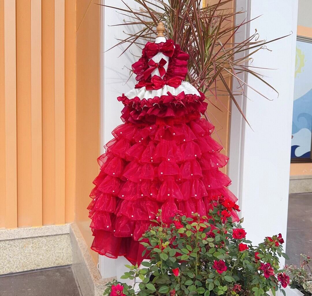 胴回りはホワイトで、レッドリボンやレッドフリルが引き立ちます。ロングドレス部分のフリルには小さなパール飾りも施されています。