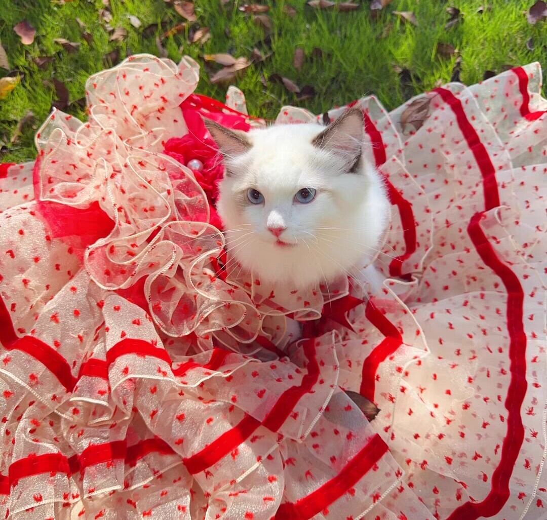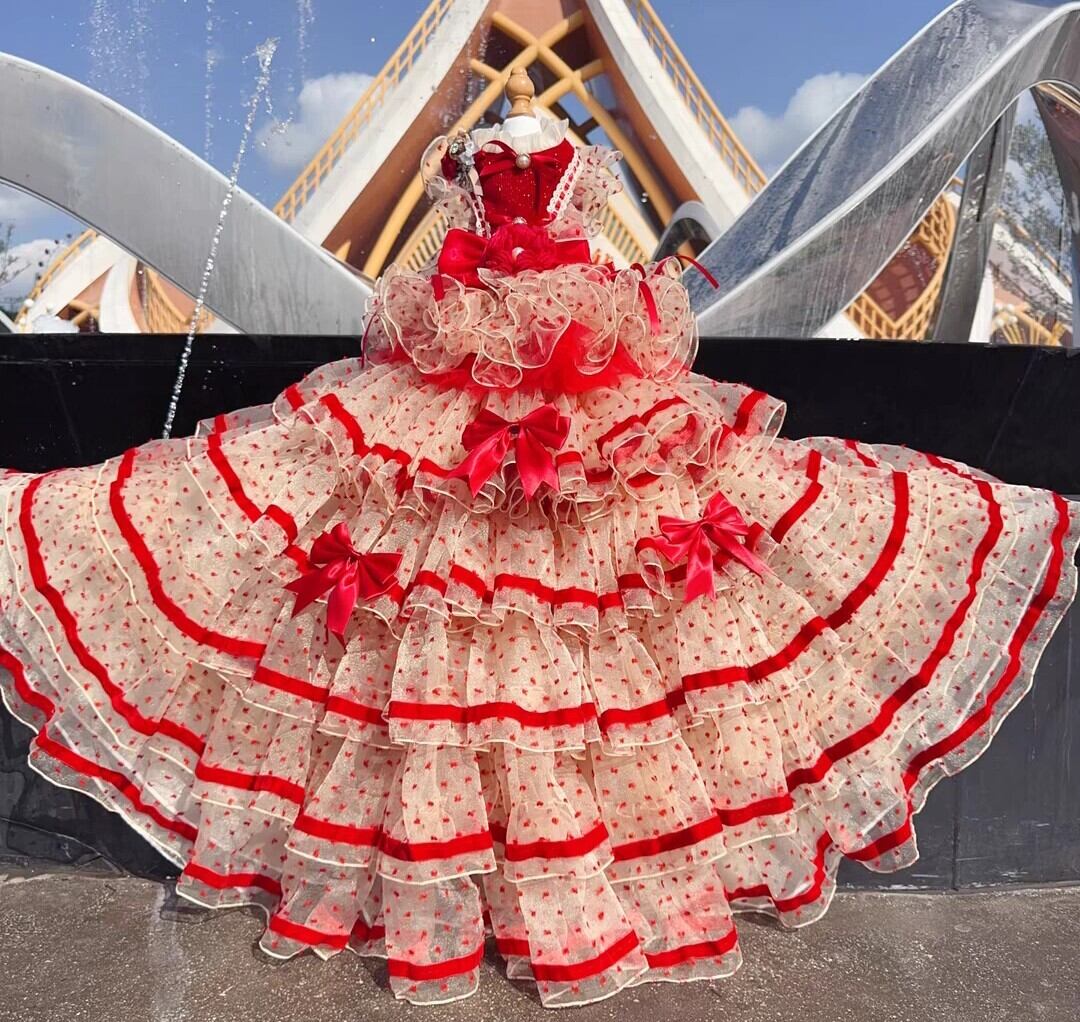 情熱的な赤と何層ものシフォンドット柄フリルでフラメンコをモチーフにデザインされたゴージャスな仕上がりです。