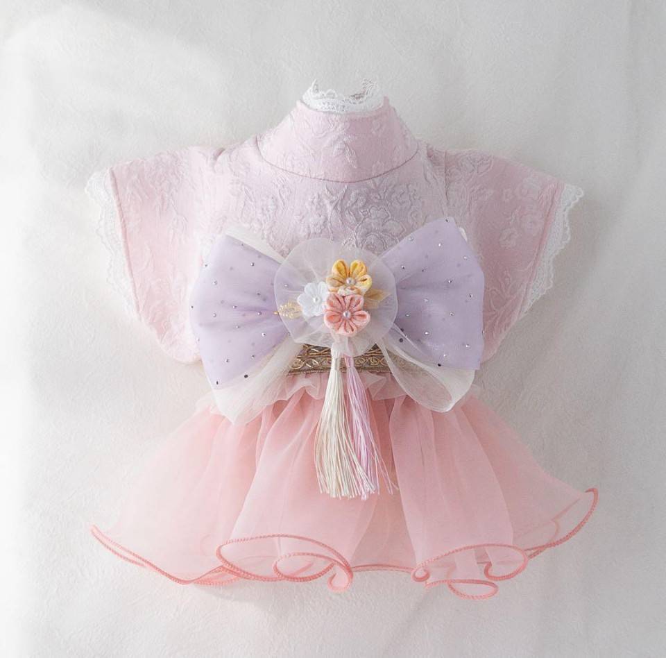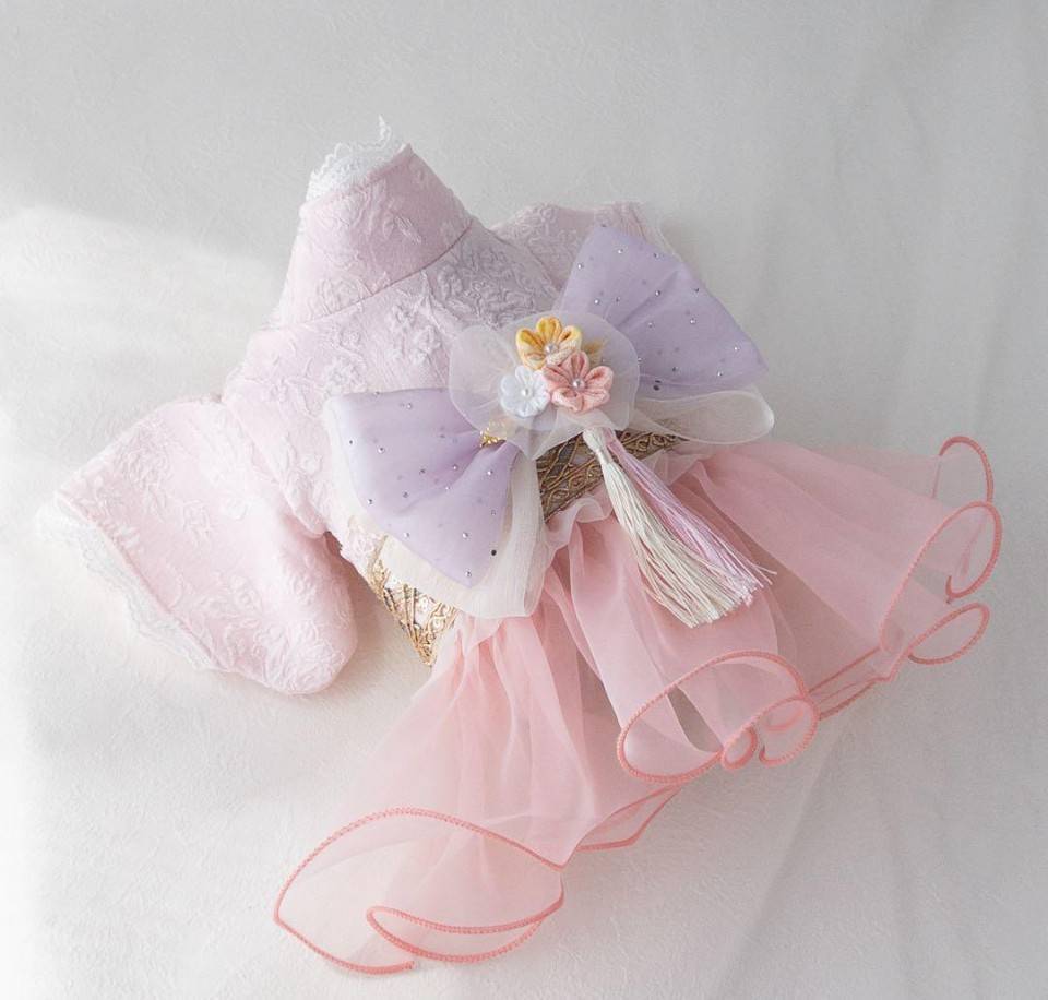 帯から下はドレスになっている、立体感のある花模様ピンク生地の着物ドレスです♡