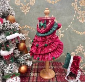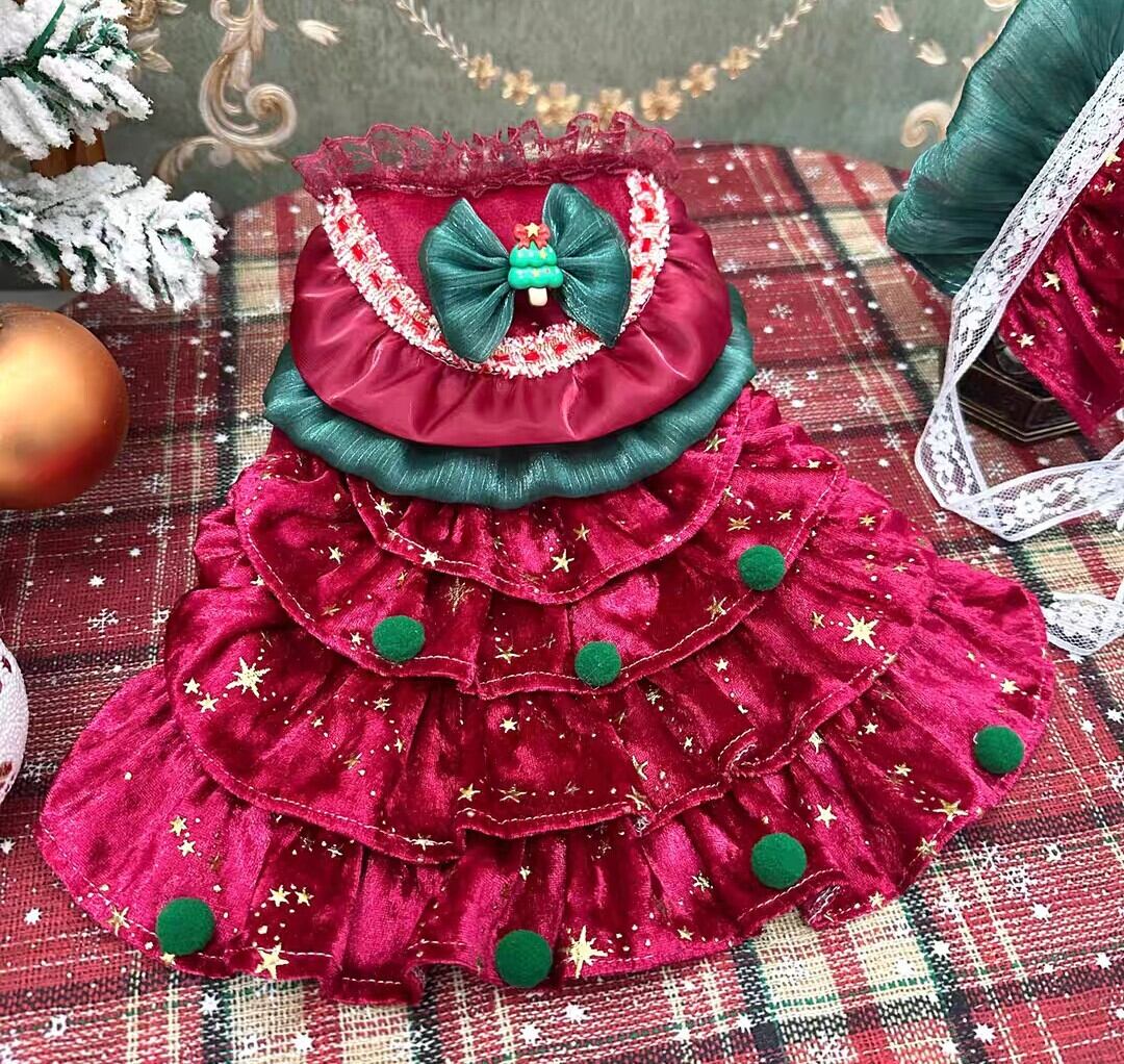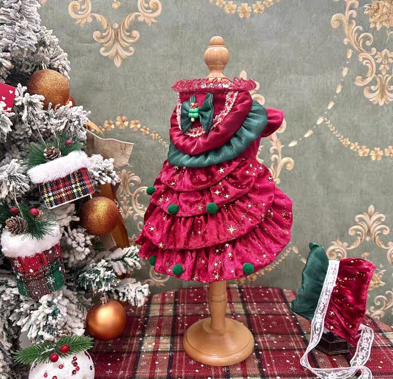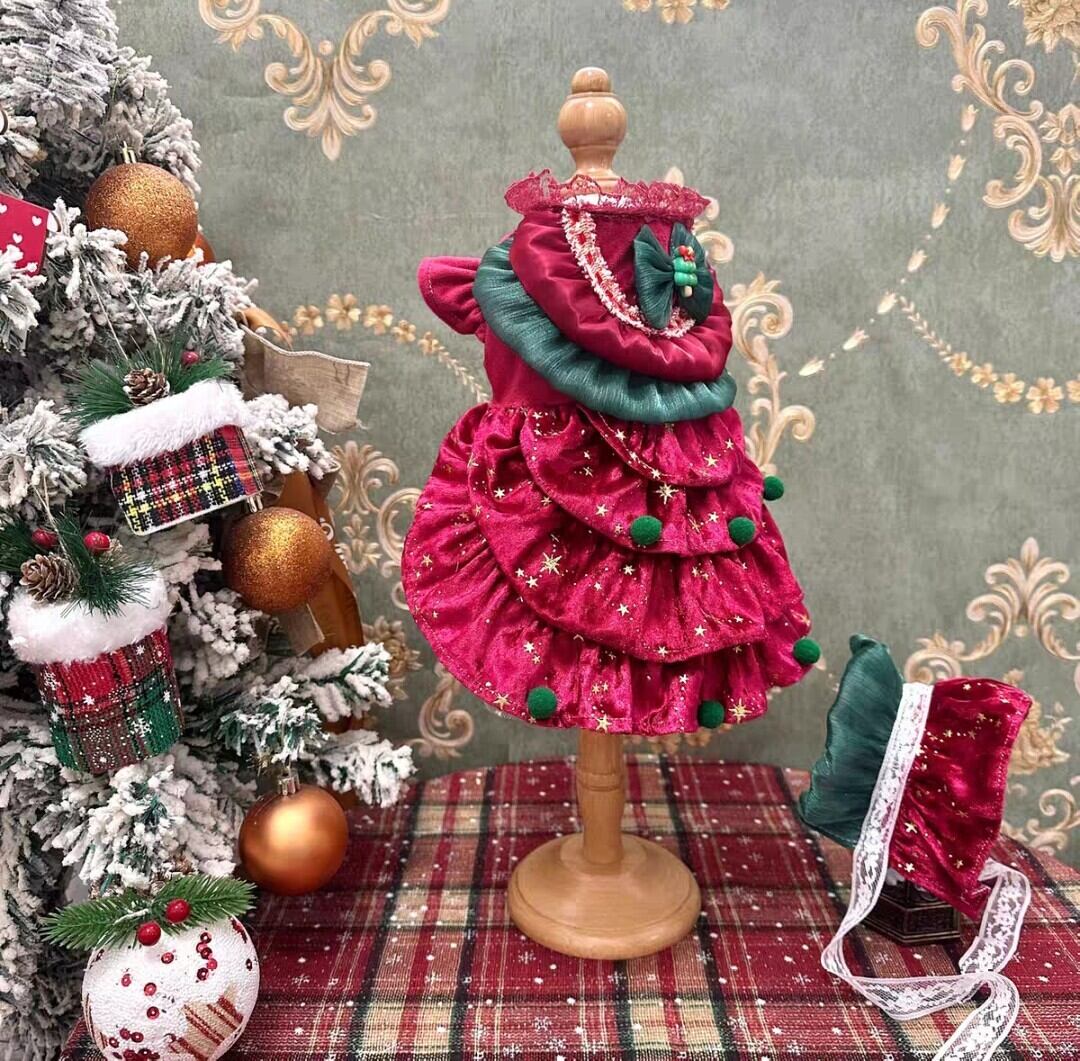 お星さま柄の入ったワインレッドに、グリーンのリボンやポンポンで飾られたクリスマスワンピース♡