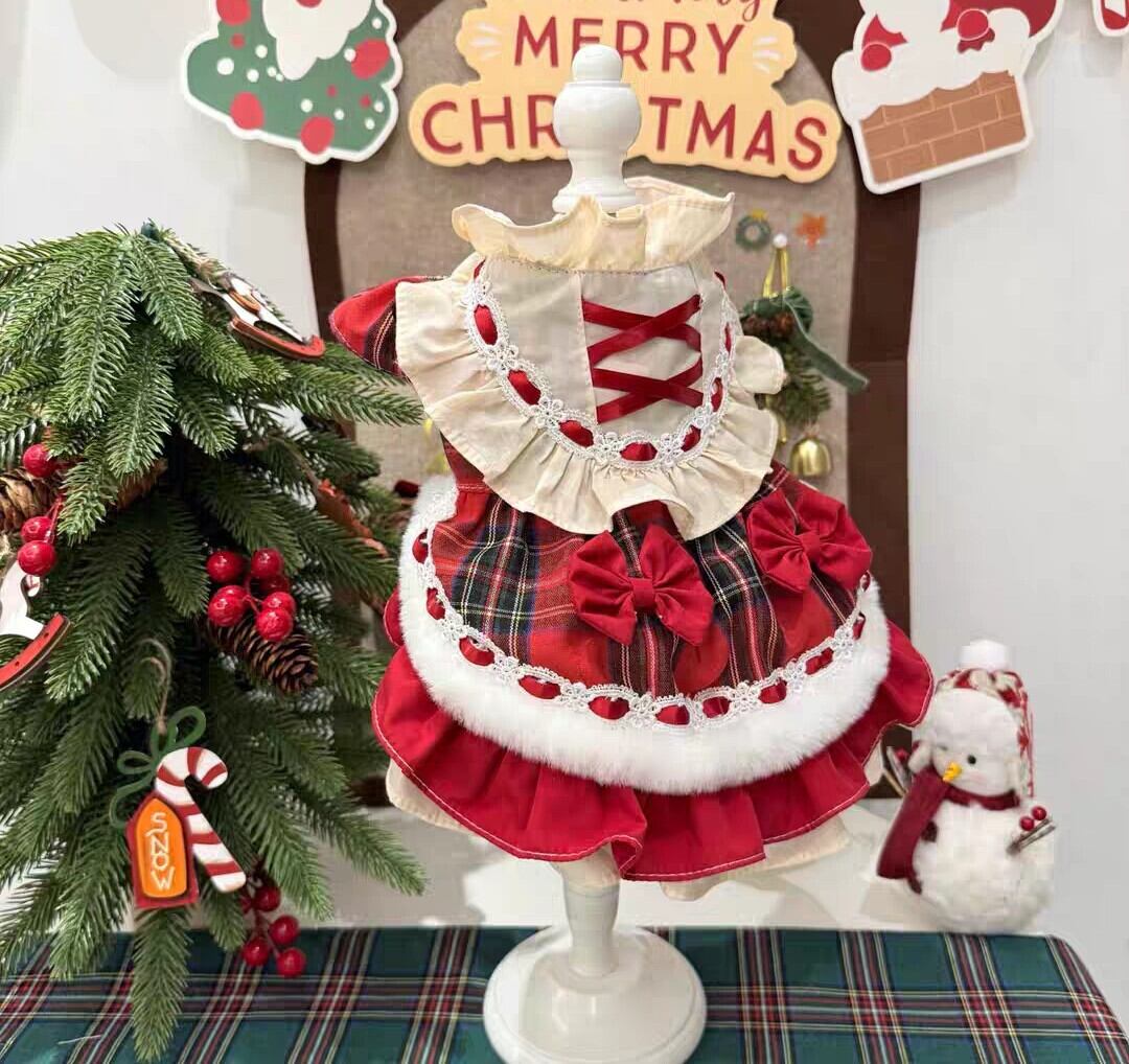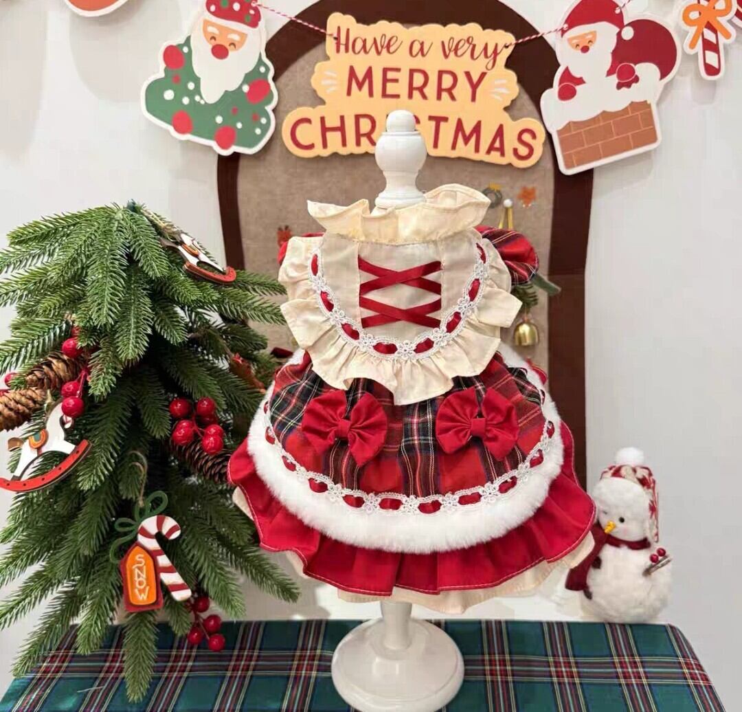 背中のベージュフリルも可愛らしい、チェック柄のワンピース♡赤いリボンも付いています。