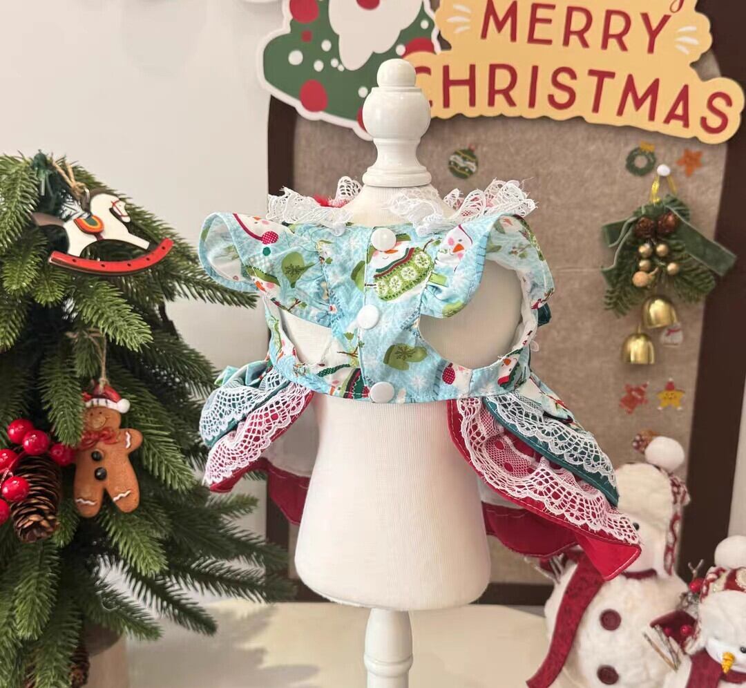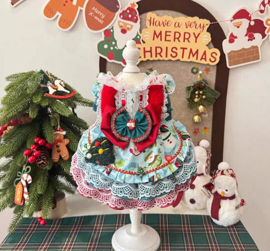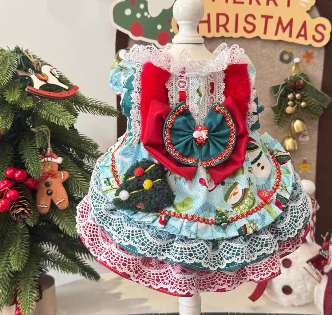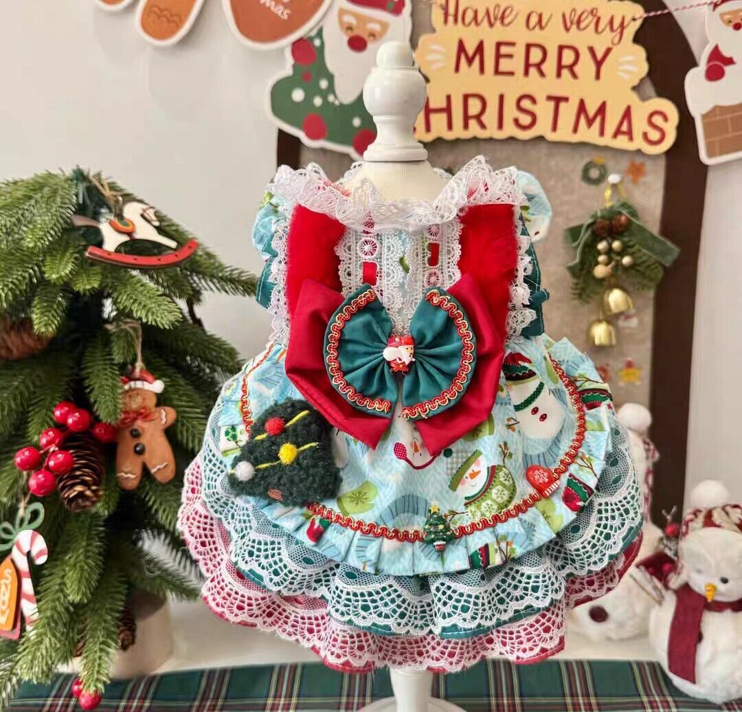 クリスマスツリーのモチーフ付き。雪だるま柄のプリント生地の可愛らしいワンピース♡
