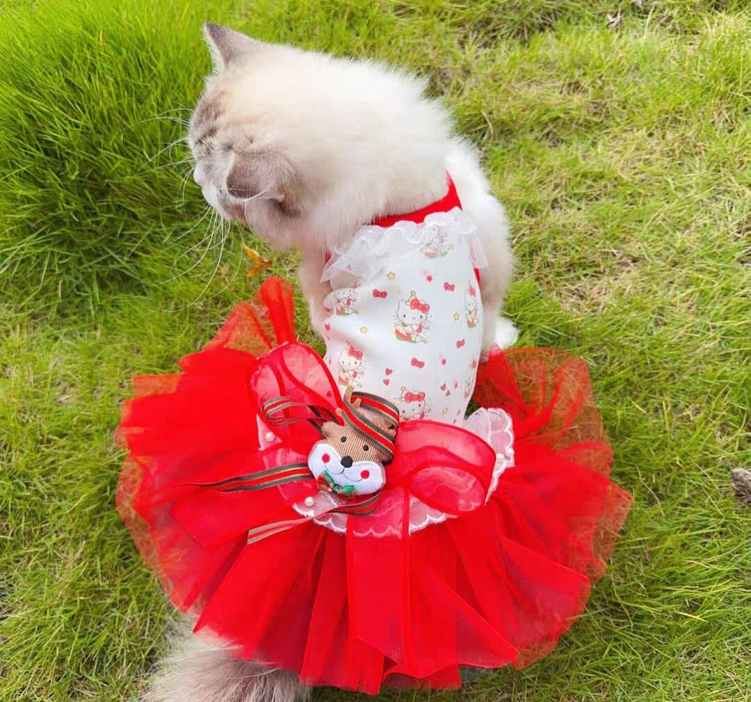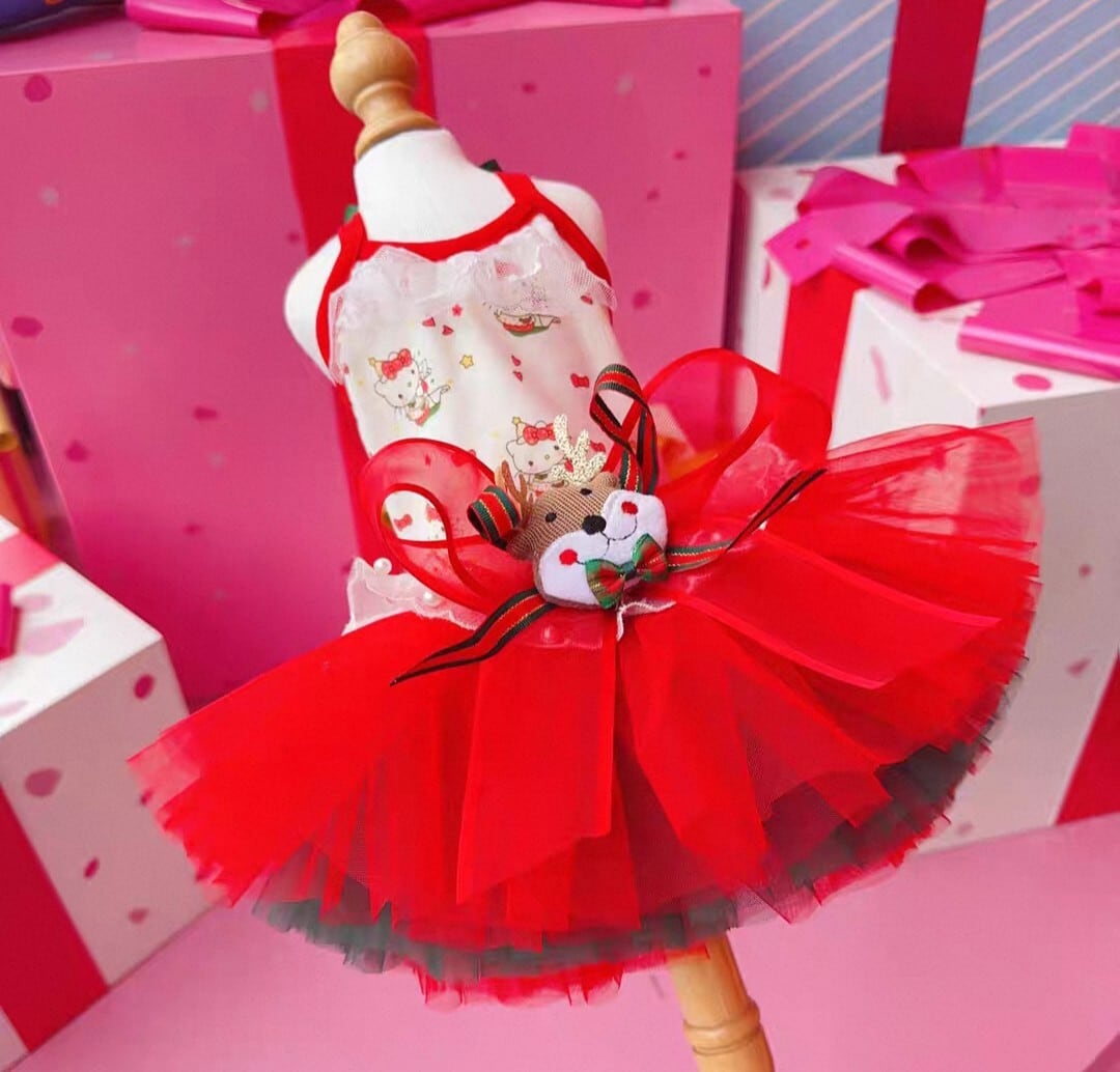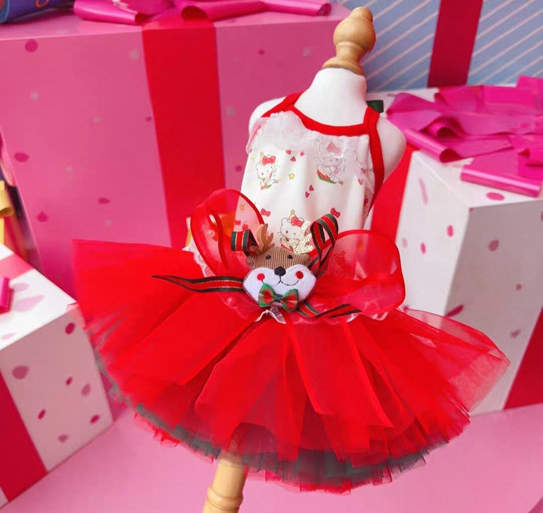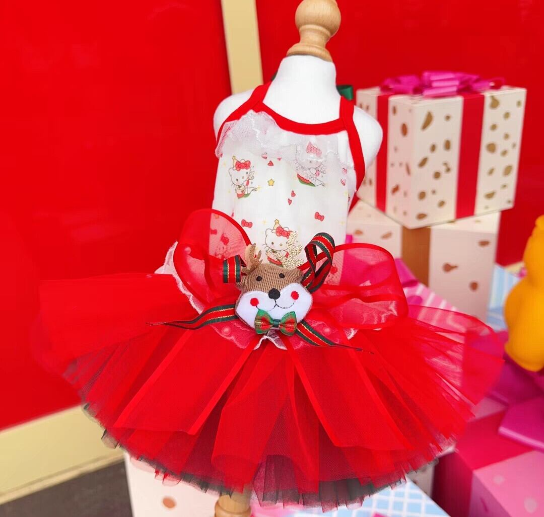 腰のリボンにトナカイモチーフ付きの、赤いフレアドレス♡