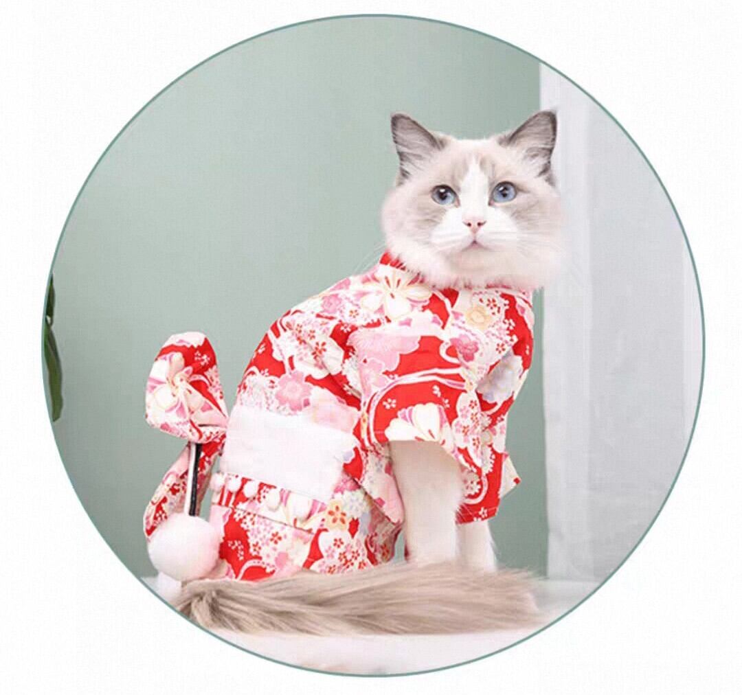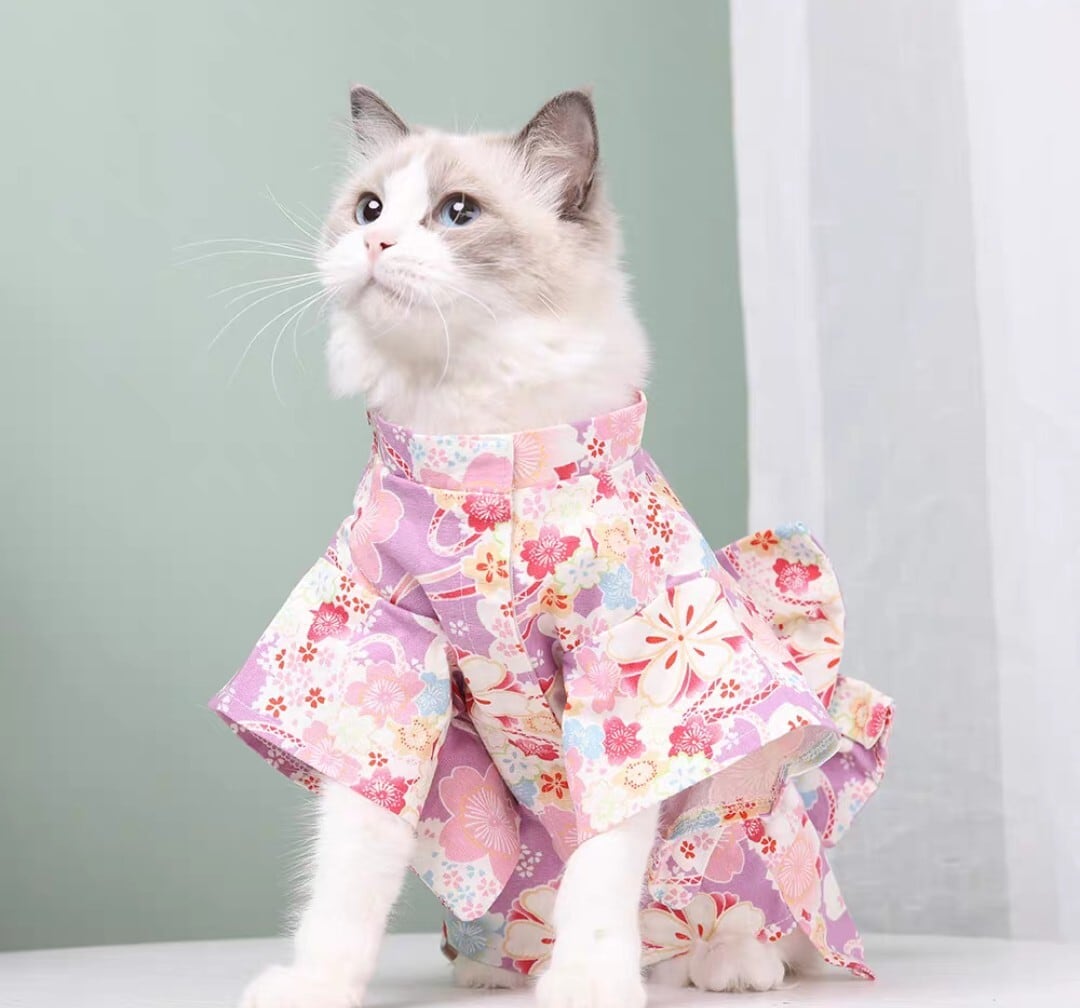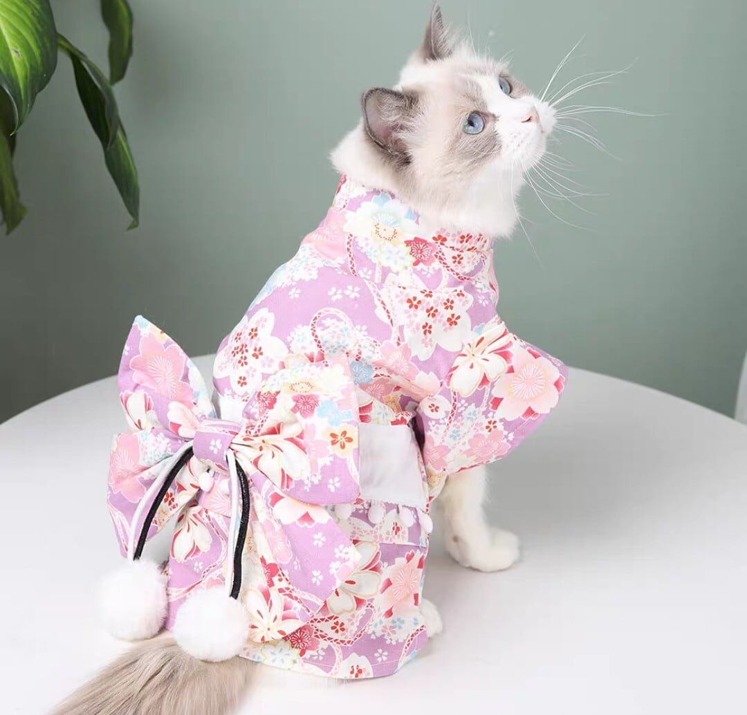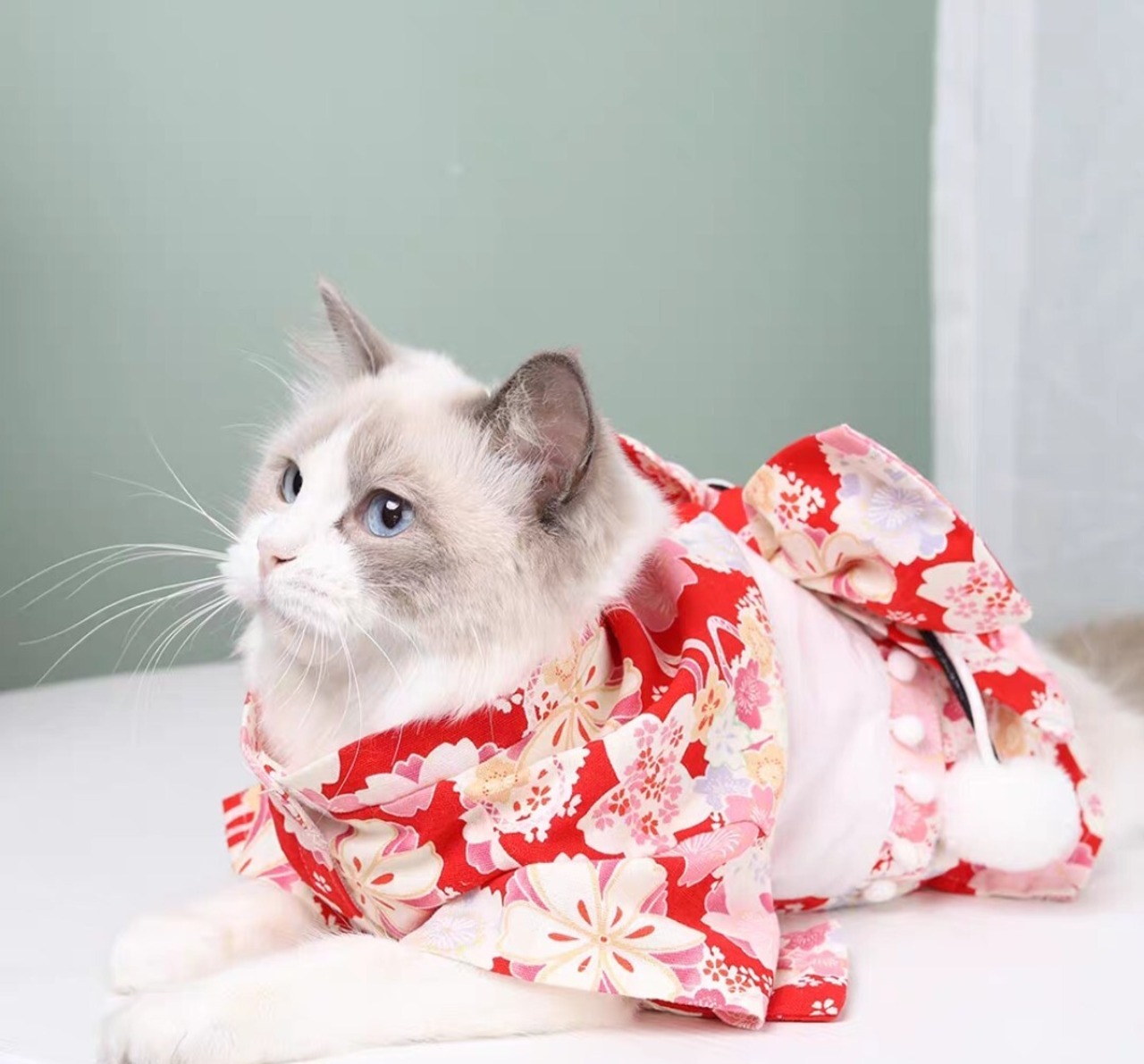 リボン帯にふわふわのポンポンが付いた、華やかな花柄の和装♡