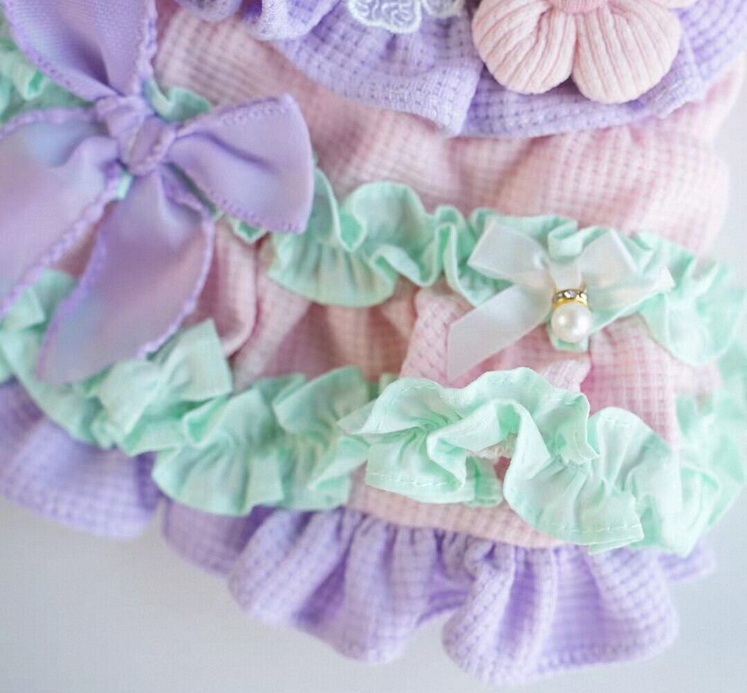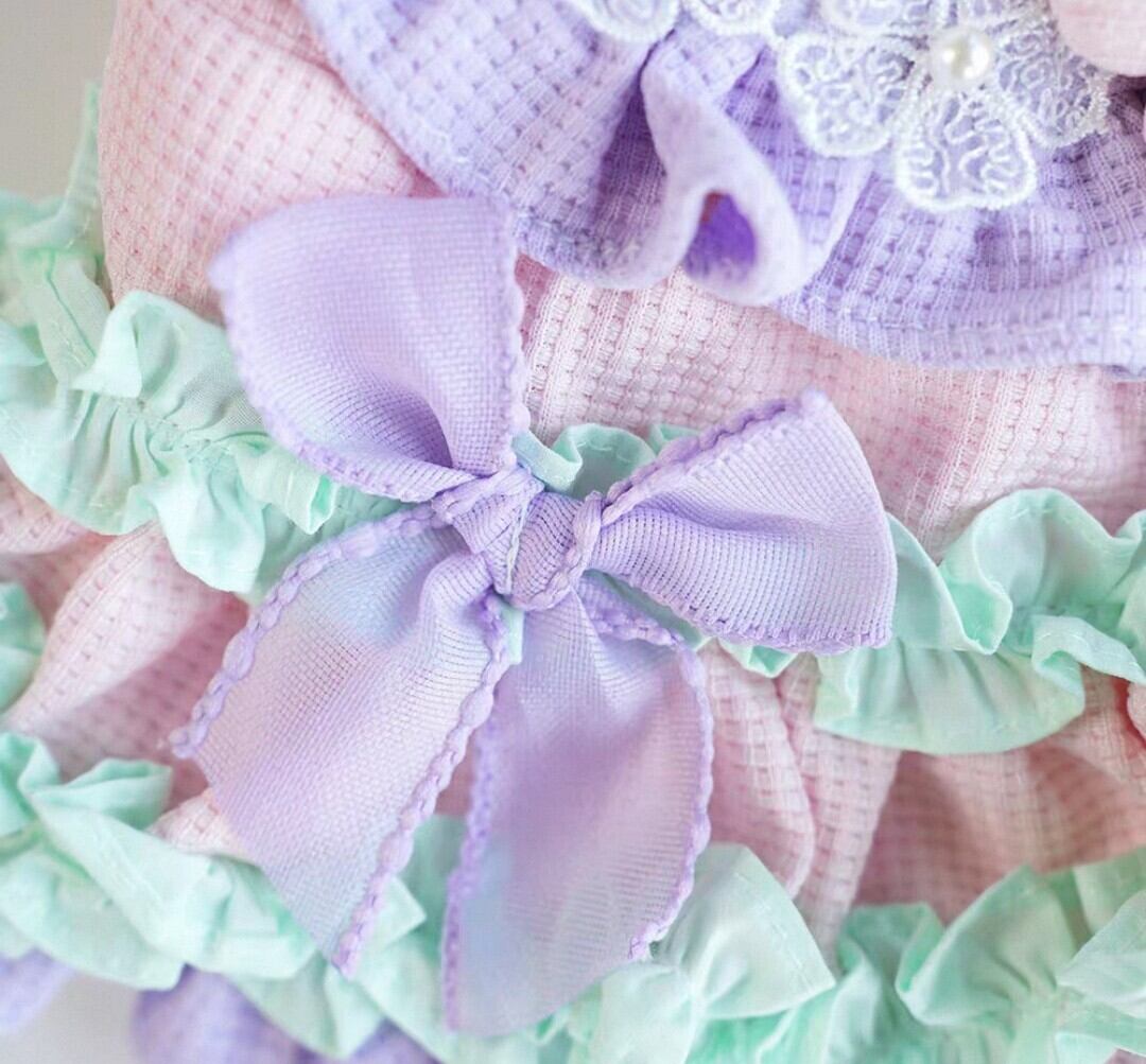お花モチーフ、パール飾りのレース、リボンモチーフなど、可愛い、ラブリーが詰まったパステルカラーの優しい色合いのワンピース♡