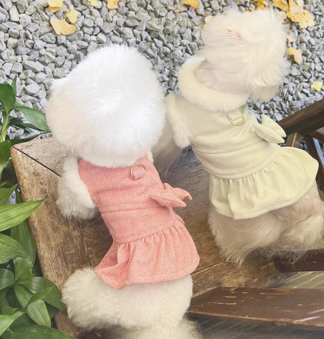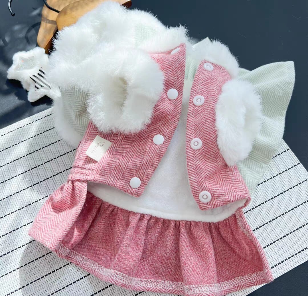 首周りと袖口のホワイトのフェイクファーが可愛らしい、ヘリンボーン柄のワンピース♡