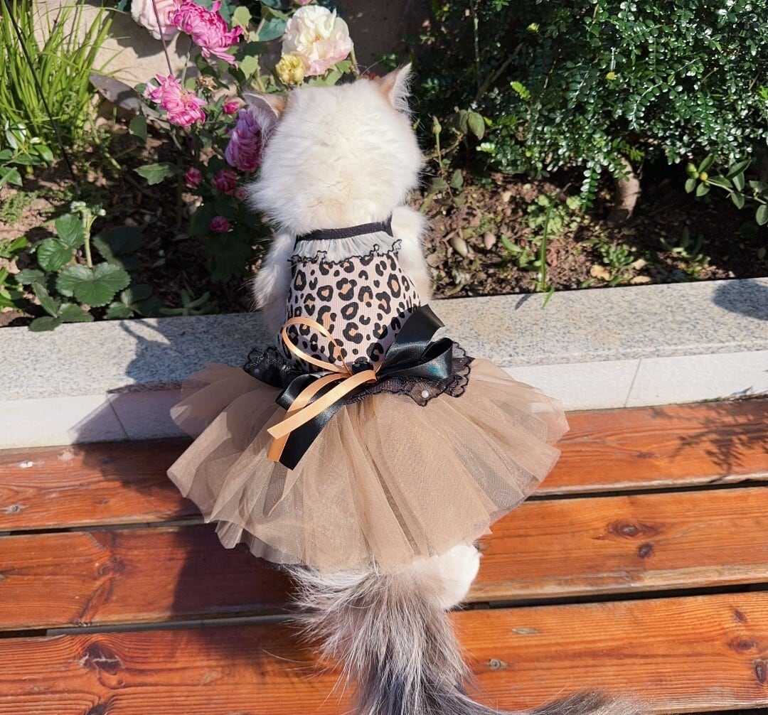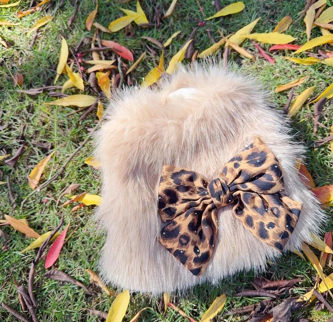 ファーベストにも豹柄のリボン付き。ベストのカラーは、ホワイト、ベージュ、ブラックの3カラー。ご購入の際にはベストのカラーでサイズをご選択ください。