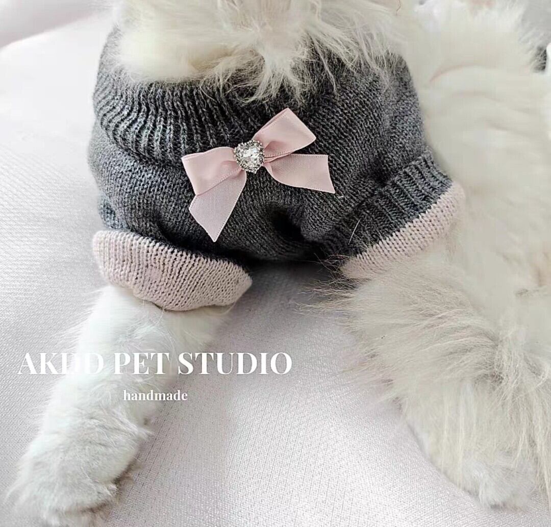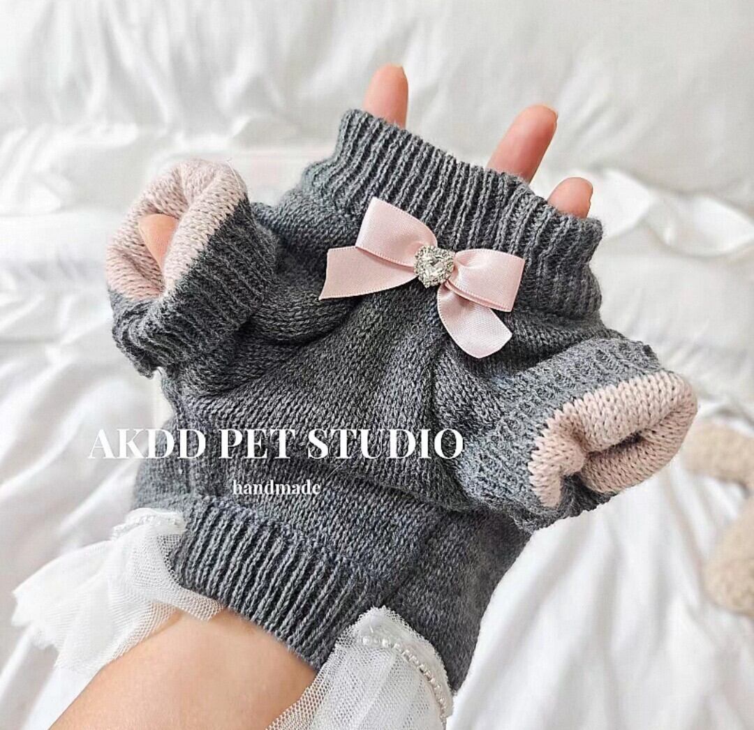 前と後ろにビジュー付きのピンクリボンが付いた、グレーのニットワンピース♡裾にはホワイトのフリルで女の子らしい可愛いデザインです。