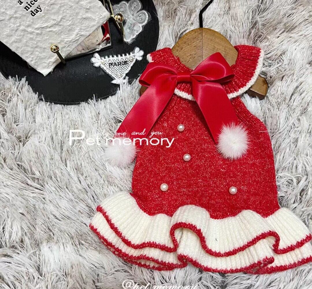 ファー付きの長いリボンも可愛らしい、ニットの赤いワンピース♡
