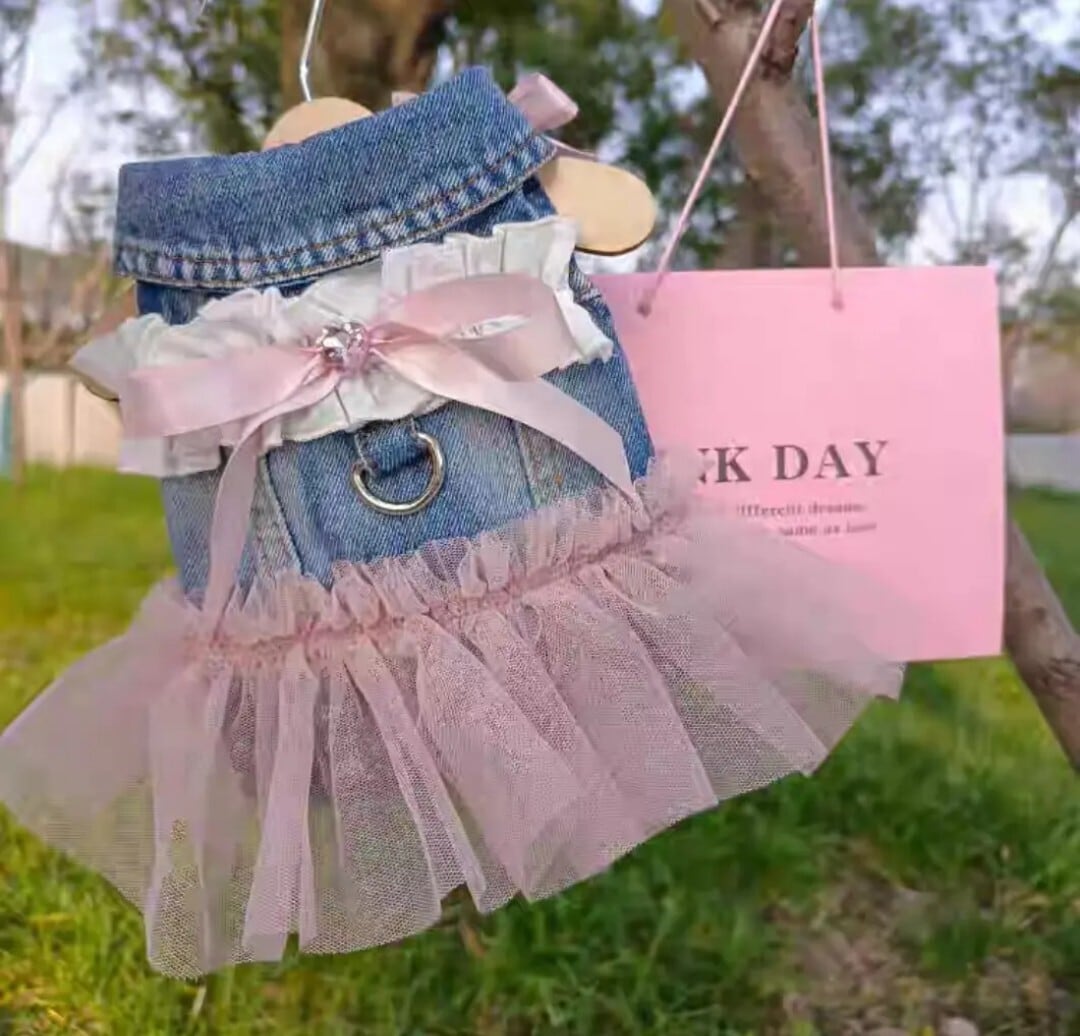 デニムにピンクのレースやリボンが付いた可愛いワンピース♡