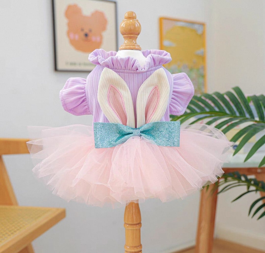 腰のリボンとうさ耳が可愛らしい、胴回りはパープル、フリルはピンクのラブリーなドレス♡