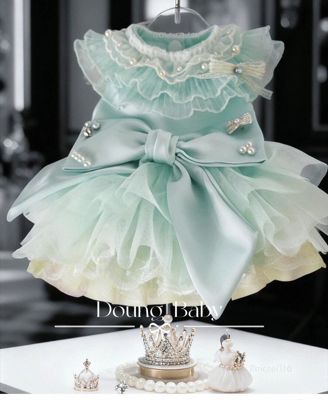 首周りはフリルになっていてパール飾りやリボンも付いています。腰のリボンにも、4隅に様々なパール飾り付き。