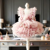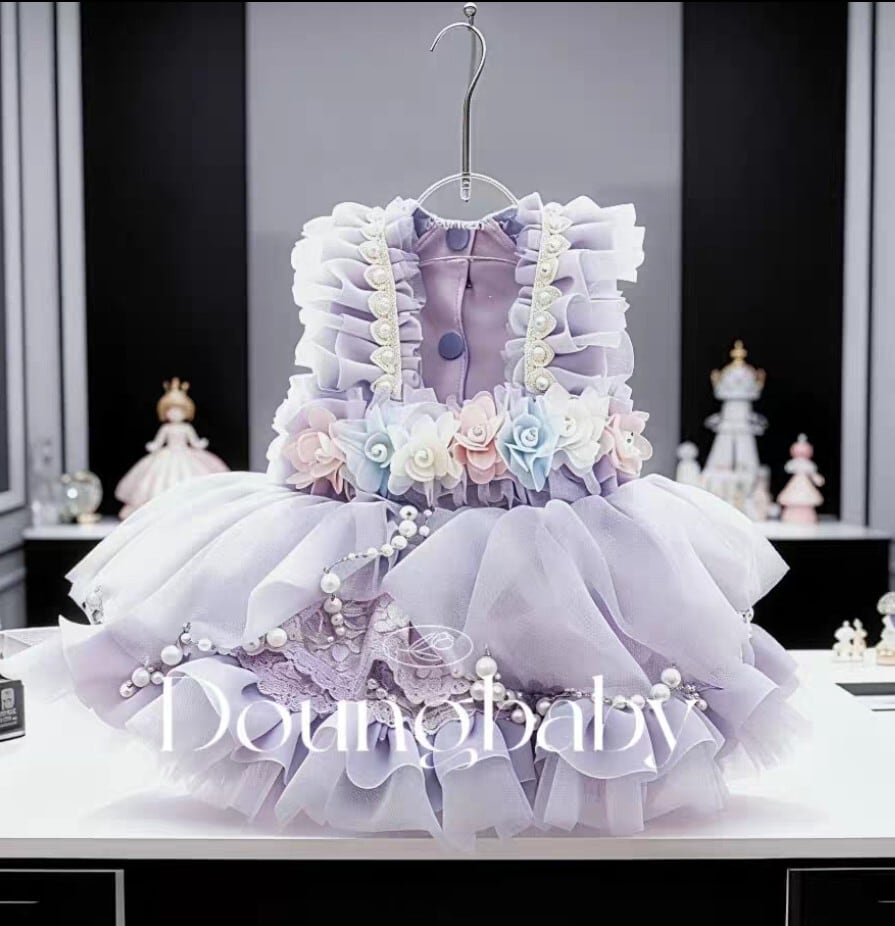 肩から腰にかけてはパールで飾られたフリルデザイン、腰には立体フラワーモチーフが並べられた豪華なデザイン。スカート部分もフリルたっぷりで、パールチェーンもあしらわれ、どこを見ても可愛いが溢れたドレスです。