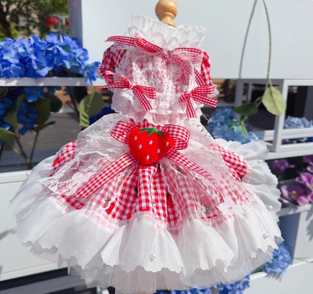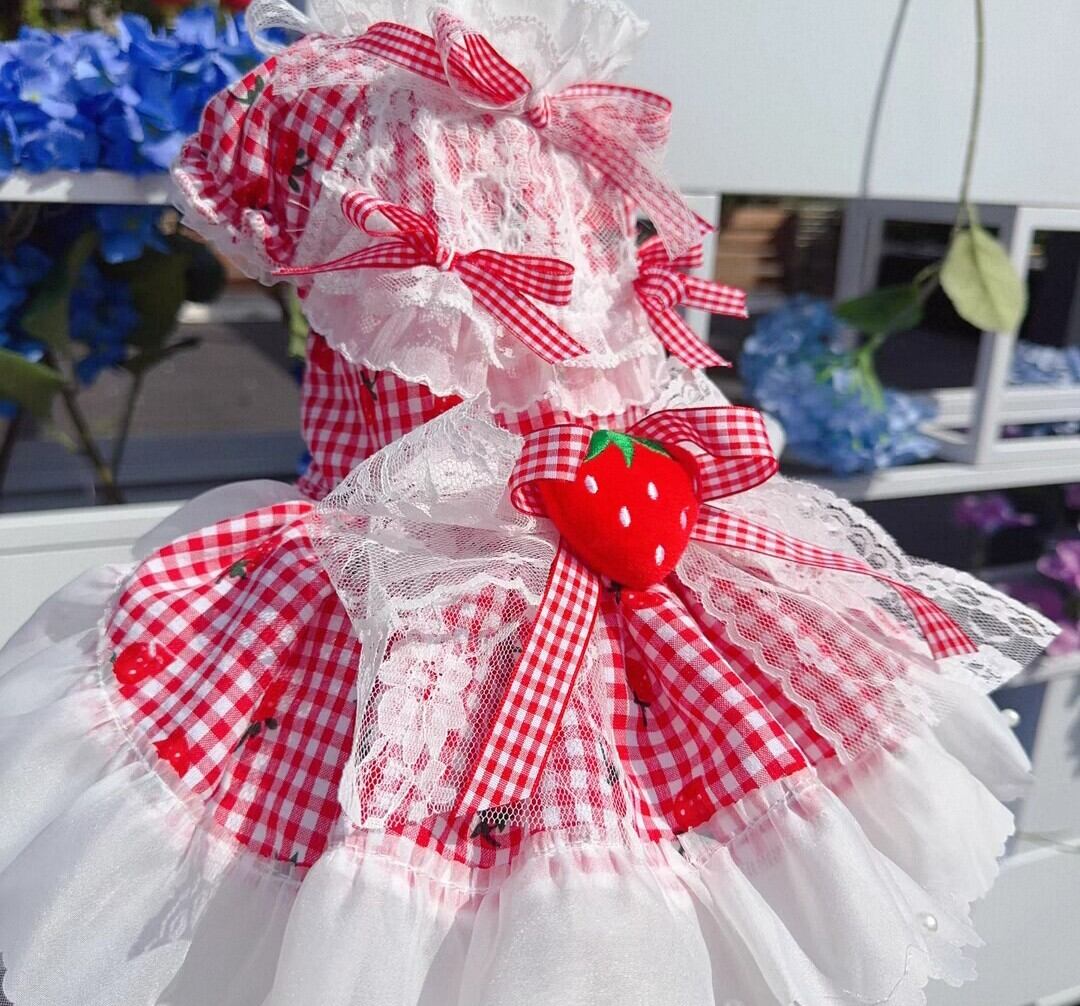 赤いチェック柄にホワイトのレースやフリルが女の子らしさを可愛く演出。とても可愛らしい、ぷっくり苺モチーフが腰に付いたドレスワンピース♡