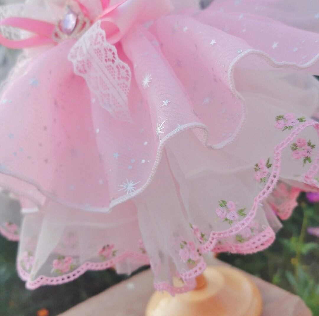背中のローズモチーフとキラキラフリルがキュートな鮮やかなピンクのドレス♡胸元やドレスの裾に小さな薔薇のレースも使われています。