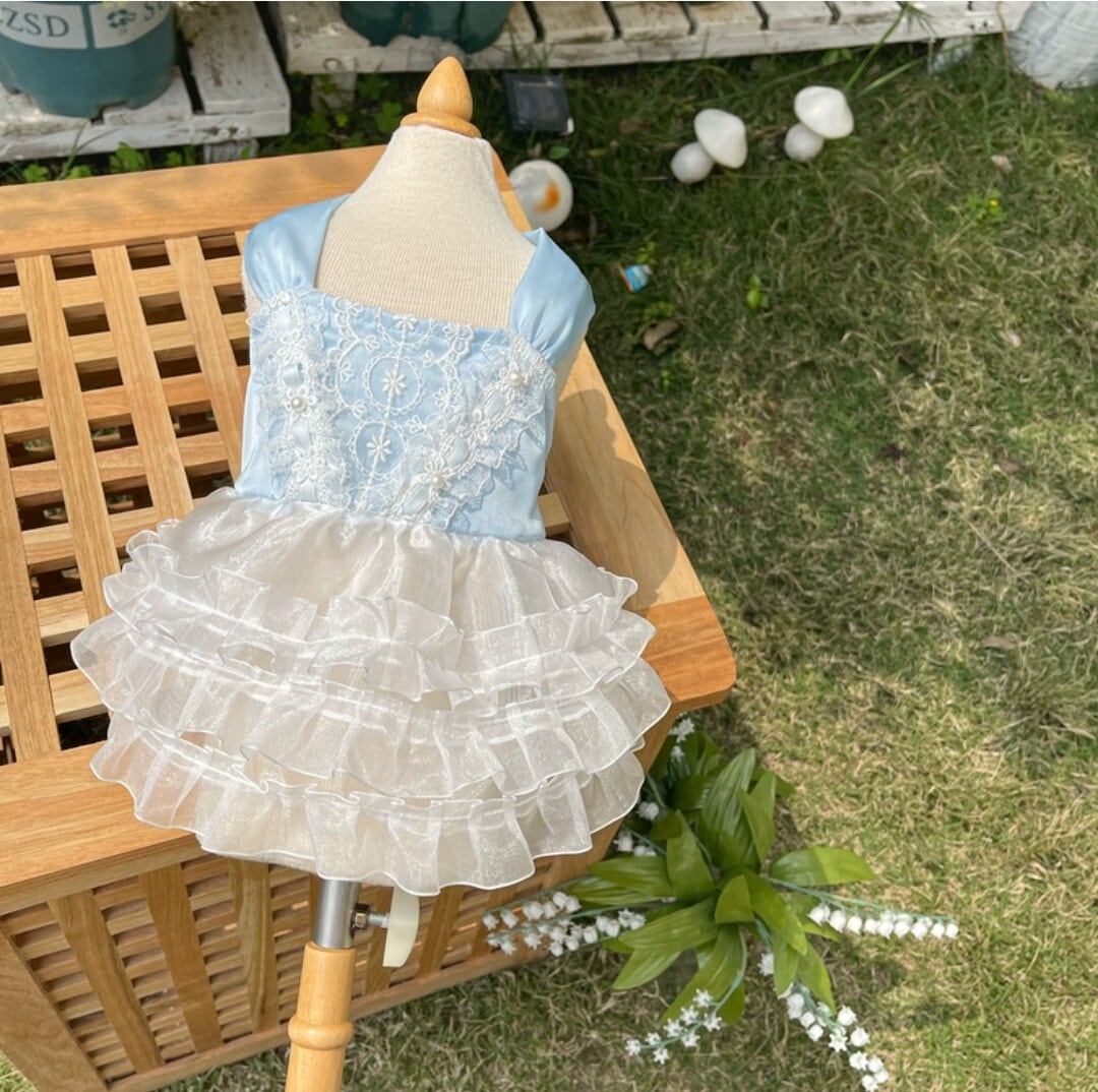 純白の透け感のあるレースと背中のレースモチーフが可愛い水色のサンドレス♡上品なお嬢様ドレスです。