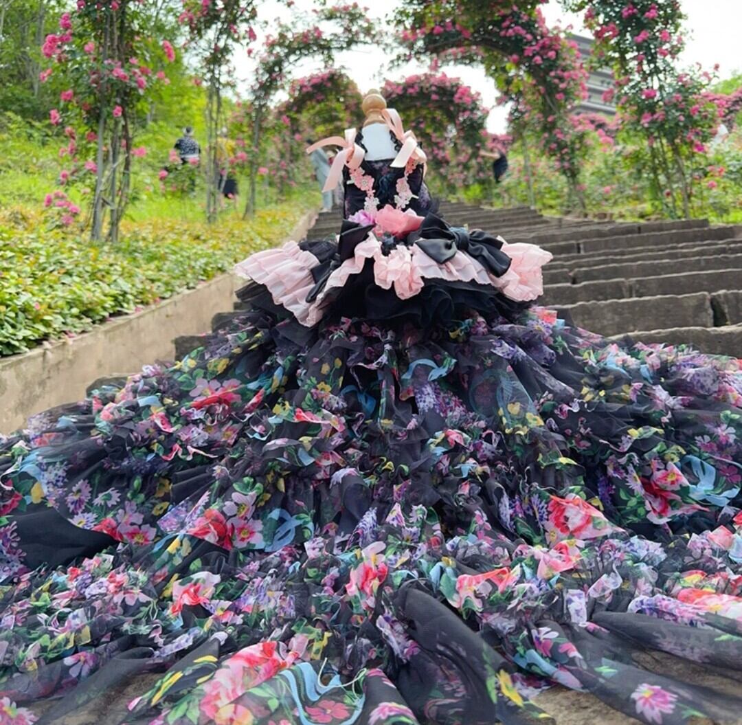まるでお花畑のようなお花の飾りやレースがたっぷりの彩りが素敵なブラックサンドレスの2wayロングドレス♡