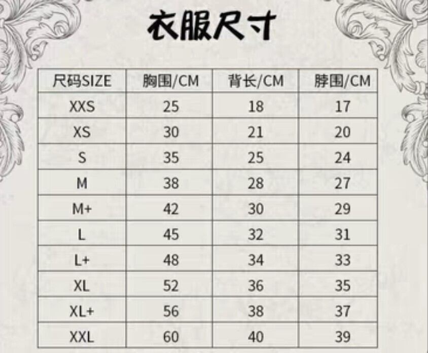 サイズは最後の画像でご確認の上、ご注文をお願いいたします。サイズ表は、胸囲、着丈、首周りの順にサイズが載っています。