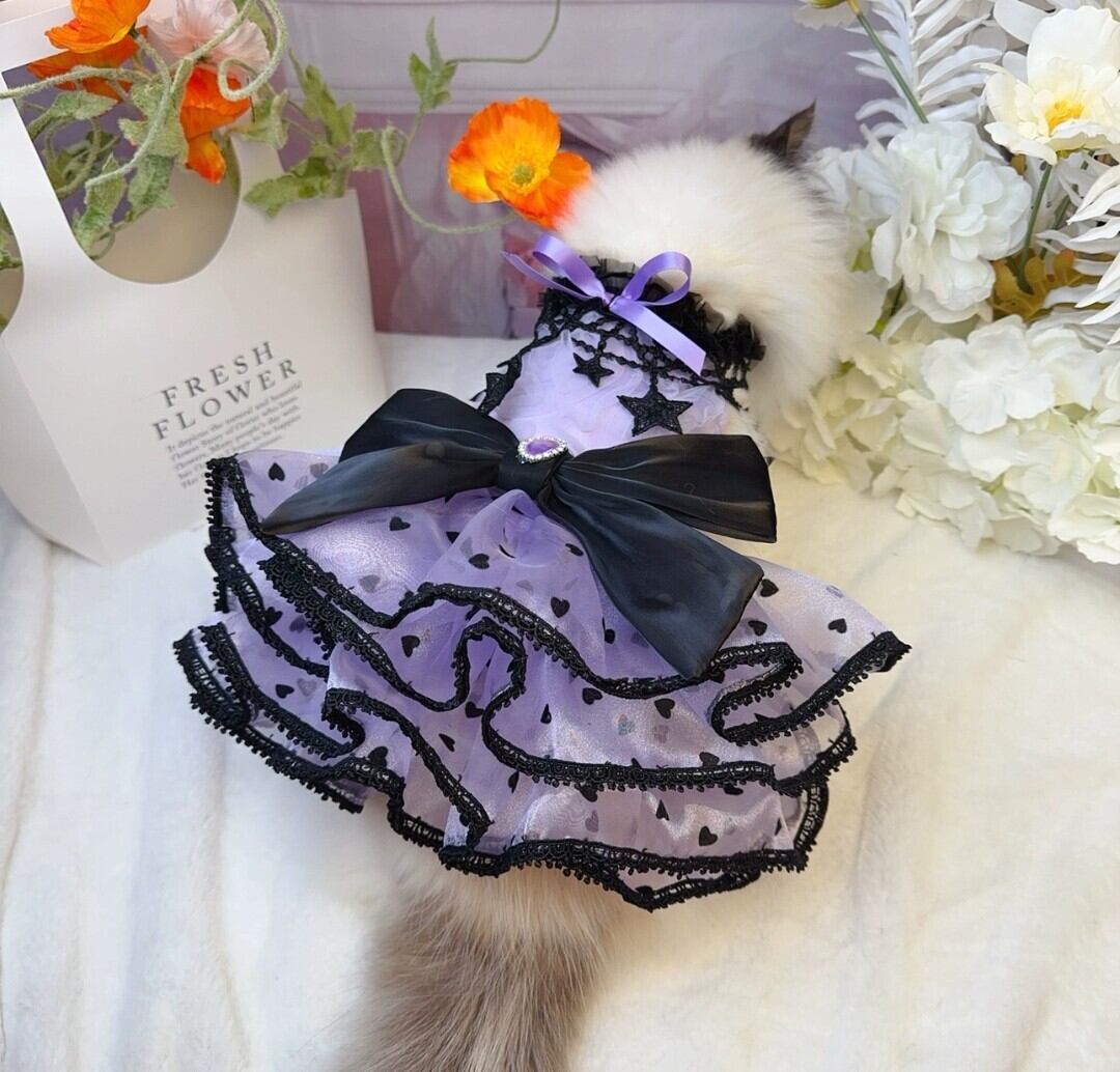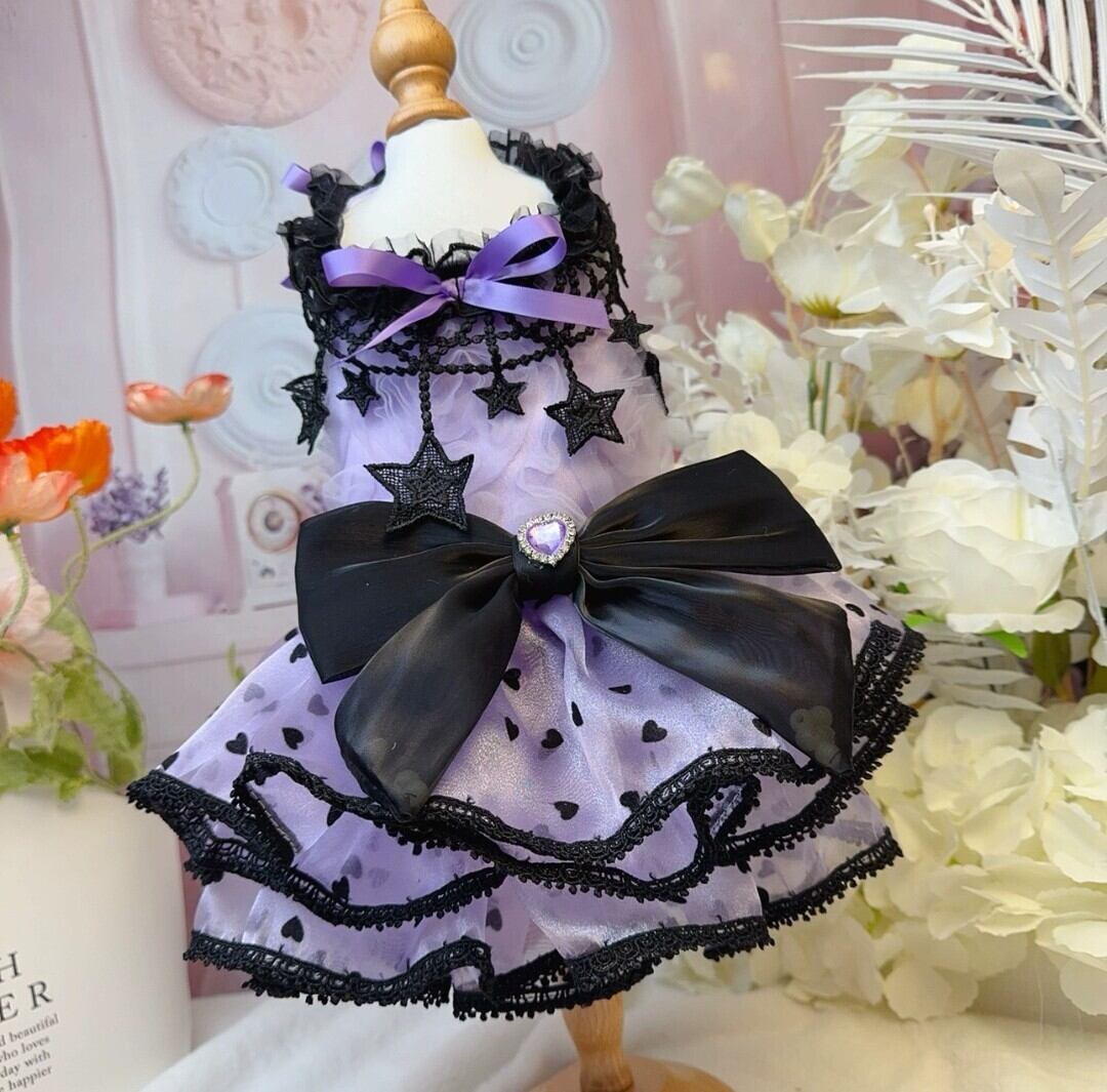 首周りにお星さまモチーフがゆらゆら、ドレスのフリフリ部分にはハート柄のチュールが使われた、ブラックリボンも素敵なパープルのドレス♡