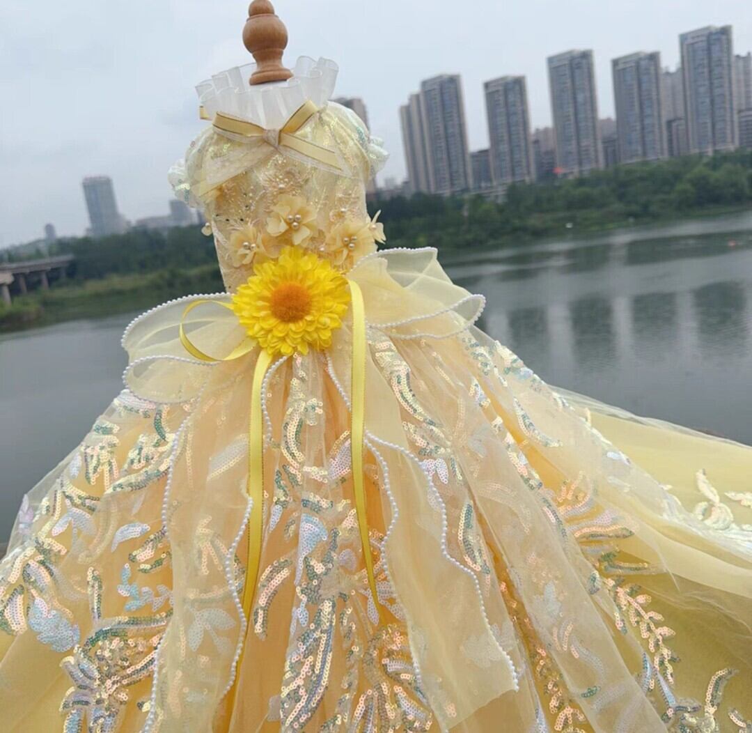 お花の付いたリボンと刺繍が素敵な黄色のロングドレス♡